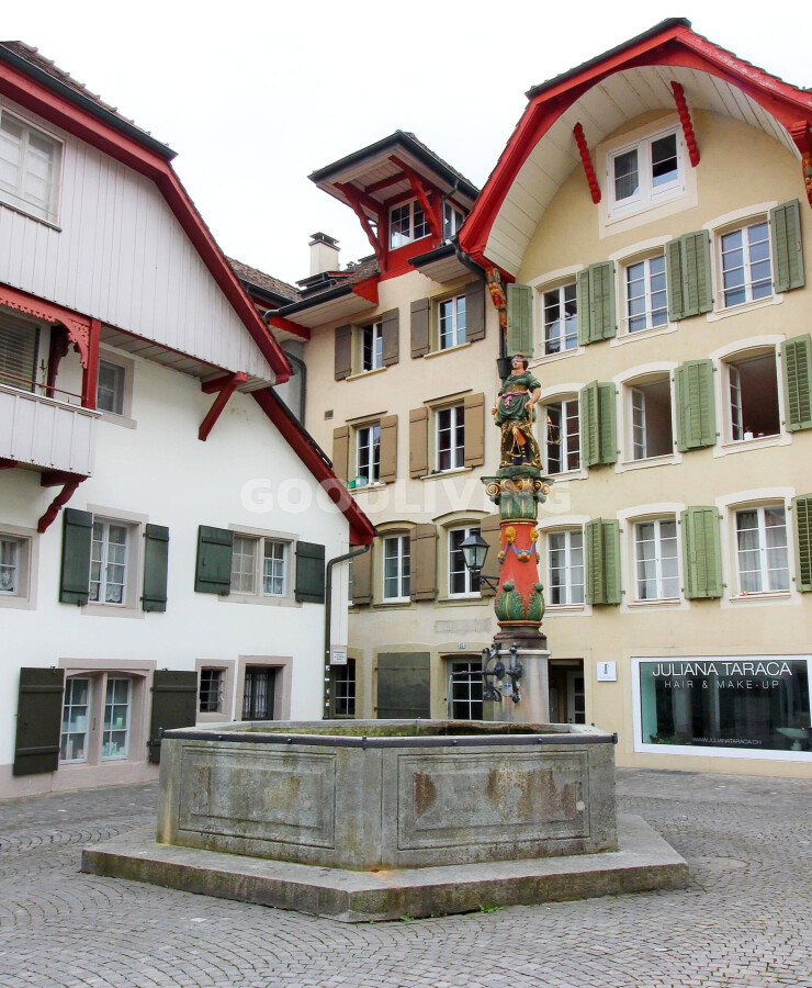 Mitten in der Altstadt von Aarau, direkt neben dem berühmten Gerechtigkeitsbrunnen hinter der Stadtkirche, erhebt sich ein charismatisches, renoviertes Wohn-und Geschäftsgebäude aus dem Jahre 1794.