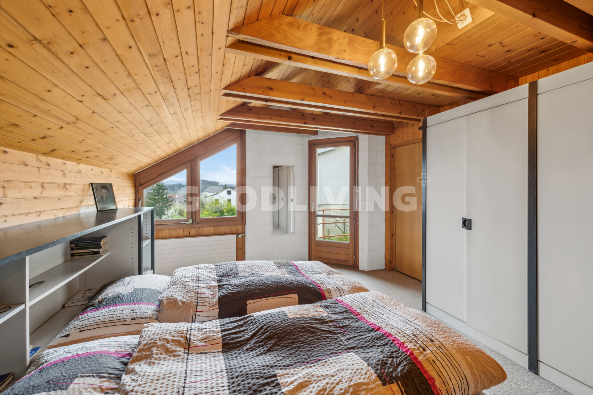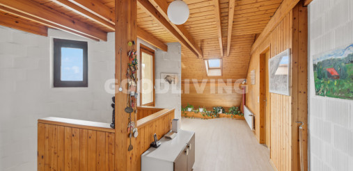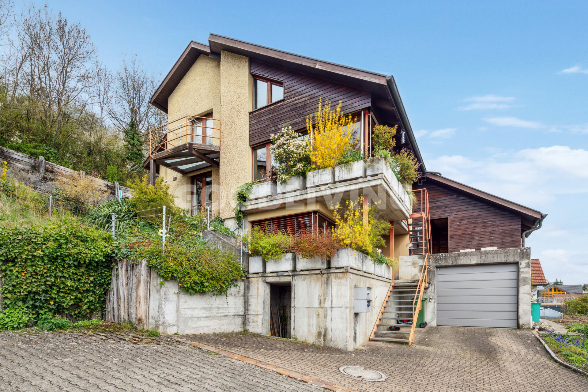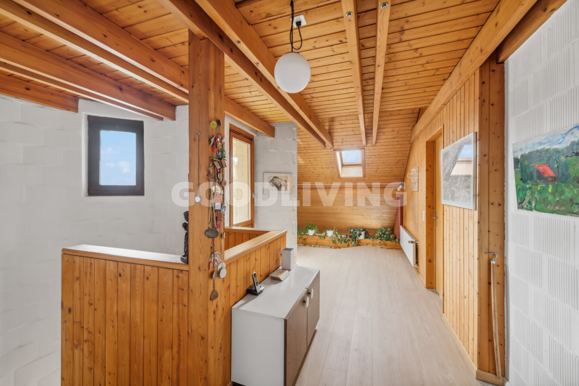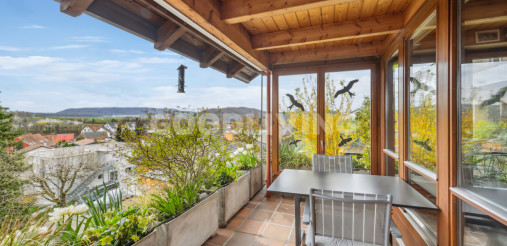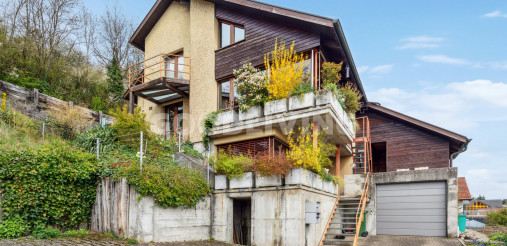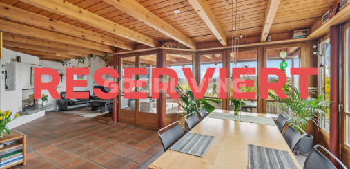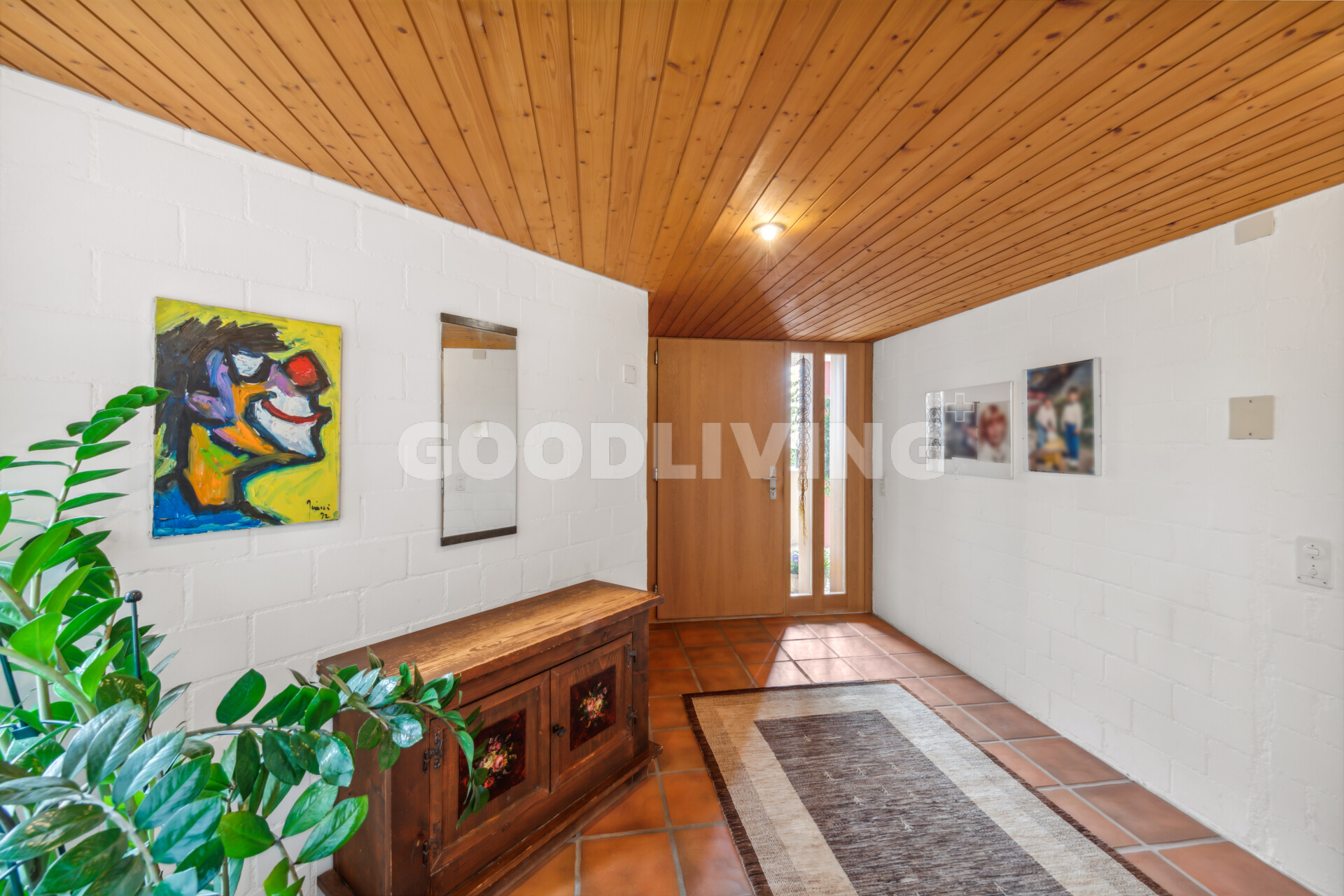 Beim betreten des Hauses wird man von einem grosszügigen Eingangsbereich empfangen, durch welchen man zum einen in die 1-Zimmer Einlieger Wohnung mit Küche und Bad gelangt oder über die geschwungene Treppe in den Hauptwohnbereich.