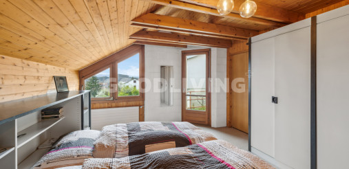 Auf der zweiten Etage erwartet einen die pure Gemütlichkeit. Das Wohnzimmer ist mit seinen hohen Decken, dem rustikalen Holz und der Aussicht auf die Berge der perfekte Ort zur Entspannung. Kühle Winterabende mit einem guten Buch oder einen romantischen Abend mit Rotwein verbringt man am besten vor dem knisternden Kamin.