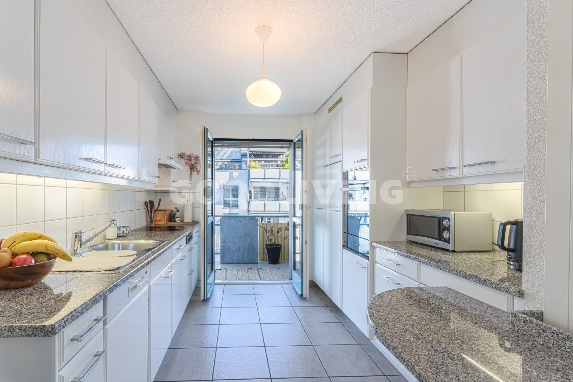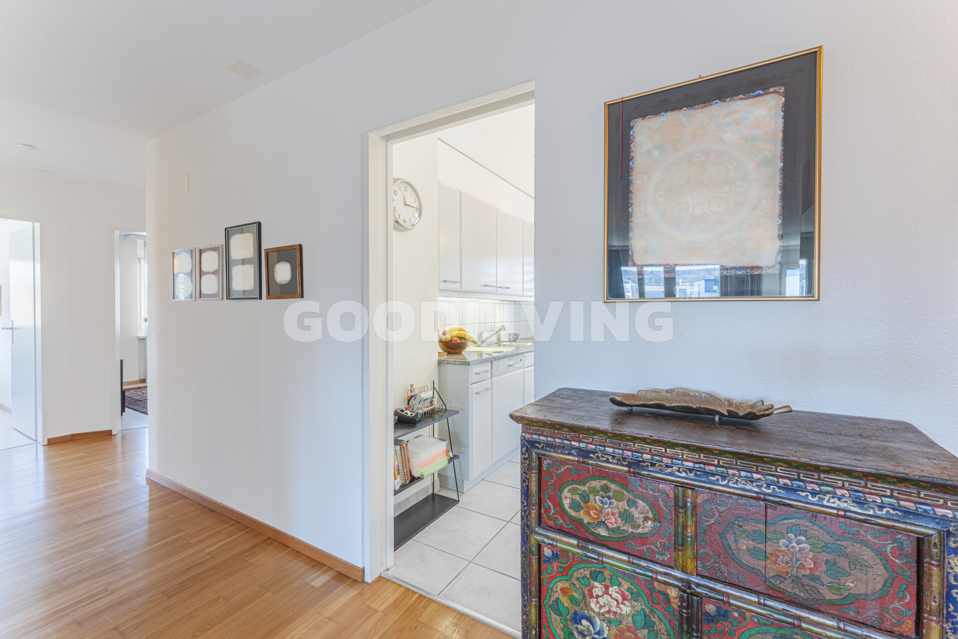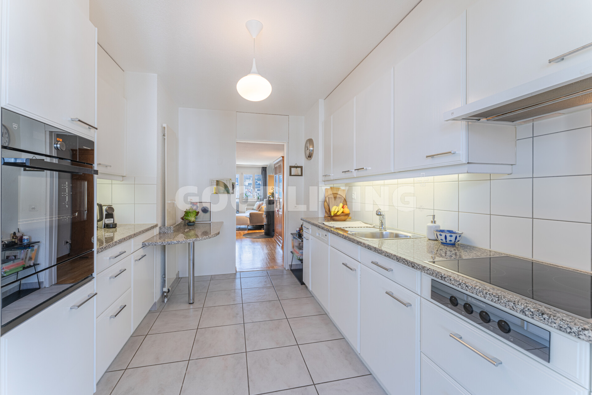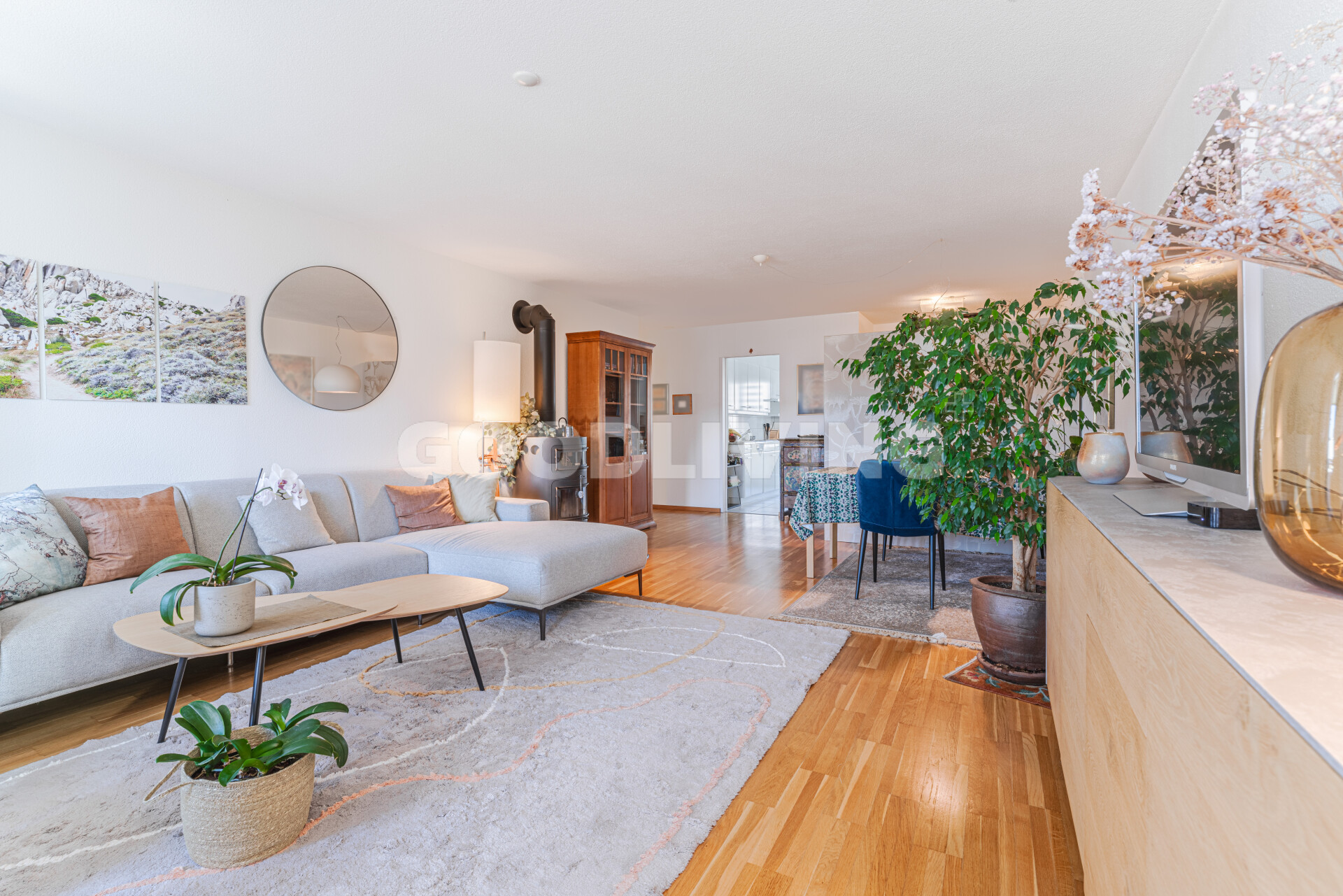 Die sonnenverwöhnte 4½ Zimmerwohnung überzeugt mit einem offenen Grundrisskonzept und profitiert von einer sehr zentrumsnahen Lage. Vom Eingangsbereich aus gelangt man in das offene Wohn- und Esszimmer mit grossen Fensterflächen (alle Holz-Metall-Fenster mit Wärme- und Schallschutz). Der Eyecatcher ist der hochwertige Schwedenofen, der für ein schönes Ambiente sorgt. Der Eichenparkettboden im Wohnzimmer, Eingang- und Korridorbereich strahlt eine wohlige Wärme aus. In den Schlafzimmern wurde ein Laminatboden (2017) und in den Nasszellen sowie in der Küche ein keramischer Plattenboden verlegt. Die praktische Küche mit Granit-Arbeitsplatten ist vollständig ausgerüstet mit einem V-Zug Kombisteamer (2016), Electrolux Glaskeramik Kochfeld (2016), Electrolux Kühlschrank (2013) mit integriertem Tiefkühlfach, Geschirrspüler (2014) und neuem Electrolux Dampfabzug (2024). Der östlich ausgerichtete Balkon ist von der Küche und der westlich ausgerichteter Balkon ist über das Wohn und Schlafzimmer 3 aus begehbar. Grosszügige Einbauschränke befinden sich im Korridor.