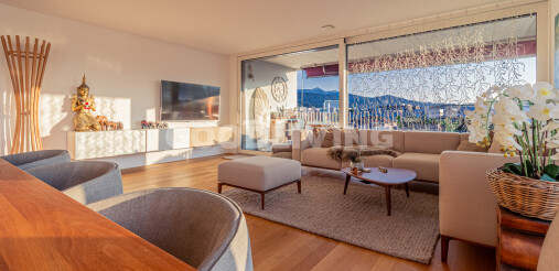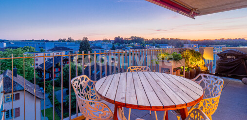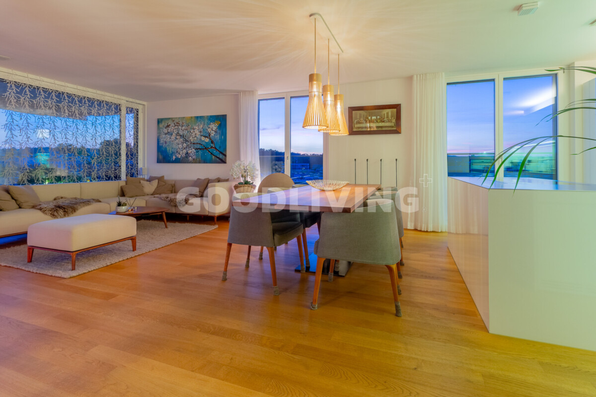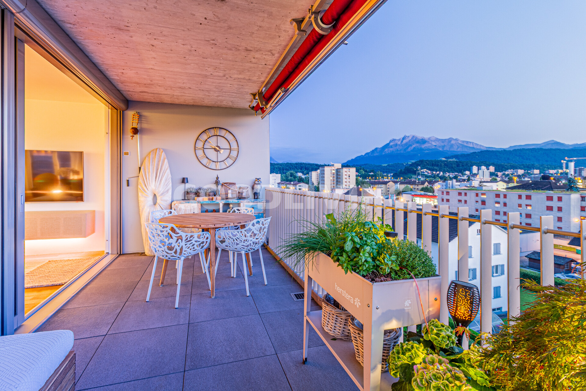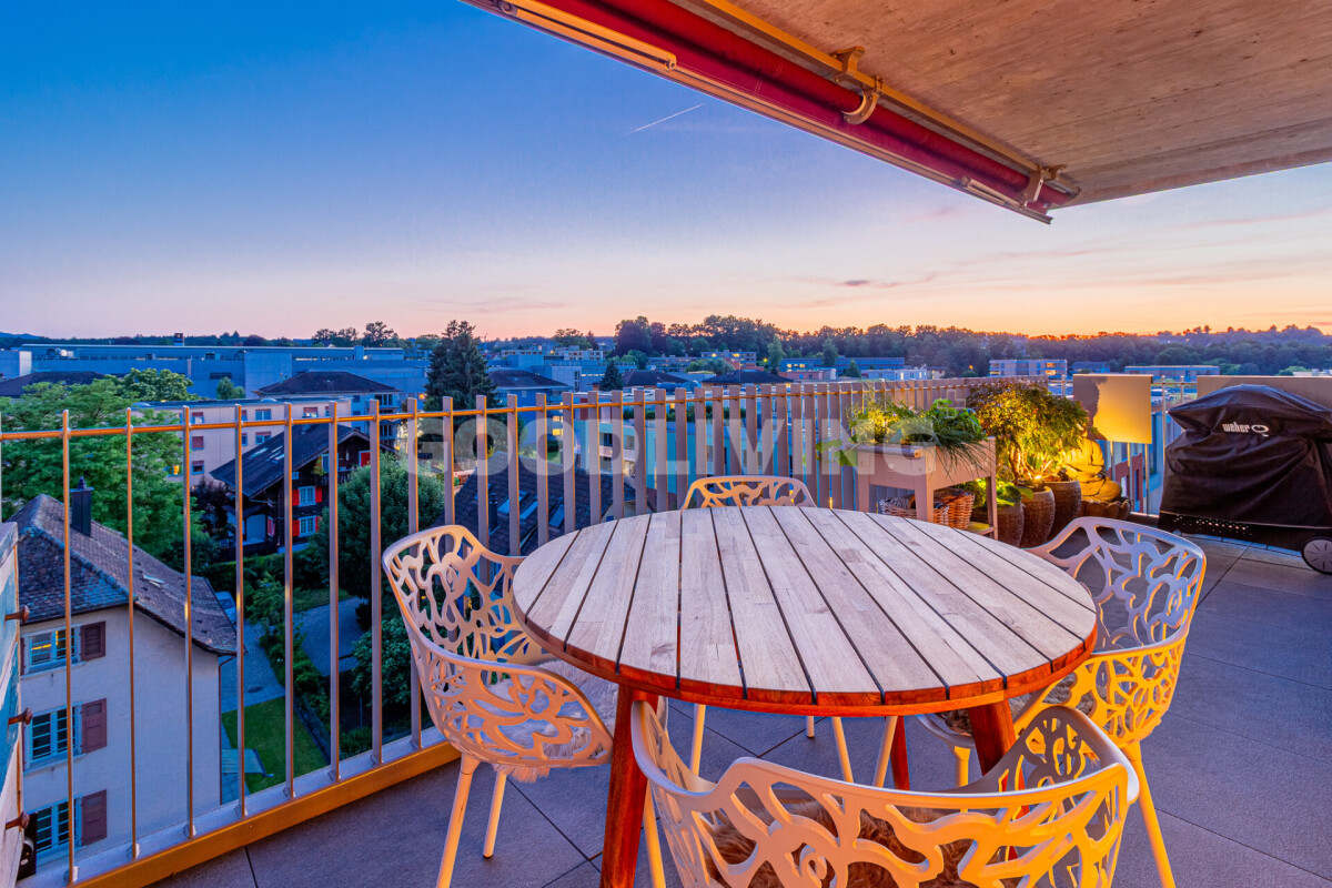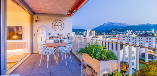 Die westlich ausgerichtete Terrasse eröffnet einen atemberaubenden Blick bis zum Pilatus. Perfekt, um den Sonnenuntergang in aller Ruhe zu geniessen und die Weitsicht auf sich wirken zu lassen.