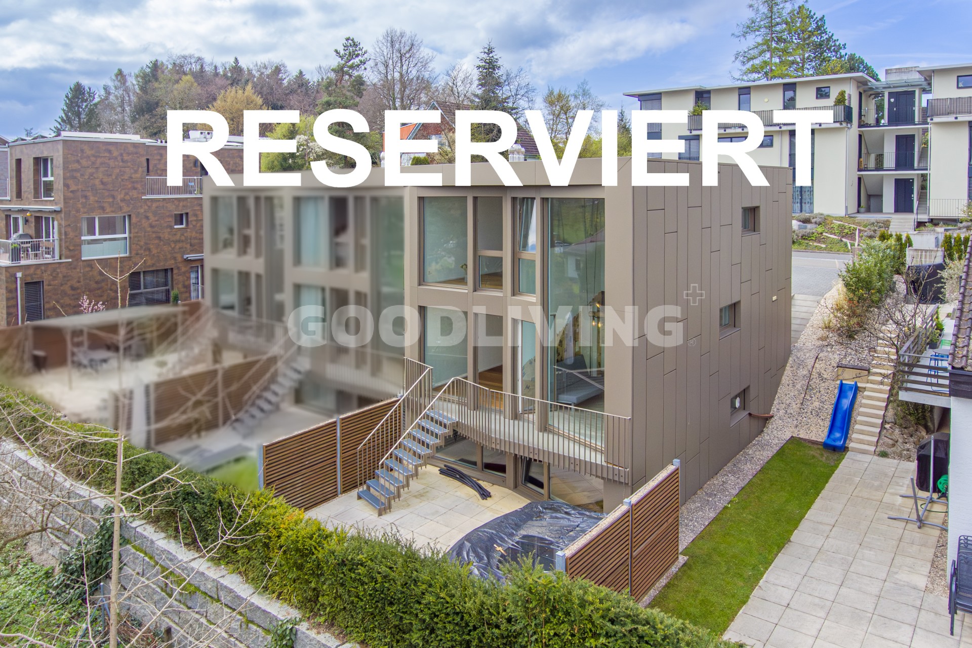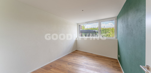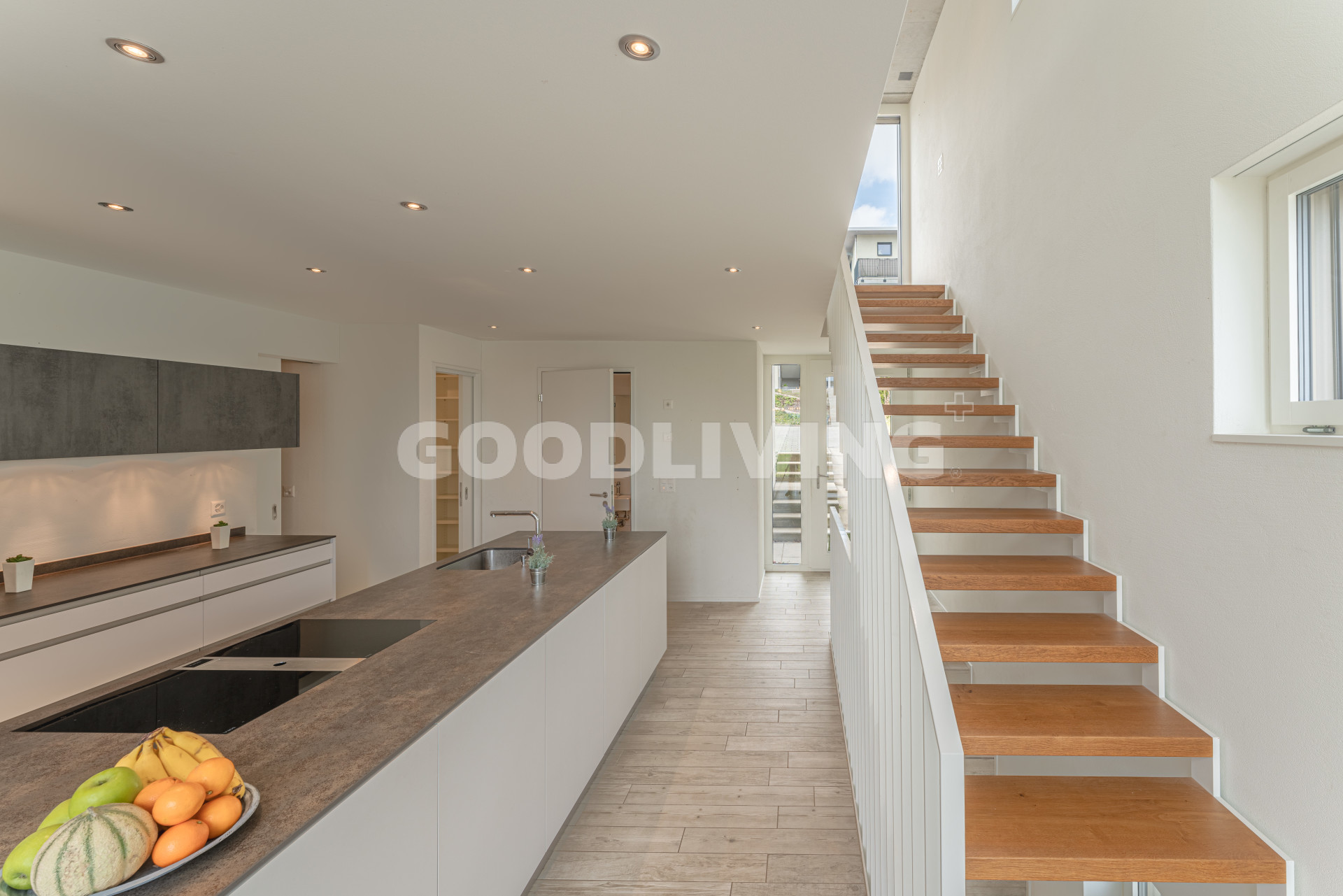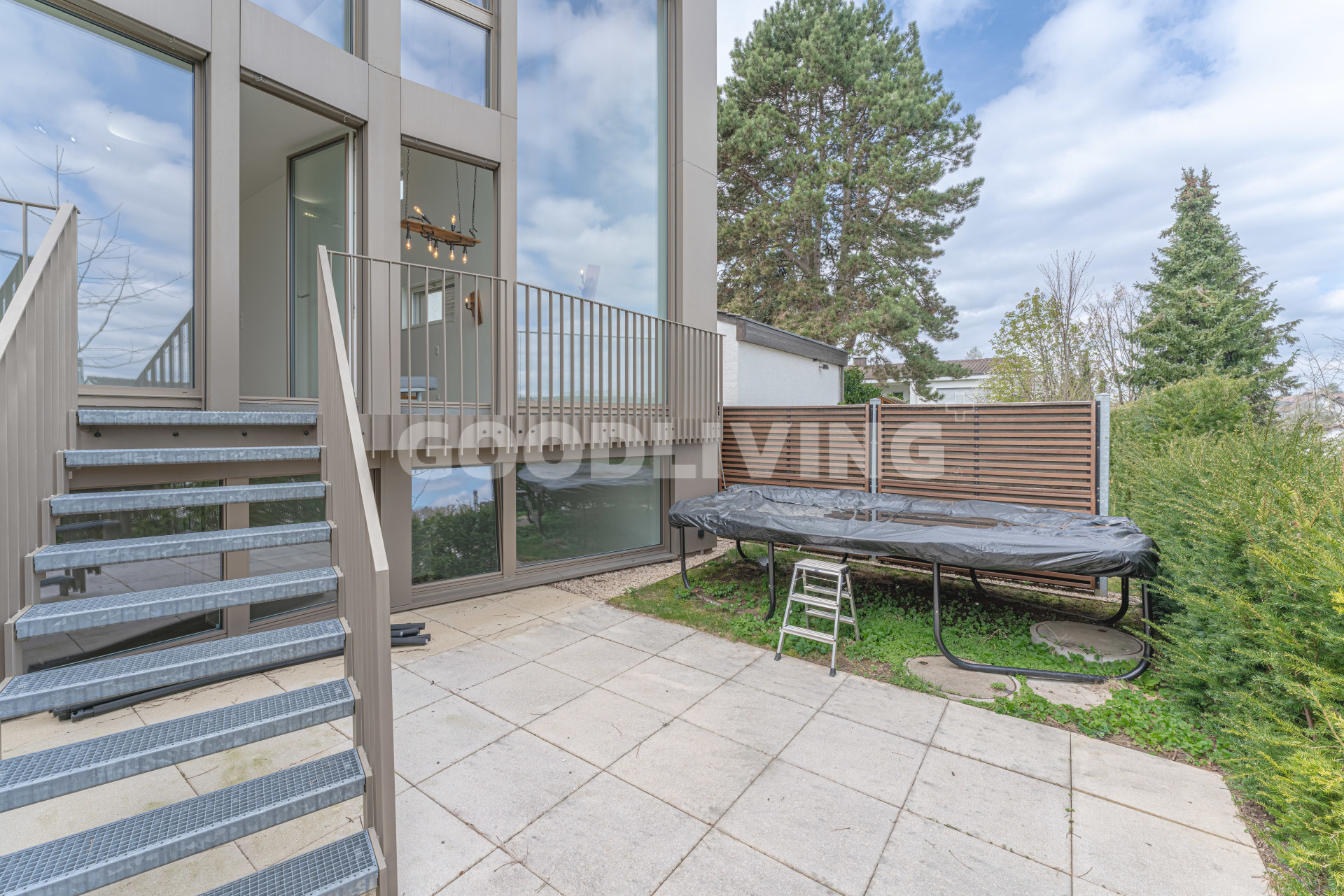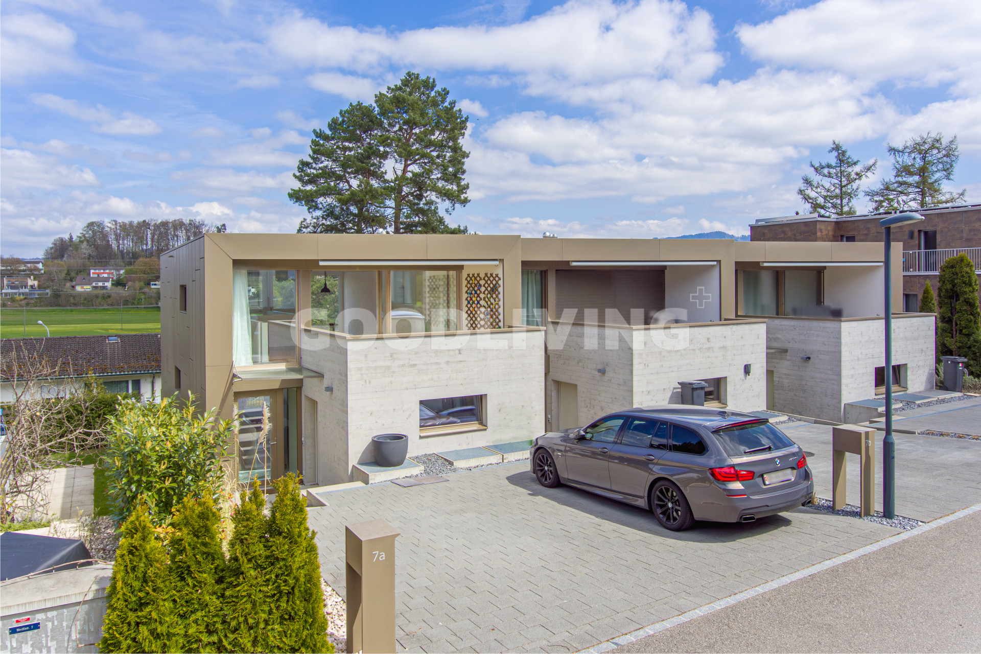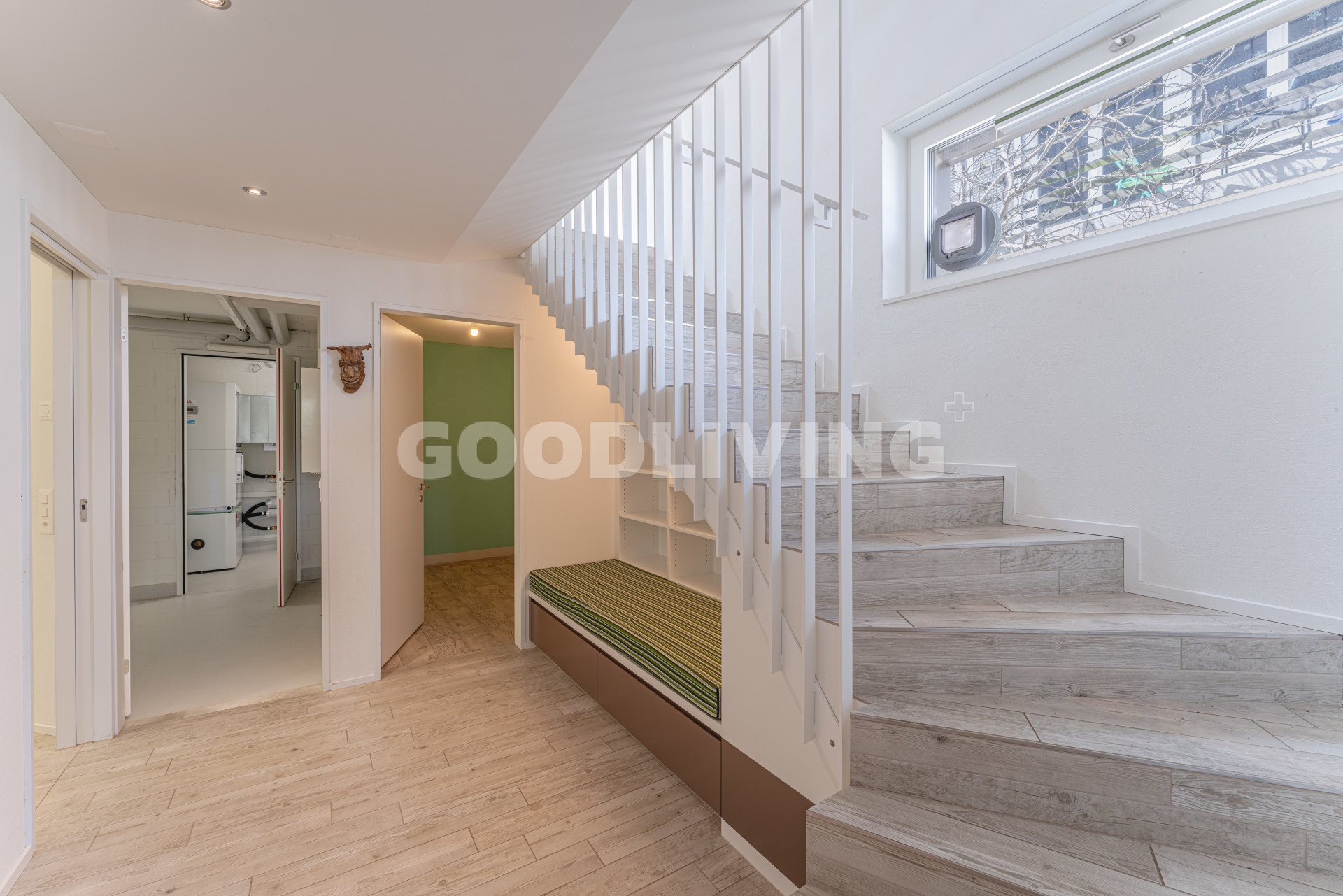Das moderne 4½ Zimmer Reiheneckhaus erstreckt sich über drei Stockwerke. Vom Eingangsbereich aus fällt die ganzflächige Fensterfront mit einer Gesamthöhe von 5.20m sofort auf, welche die Räume mit viel natürlichem Tageslicht verwöhnt (alle Holz-Metall-Fenster sind dreifach isolierverglast). Des weiteren wurden hochwertige keramische Bodenplatten in Holzoptik in allen Räumen (ausser Wohn- und Schlafzimmer) verlegt- in den Zimmern / Wohnzimmer ein Landhausdielen Eichenparkett. Die moderne Küche mit Neolith Arbeitsplatten punktet klar mit einer Bora Induktionskochfeld, integriertem Bora Abzug (ins Freie), Dampfbackofen sowie Geschirrspüler (alles Siemens Geräte) und harmoniert perfekt mit dem Innendesign. Über das Esszimmer gelangt man auf den kleinen nordwestlich ausgerichteten Balkon, welcher direkt zum Gartensitzplatz (57m²) führt. Zwei Trennwände sorgen im Aussenbereich für den nötigen Sichtschutz zu den beiden Nachbarseiten. Das Unter- und Obergeschoss ist bequem über die Treppe erreichbar. Ein Zimmer, der Vorratsraum, das Reduit (begehbare Garderobe) und die DU/WC runden diese Ebene ab.