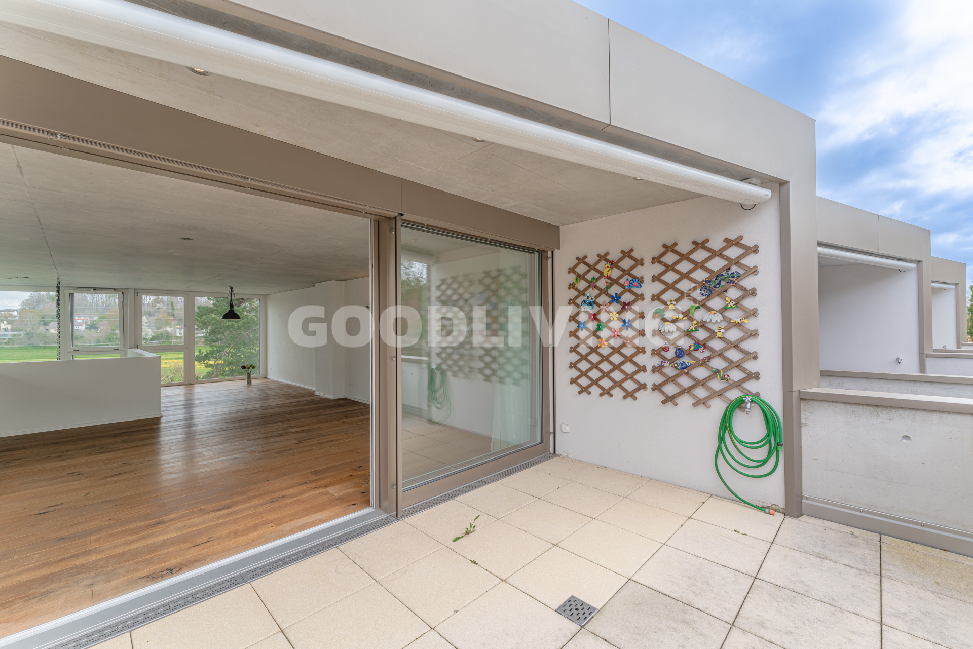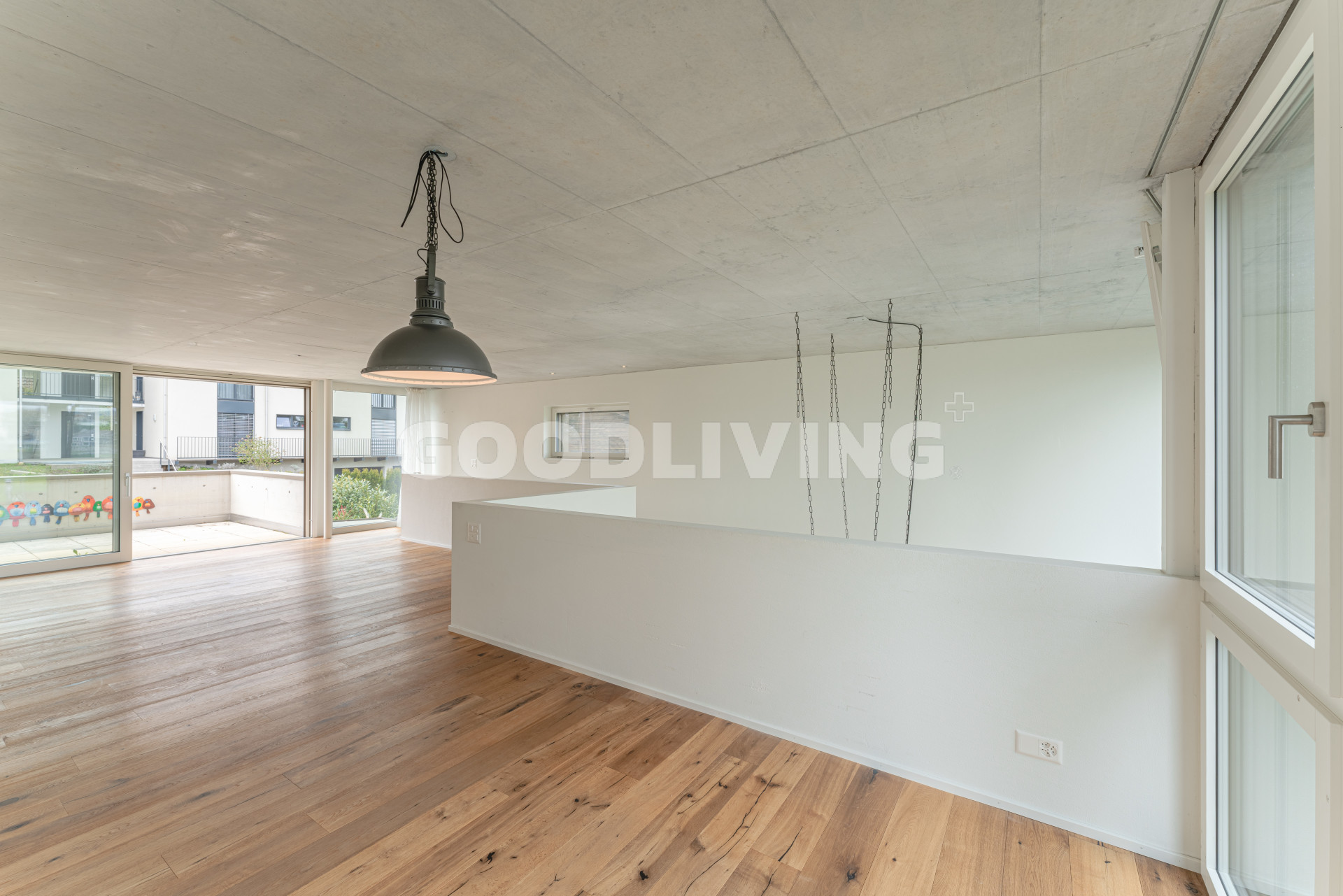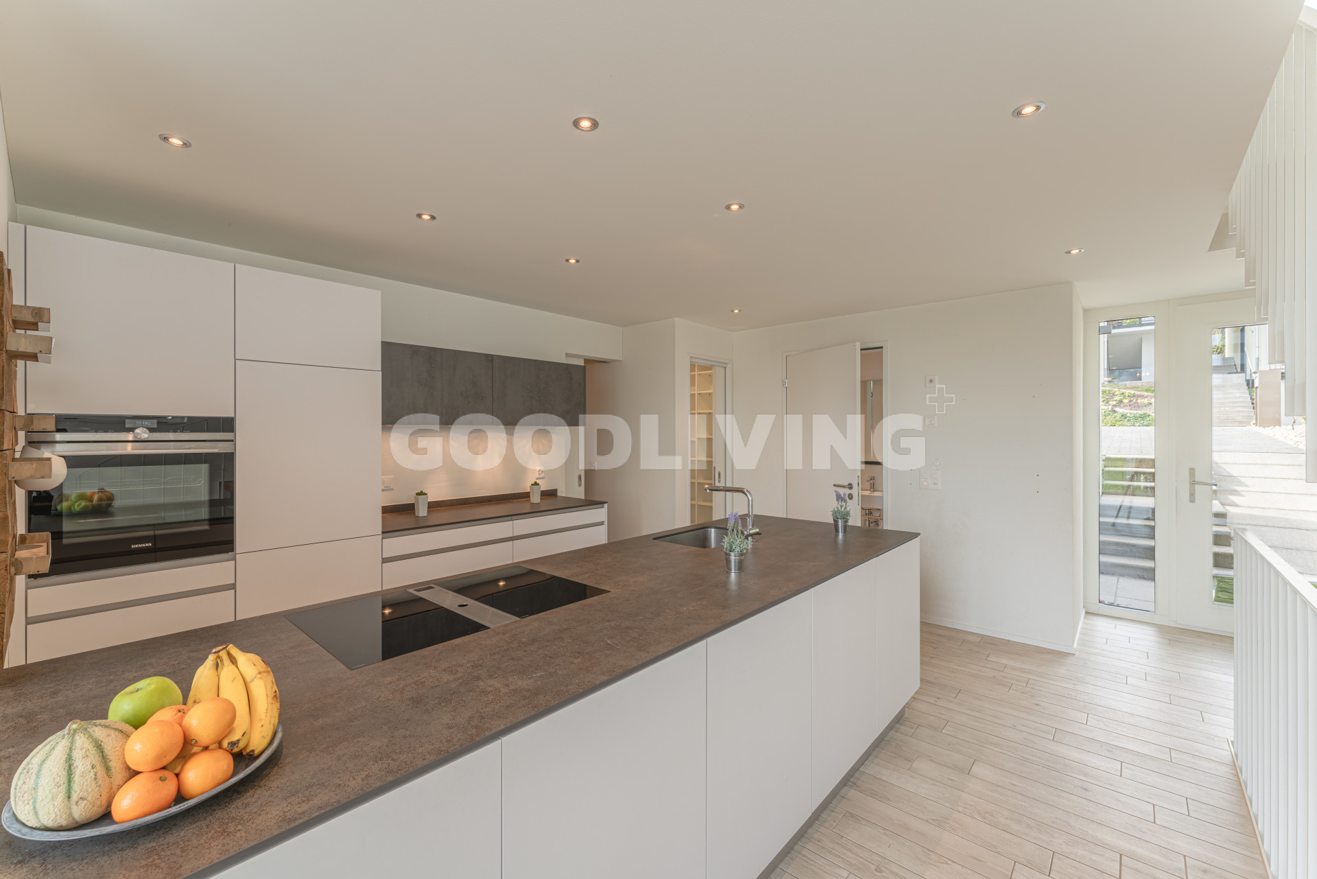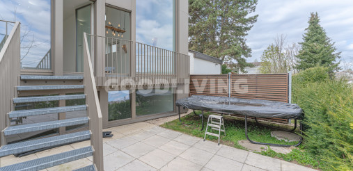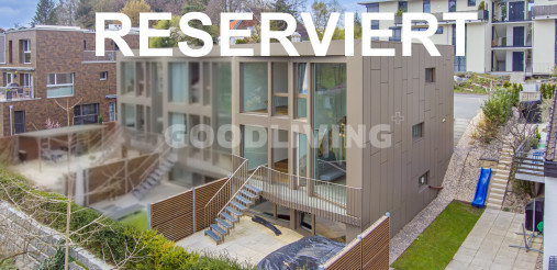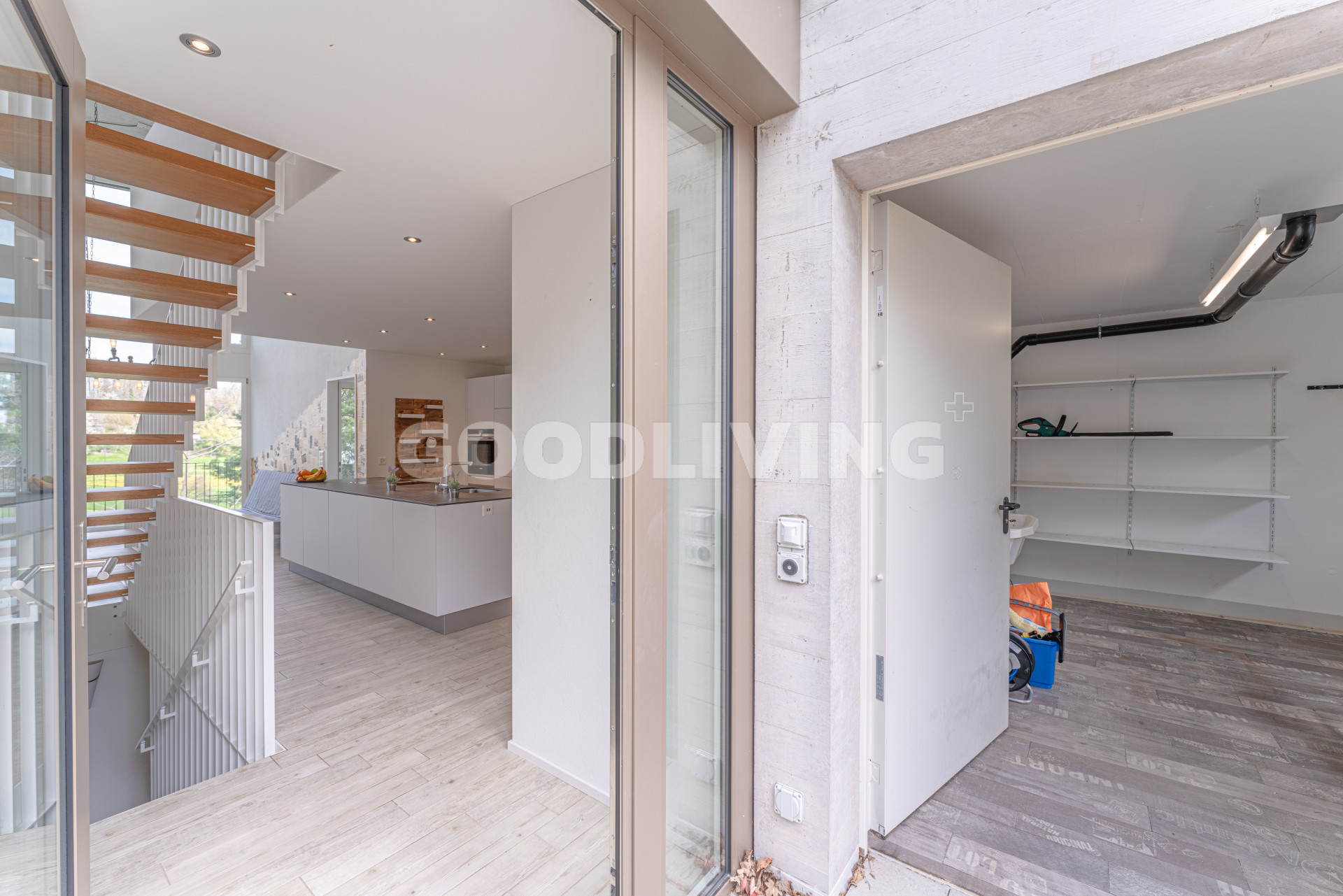 Das moderne 4½ Zimmer Reiheneckhaus erstreckt sich über drei Stockwerke. Vom Eingangsbereich aus fällt die ganzflächige Fensterfront mit einer Gesamthöhe von 5.20m sofort auf, welche die Räume mit viel natürlichem Tageslicht verwöhnt (alle Holz-Metall-Fenster sind dreifach isolierverglast). Des weiteren wurden hochwertige keramische Bodenplatten in Holzoptik in allen Räumen (ausser Wohn- und Schlafzimmer) verlegt- in den Zimmern / Wohnzimmer ein Landhausdielen Eichenparkett. Die moderne Küche mit Neolith Arbeitsplatten punktet klar mit einer Bora Induktionskochfeld, integriertem Bora Abzug (ins Freie), Dampfbackofen sowie Geschirrspüler (alles Siemens Geräte) und harmoniert perfekt mit dem Innendesign. Über das Esszimmer gelangt man auf den kleinen nordwestlich ausgerichteten Balkon, welcher direkt zum Gartensitzplatz (57m²) führt. Zwei Trennwände sorgen im Aussenbereich für den nötigen Sichtschutz zu den beiden Nachbarseiten. Das Unter- und Obergeschoss ist bequem über die Treppe erreichbar. Ein Zimmer, der Vorratsraum, das Reduit (begehbare Garderobe) und die DU/WC runden diese Ebene ab.