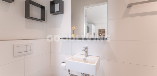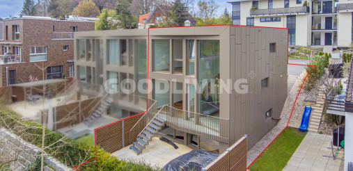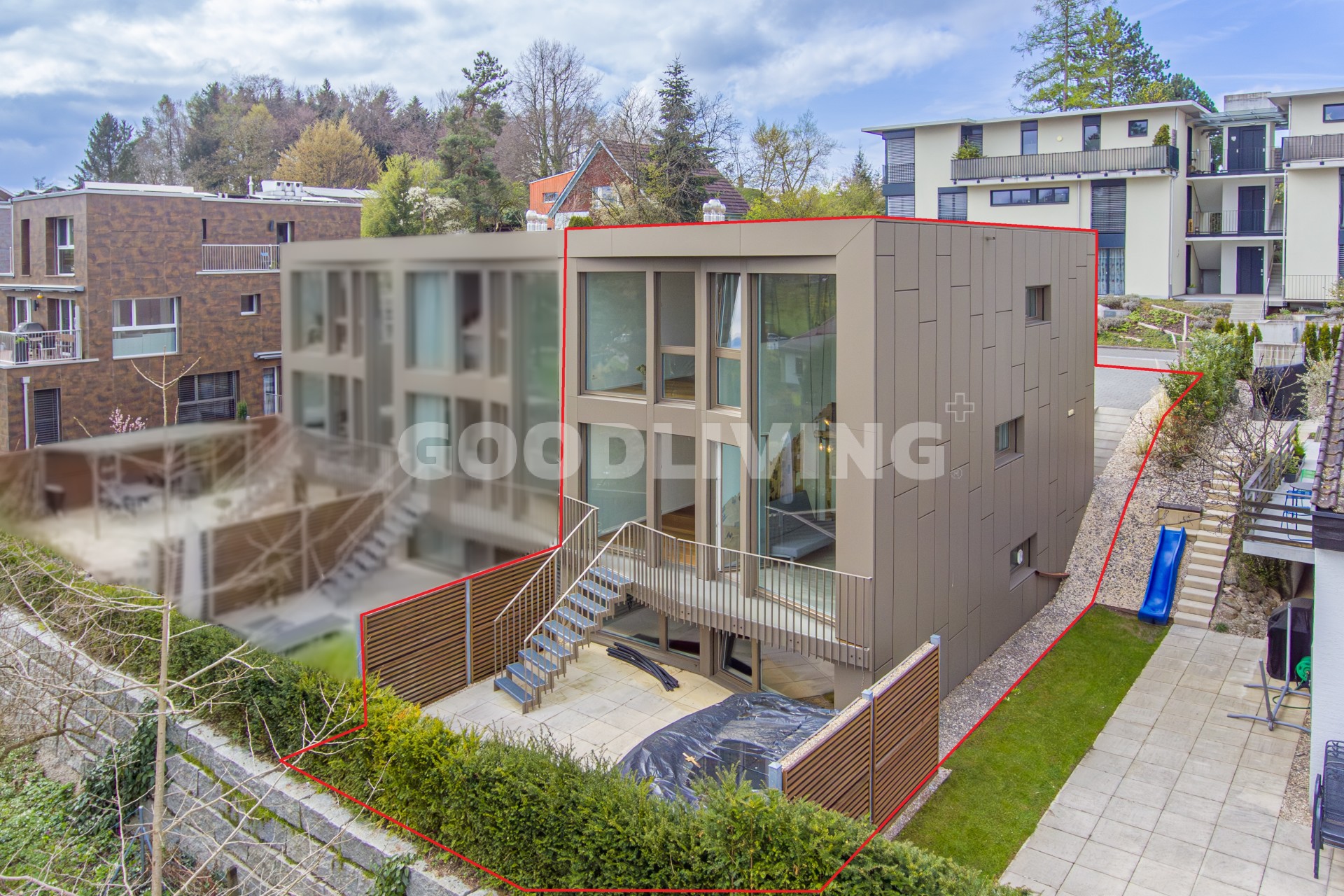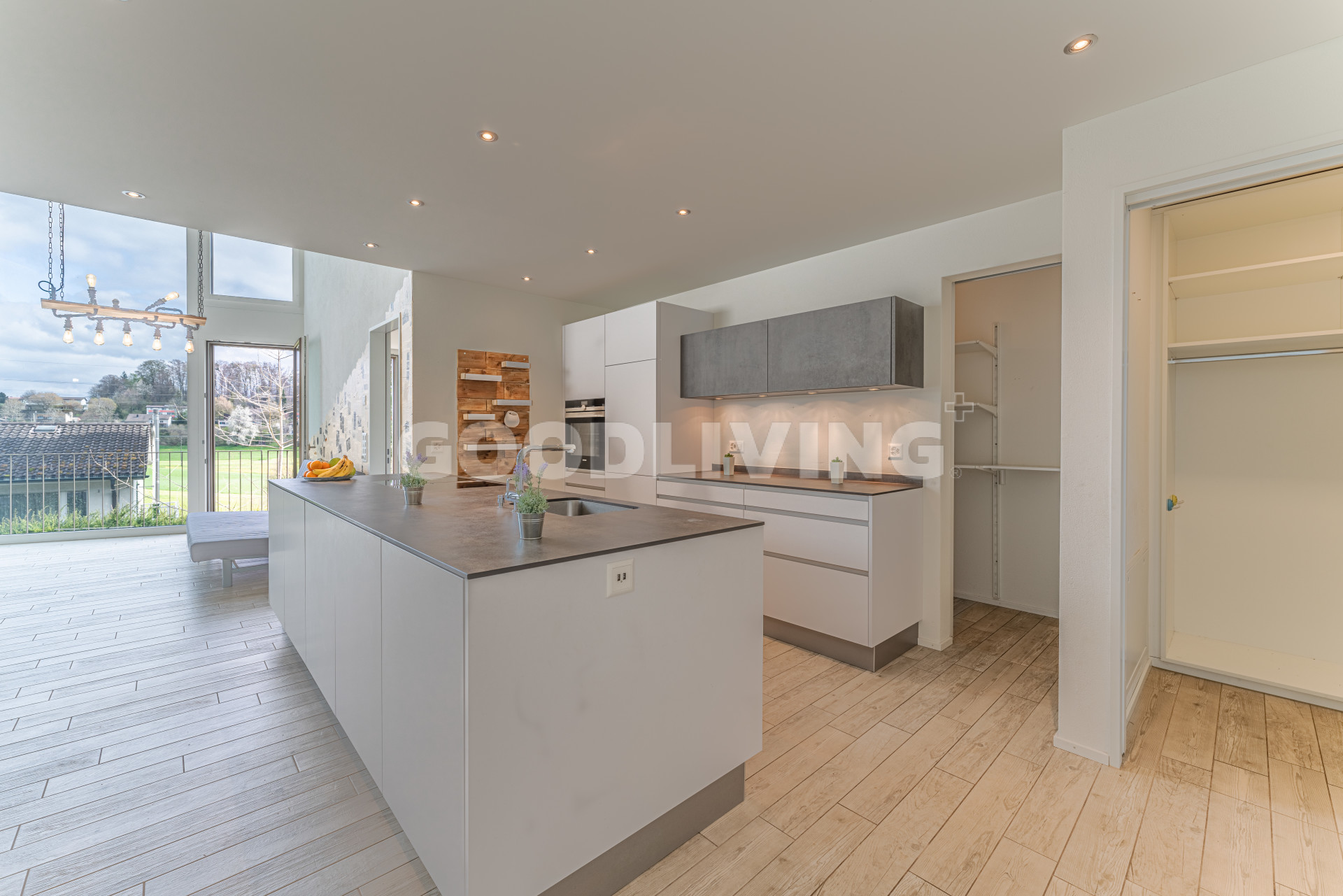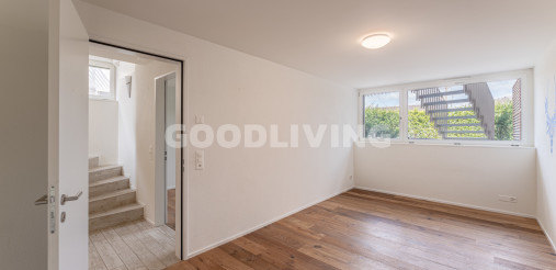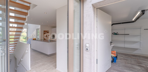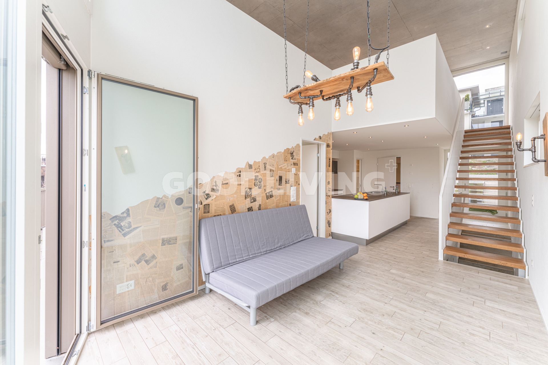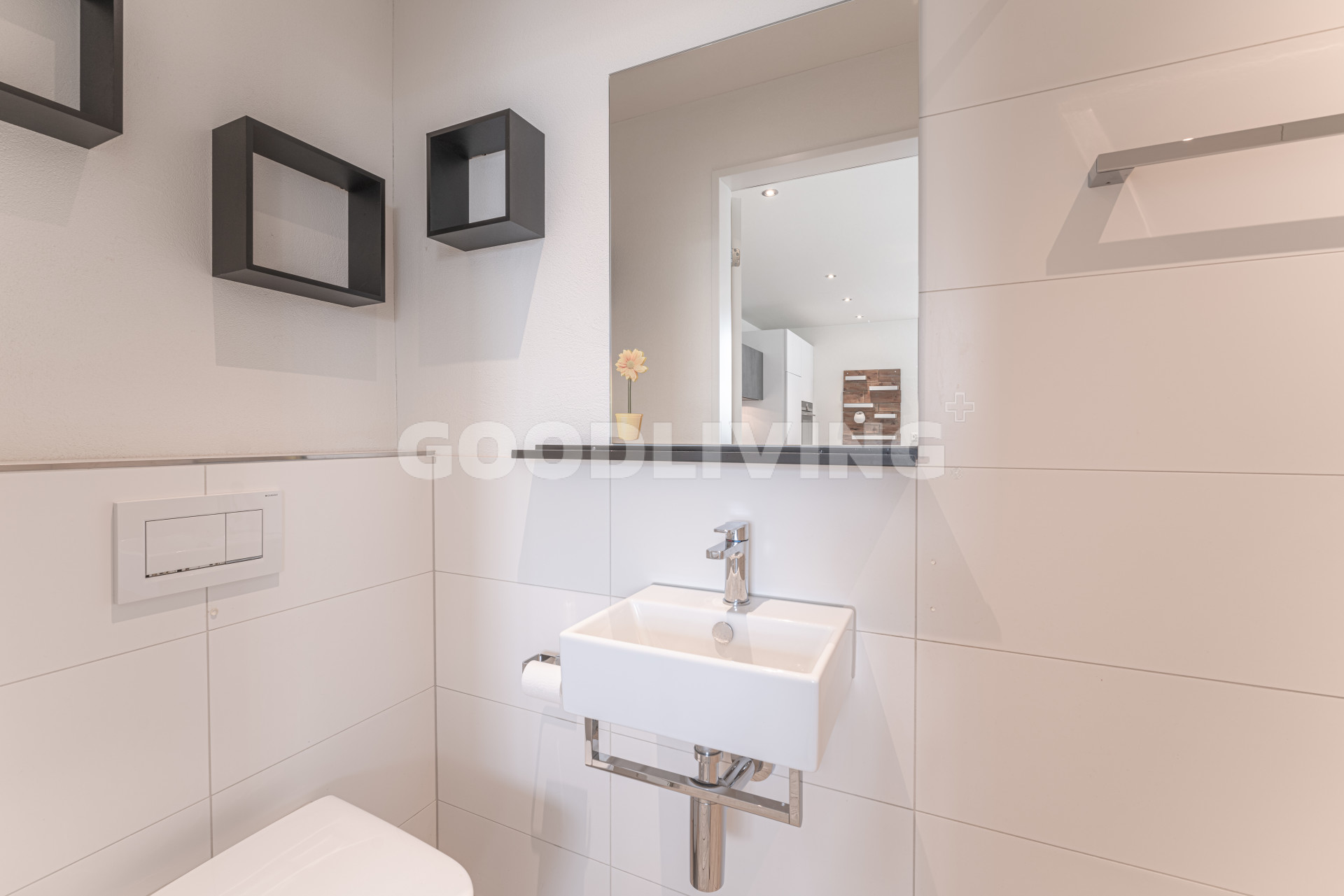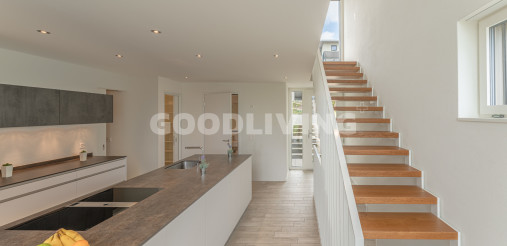 Das moderne 4½ Zimmer Reiheneckhaus erstreckt sich über drei Stockwerke. Vom Eingangsbereich aus fällt die ganzflächige Fensterfront mit einer Gesamthöhe von 5.20m sofort auf, welche die Räume mit viel natürlichem Tageslicht verwöhnt (alle Holz-Metall-Fenster sind dreifach isolierverglast). Des weiteren wurden hochwertige keramische Bodenplatten in Holzoptik in allen Räumen (ausser Wohn- und Schlafzimmer) verlegt- in den Zimmern / Wohnzimmer ein Landhausdielen Eichenparkett. Die moderne Küche mit Neolith Arbeitsplatten punktet klar mit einer Bora Induktionskochfeld, integriertem Bora Abzug (ins Freie), Dampfbackofen sowie Geschirrspüler (alles Siemens Geräte) und harmoniert perfekt mit dem Innendesign. Über das Esszimmer gelangt man auf den kleinen nordwestlich ausgerichteten Balkon, welcher direkt zum Gartensitzplatz (57m²) führt. Zwei Trennwände sorgen im Aussenbereich für den nötigen Sichtschutz zu den beiden Nachbarseiten. Das Unter- und Obergeschoss ist bequem über die Treppe erreichbar. Ein Zimmer, der Vorratsraum, das Reduit (begehbare Garderobe) und die DU/WC runden diese Ebene ab.