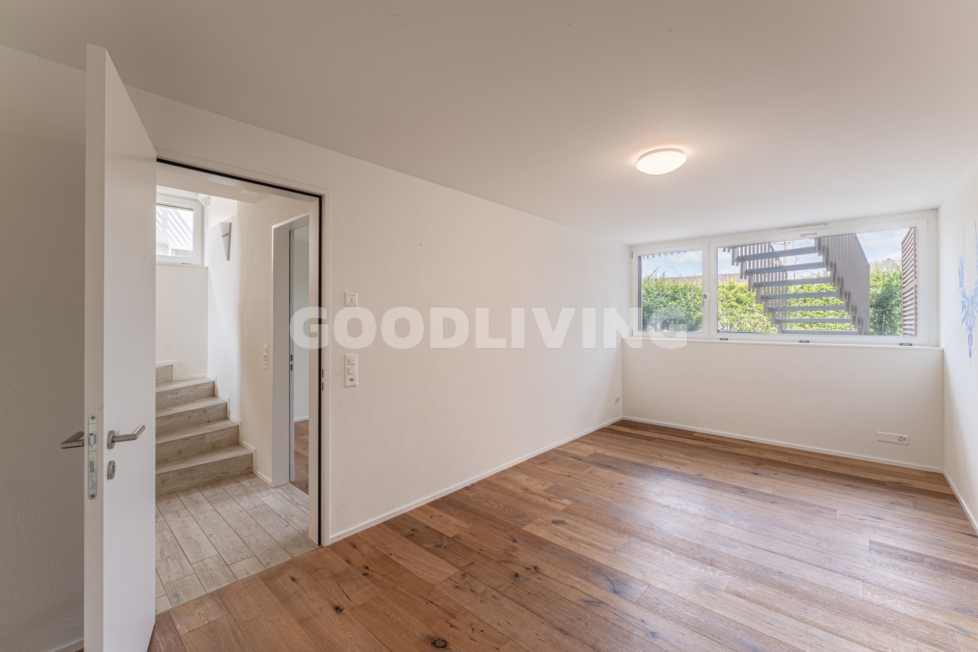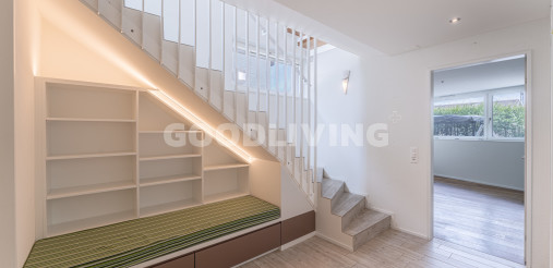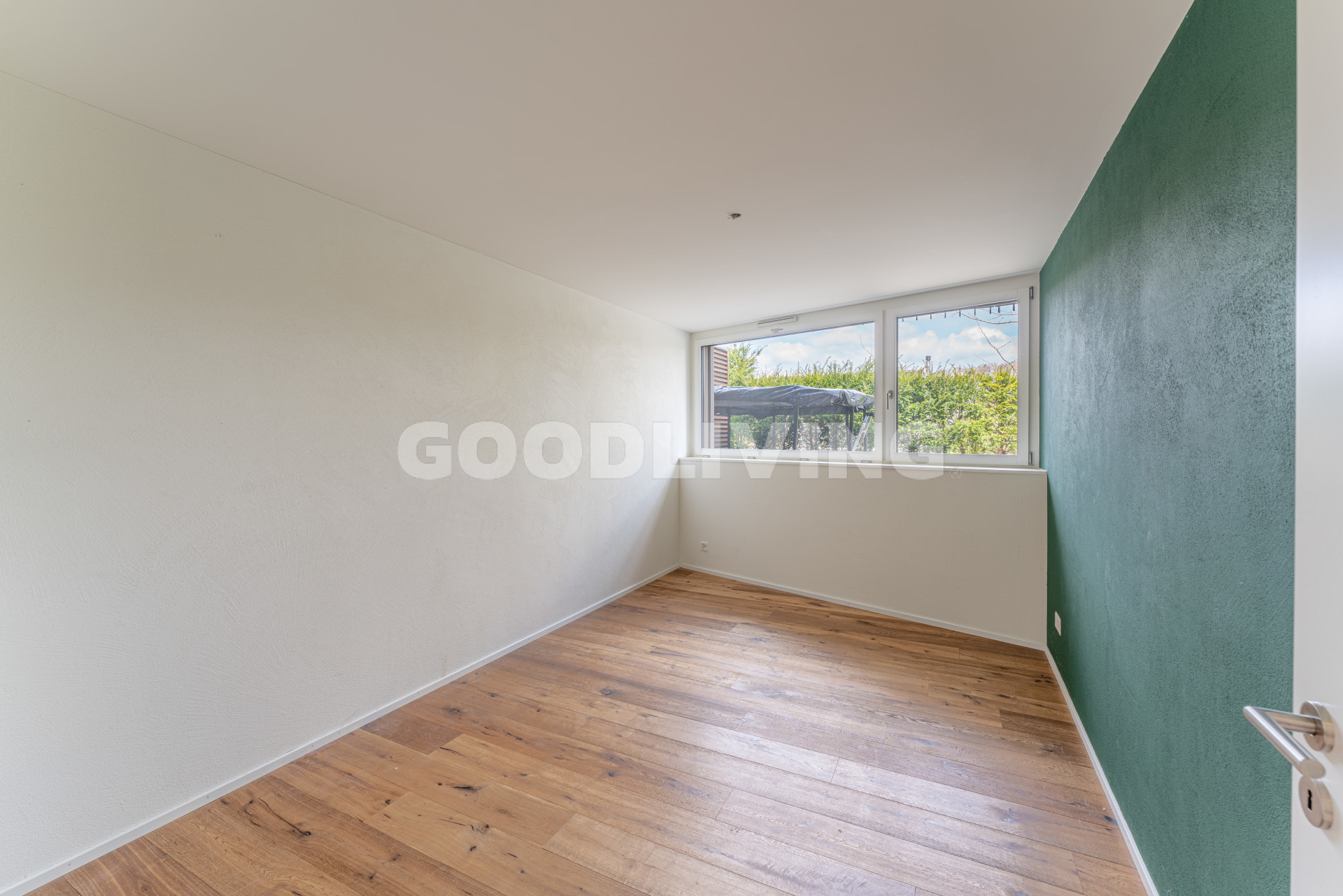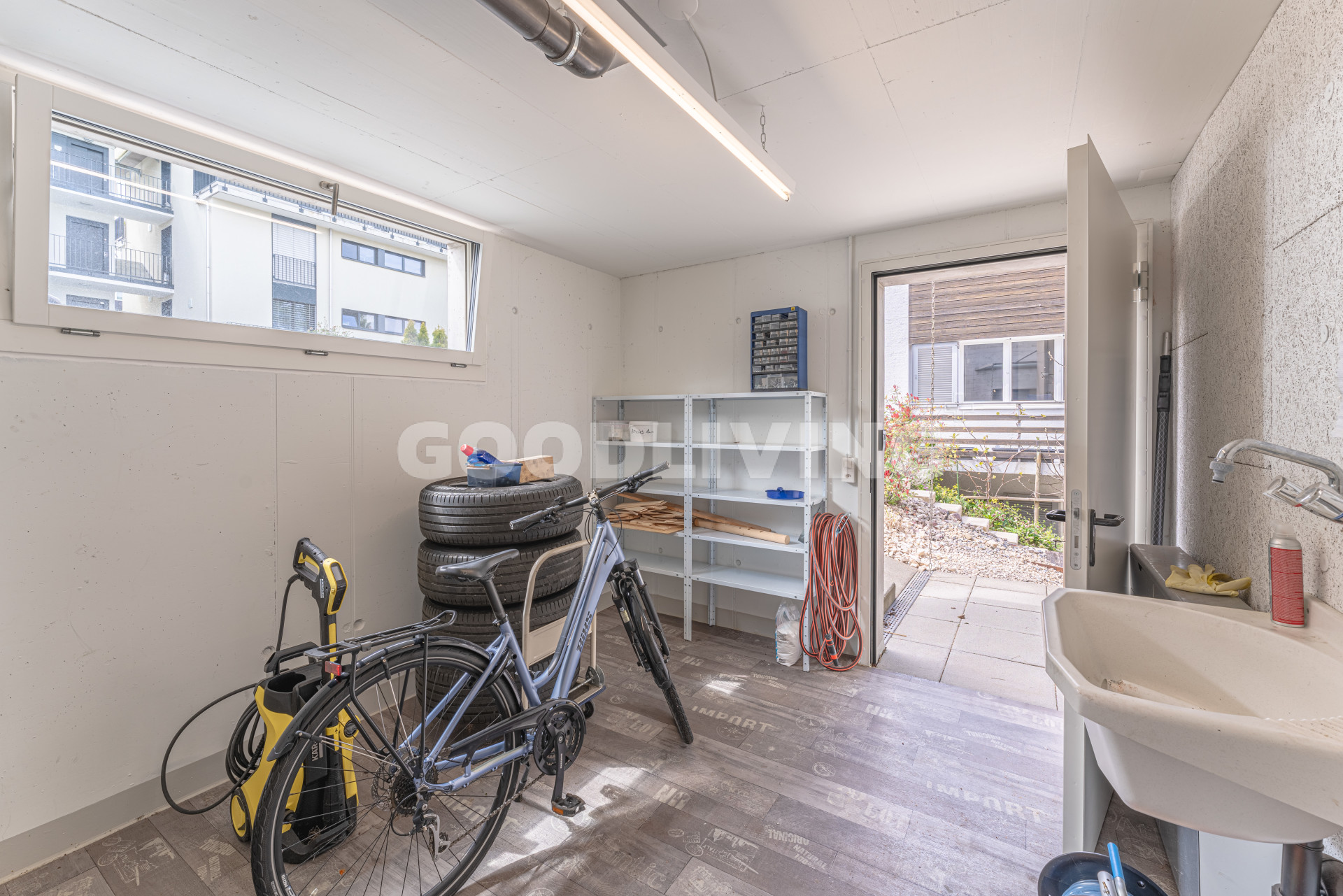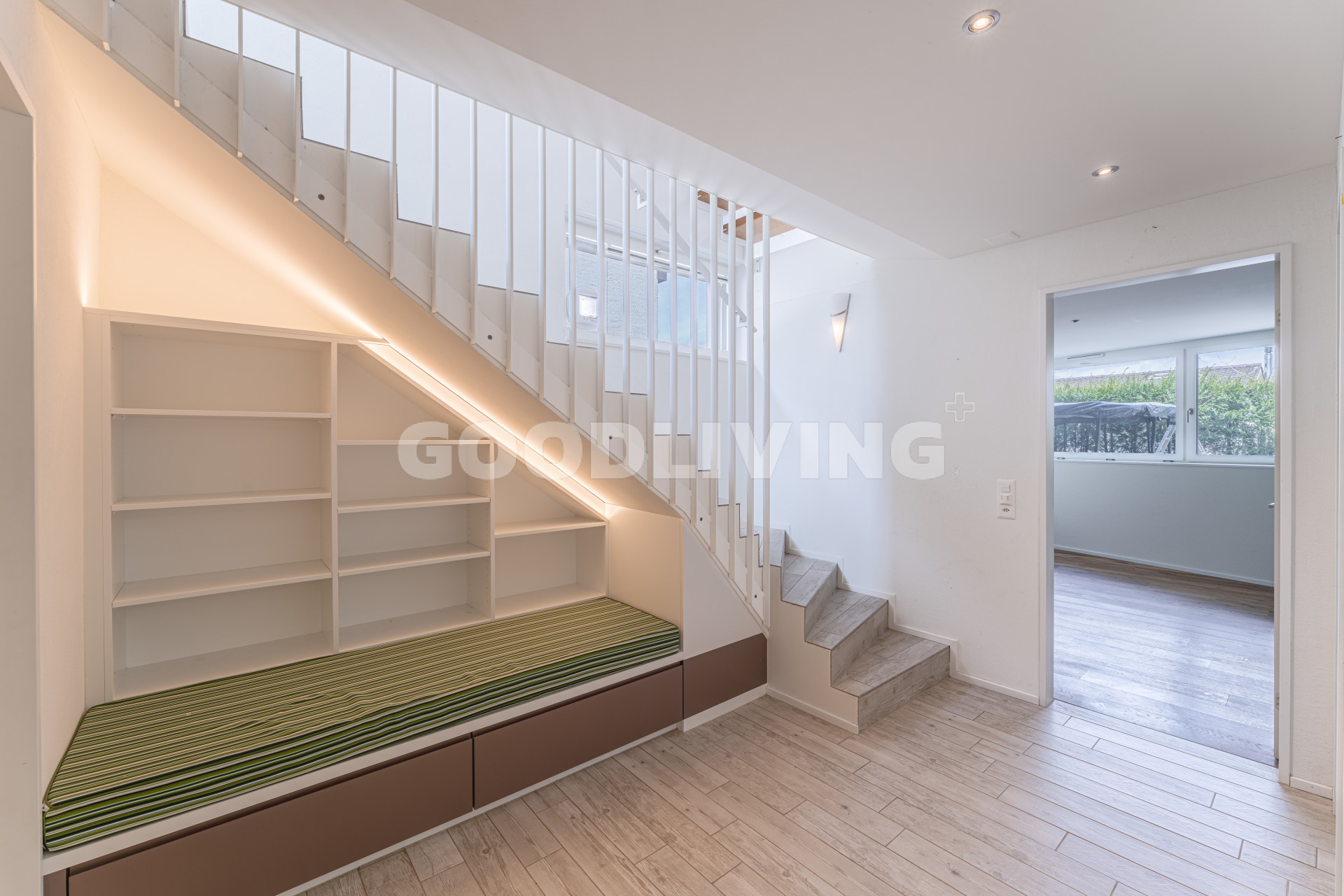 Das Reiheneckhaus liegt in einem familienfreundlichen Quartier (Sackgasse), hat ein Zimmer im Erdgeschoss, zwei im Untergeschoss und wurde im Jahre 2016 erstellt. Unter der Treppe im Untergeschoss wurde im 2020 liebevoll eine Leseecke mit integriertem Stauraum errichtet. Dabei verbreitet die indirekte LED Beleuchtung ein angenehmes Licht und macht richtig Lust zum Lesen. Die Ankleide / Hobbyraum, der Waschraum, der Heizungsraum, die Nasszelle mit Bad / WC und Regendusche befinden sich ebenfalls im Untergeschoss. Alle Räume sind zudem bodenbeheizt und können einzeln reguliert werden. Die Luft-Wärmepumpe ist zusätzlich für das Aufbereiten des Warmwassers verantwortlich. Der grosse Veloraum bietet ebenfalls viel Stauraum. Sämtliche Lamellenstoren sowie die Markise sind elektrisch regulierbar und tragen zur wohnlichen Lebensqualität bei. Entspannte Momente geniesst man am besten auf dem Gartensitzplatz, im grossräumigen Wohnzimmer oder auf dem südwestlich ausgerichteten Balkon.