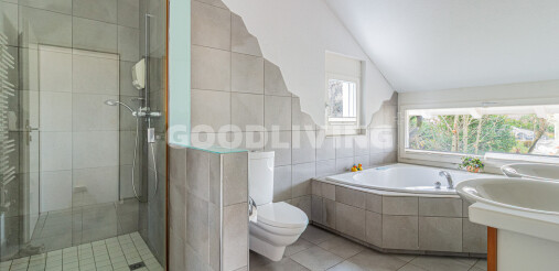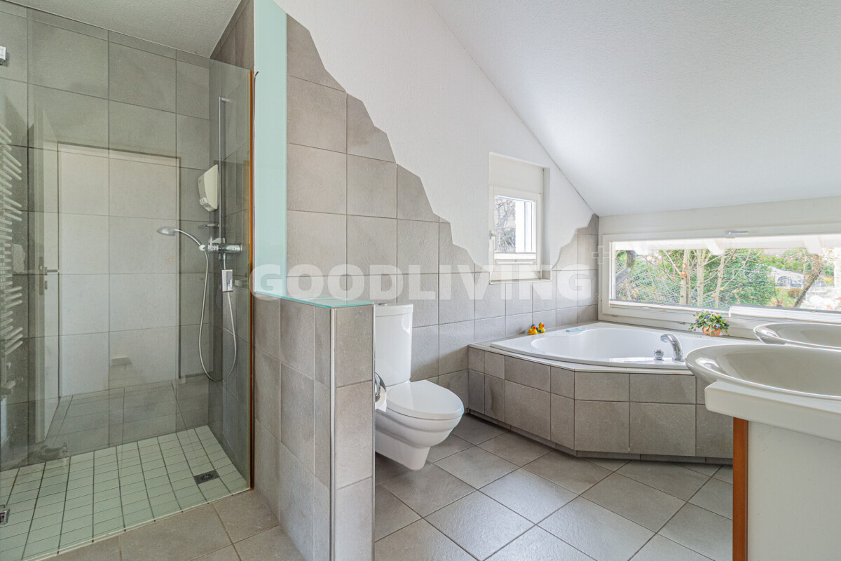 Mit vier Schlafzimmern, darunter ein Zimmer mit begehbarem Kleiderschrank, sowie zwei stilvollen Badezimmern (Dusche/WC und Whirlpool/Dusche/WC) bietet das Haus sehr viel Platz für Familienbedürfnisse.