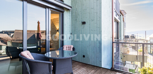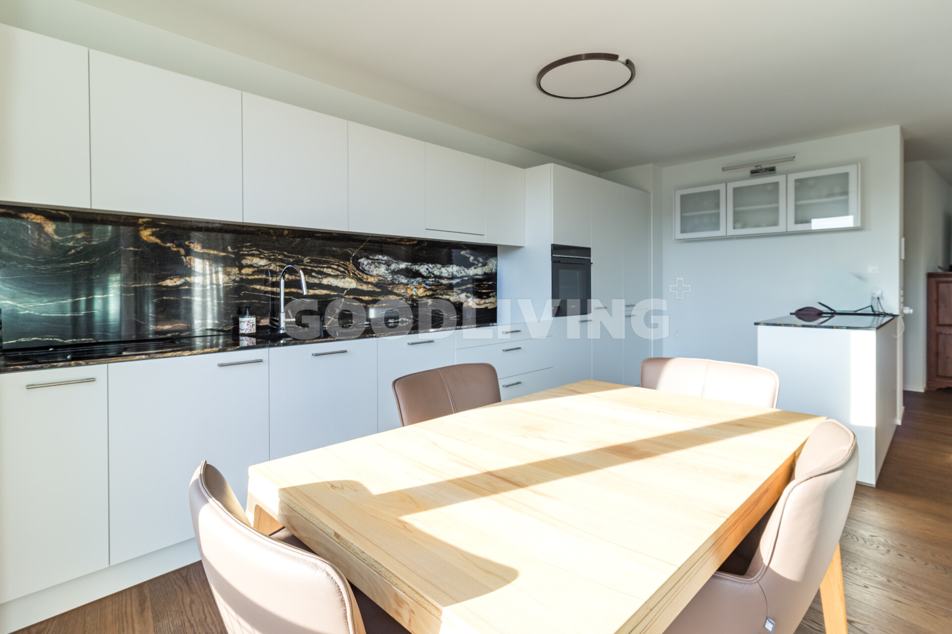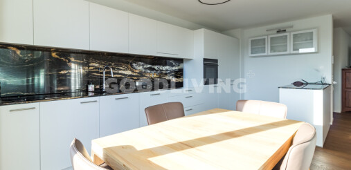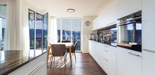 Der Wohn- und Essbereich bildet das Herzstück der unteren Ebene. Grosszügige Fensterflächen öffnen den Raum zur Landschaft und führen auf den sonnigen Balkon mit freier Sicht über die Umgebung. Die offene Küche mit eleganter Steinabdeckung fügt sich nahtlos in das Gesamtbild ein reduziert, hochwertig und zeitlos.
