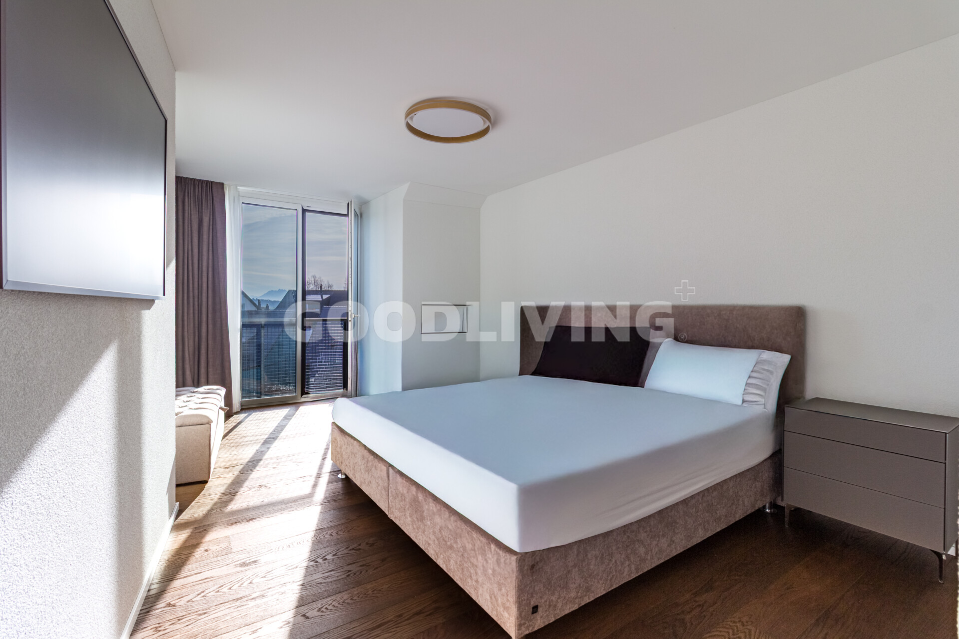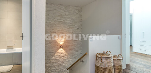 Im oberen Geschoss entstehen private Rückzugsräume mit angenehmer Raumhöhe und warmer Materialisierung. Das Hauptschlafzimmer mit Bad en Suite vermittelt Hotelcharakte - grosszügig, hell und stilvoll. Zwei weitere Zimmer bieten Flexibilität für Familie, Arbeiten oder Gäste.