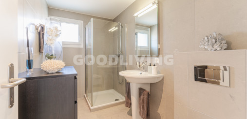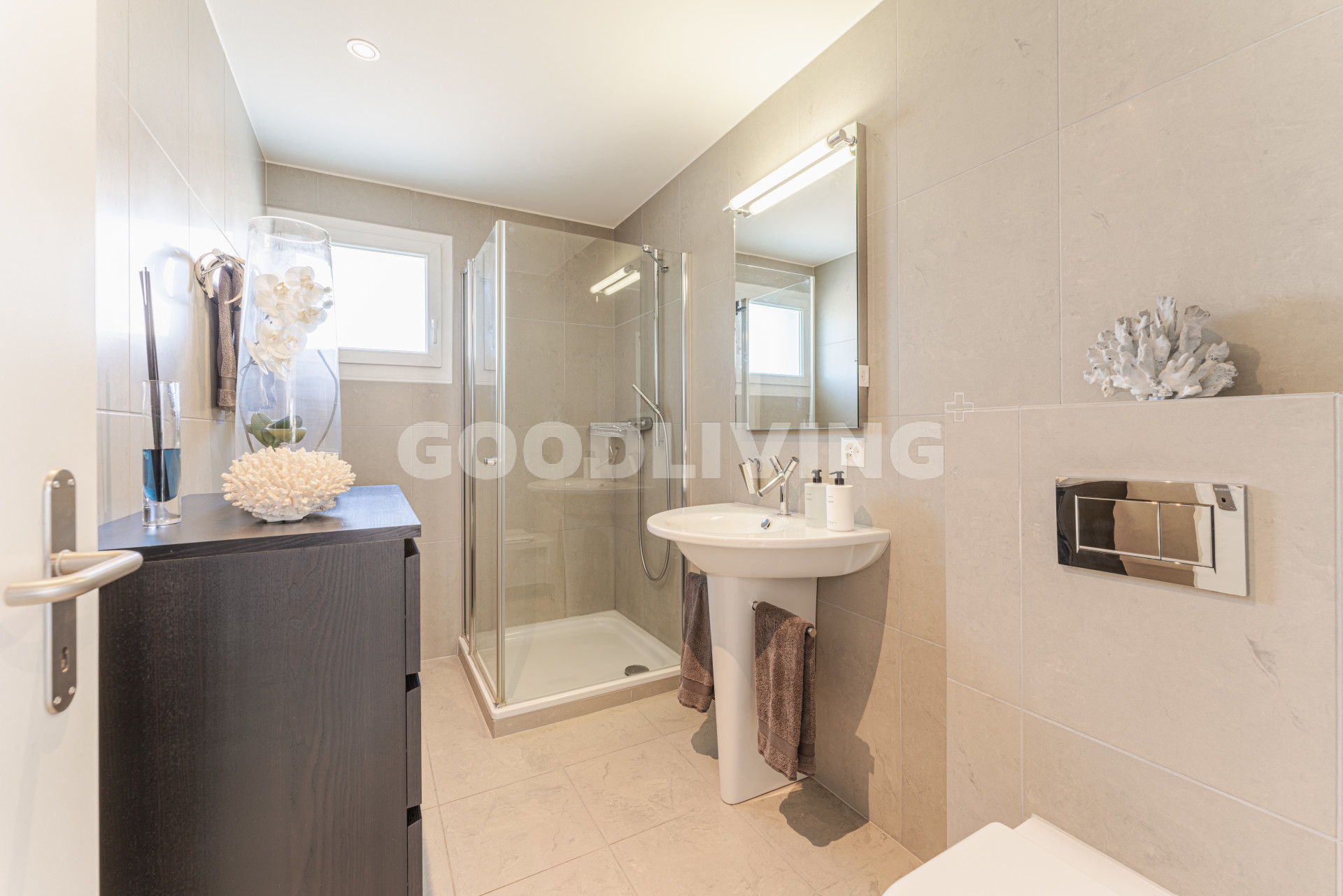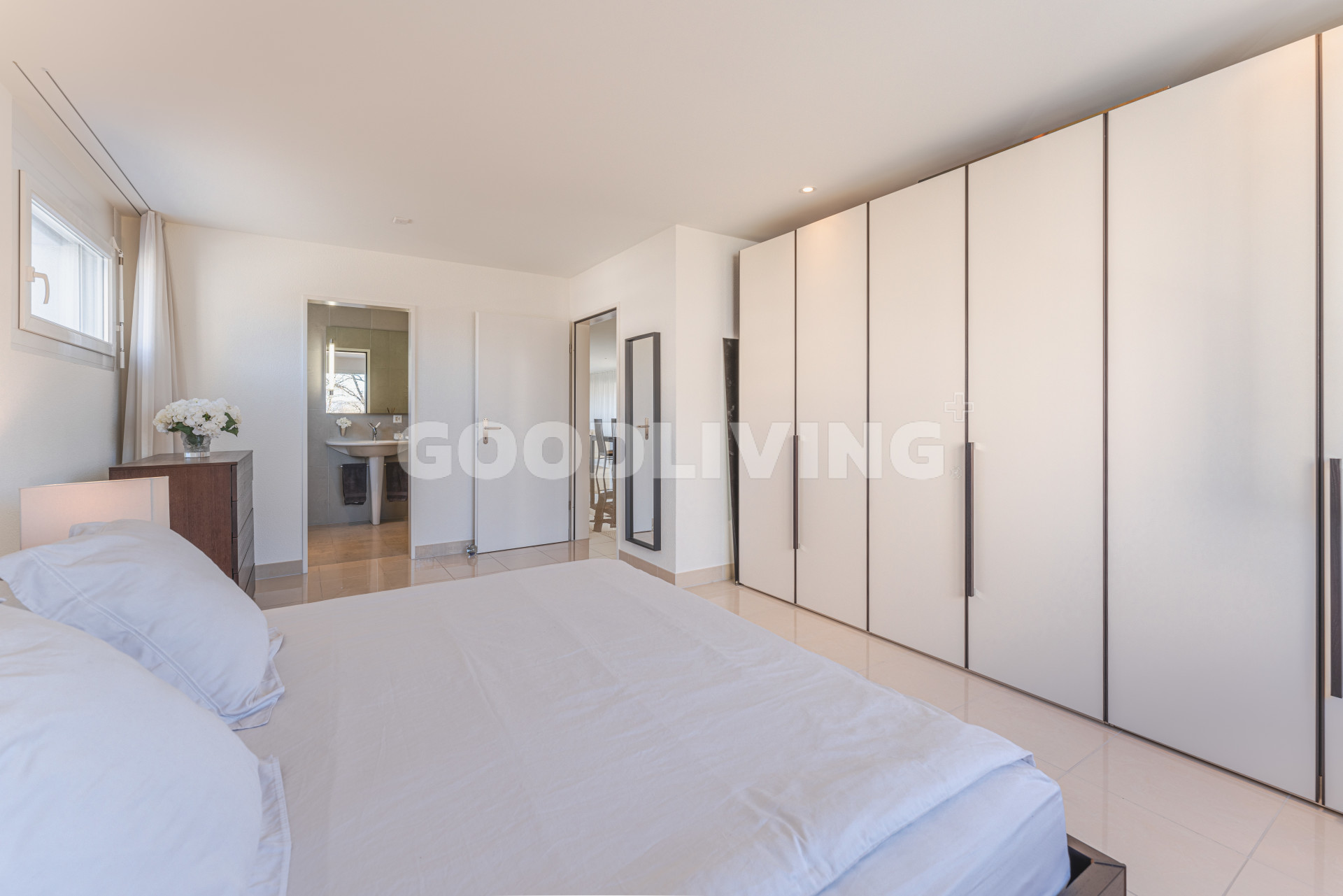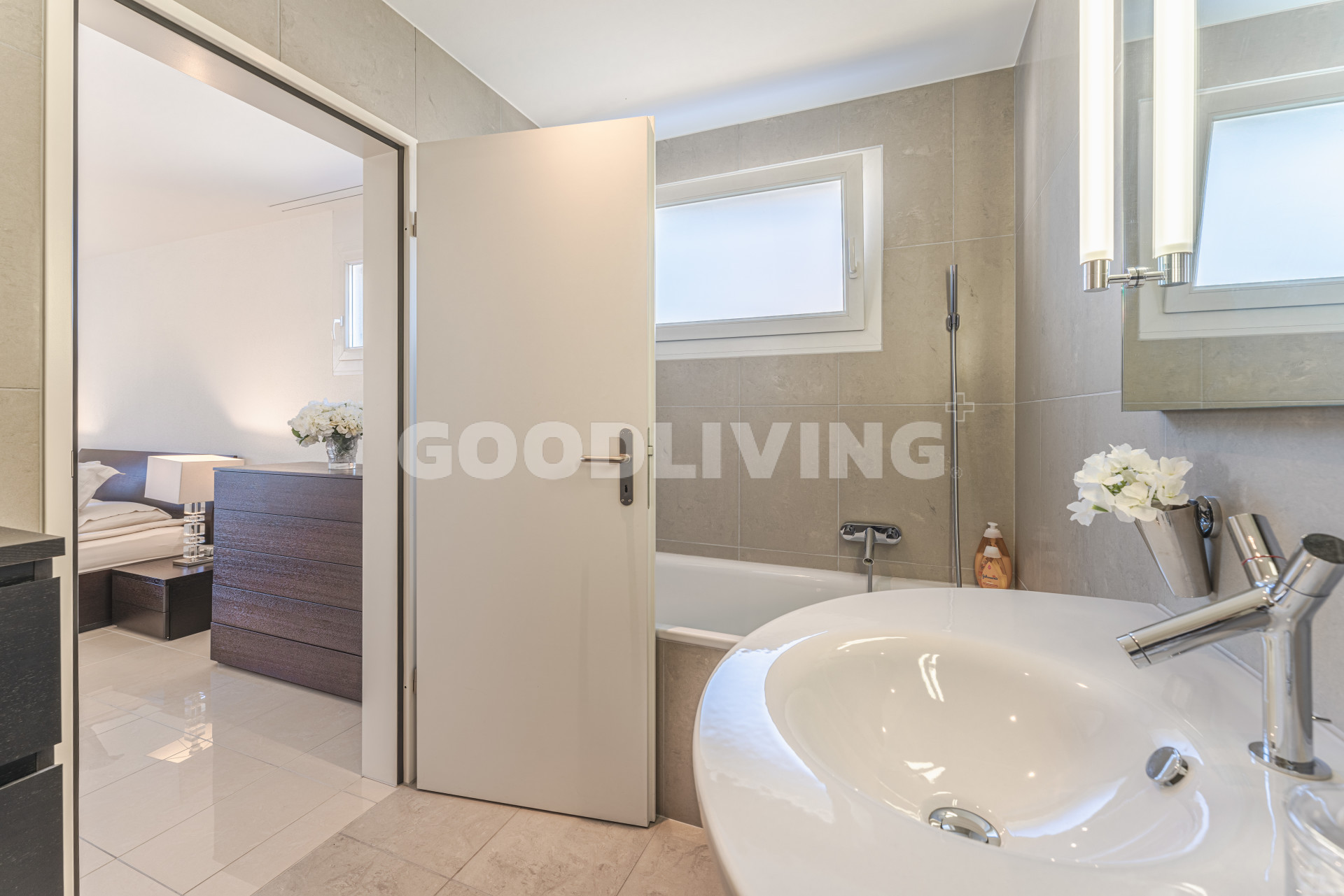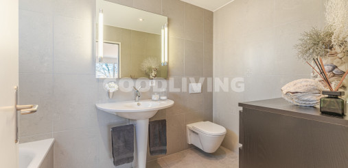Das moderne Badezimmer (En Suite) ist direkt vom grossen Elternzimmer aus erreichbar. Die Dusche / WC (mit Waschturm Anschluss- Vorbereitung) erreicht man über das Wohn- und Esszimmer. Beide Nasszellen wurden mit Duravit Starck Lavabo- sowie Axor Armaturen Design und hochwertige keramische Platten ausgestattet.
