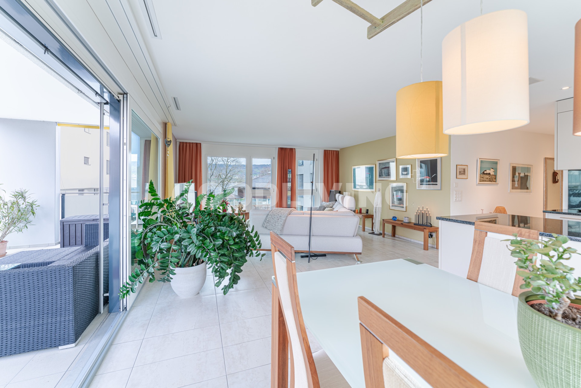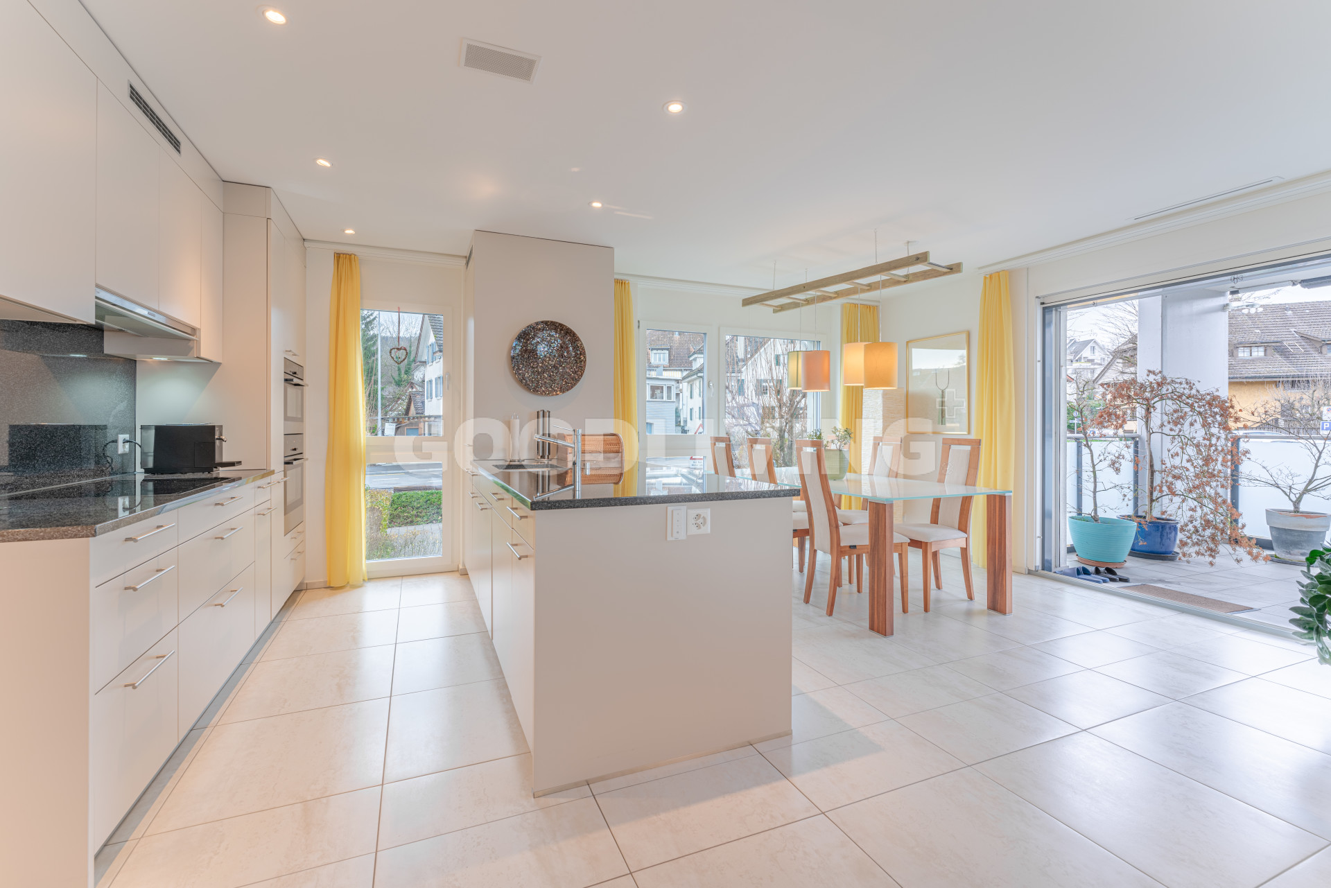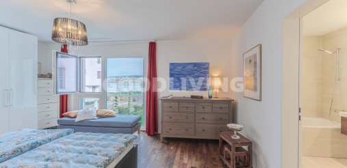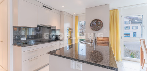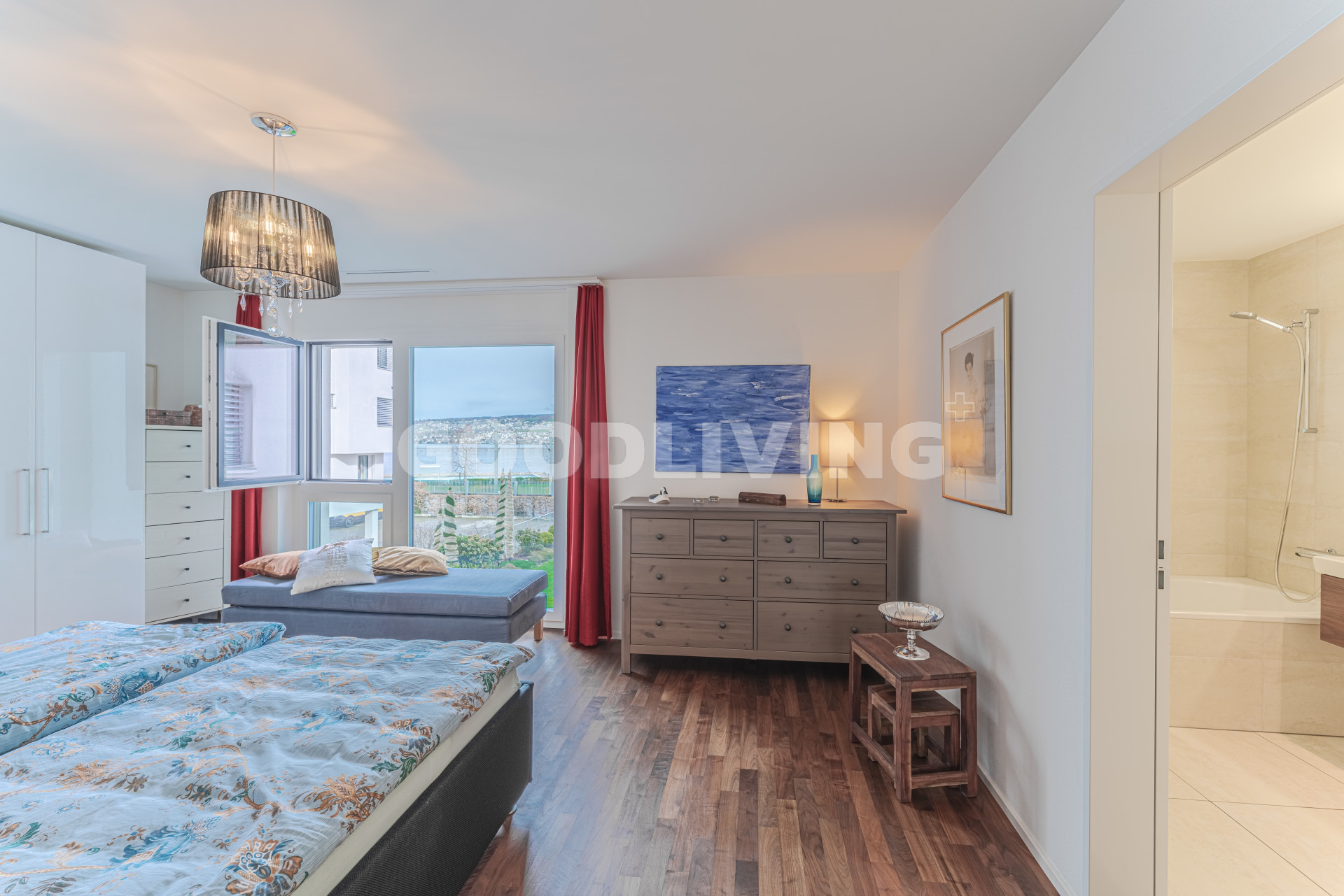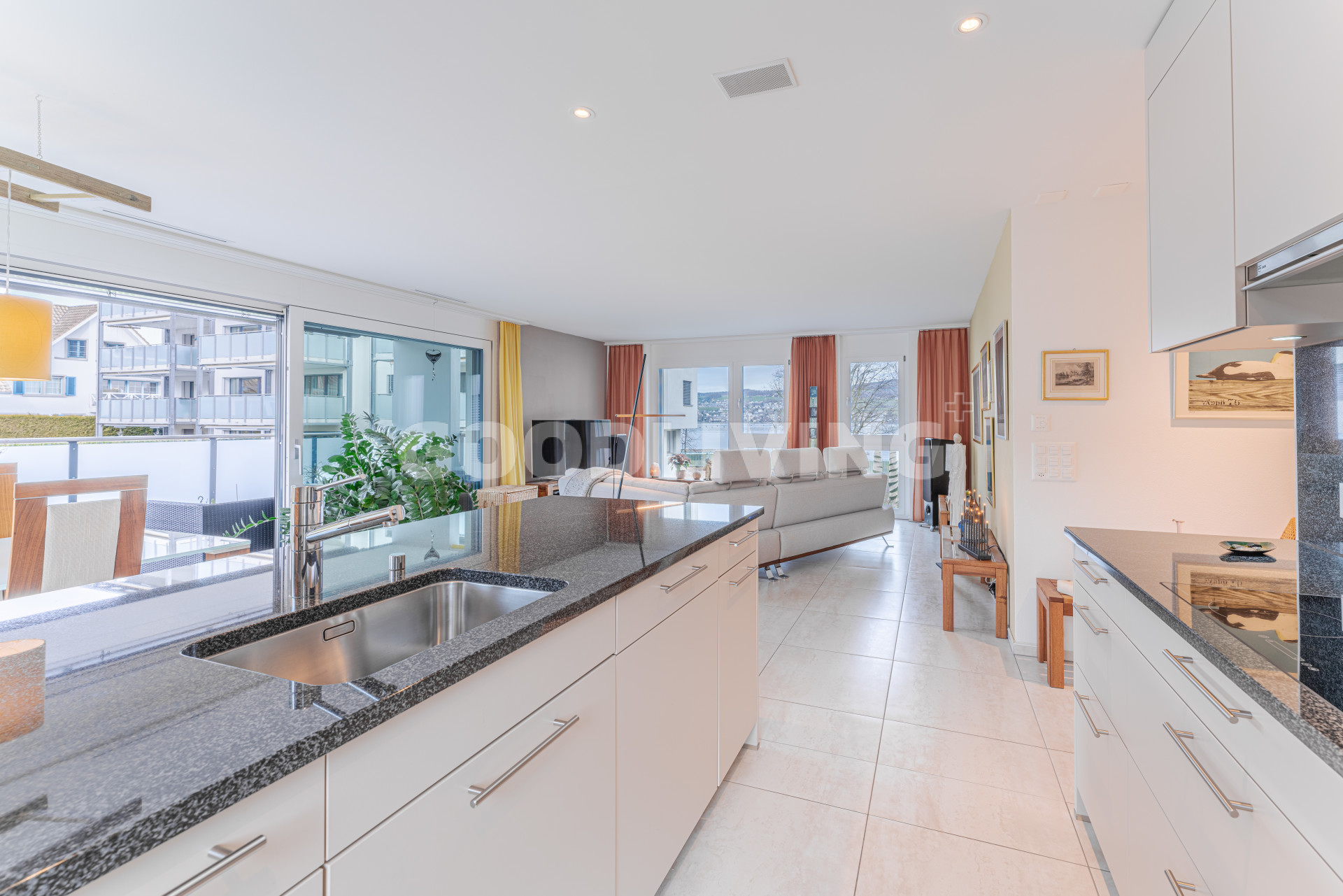 Vom Eingangsbereich aus gelangt man über den Korridor in das offene Wohn- und Esszimmer mit raumhohen Schiebefenster, welche die Räume mit viel natürlichem Tageslicht verwöhnen (alle Holz-Metall-Fenster sind dreifach isolierverglast). Des weiteren fallen die hochwertigen keramischen Bodenplatten sofort auf, welche in allen Räumen (ausser Elternzimmer & Büro) übergangslos verlegt wurden. In den beiden Zimmern wurde ein edler amerikanischer Nussbaumparkett verlegt. Die moderne Küche mit Granit-Arbeitsplatten punktet klar mit Glaskeramik Kochfeld, Kombi Steamer, Umluftbackofen sowie Geschirrspüler (alles V-Zug Geräte) und harmoniert perfekt mit dem Innendesign der Wohnung. Über das Wohnzimmer gelangt man zum nordwestlich ausgerichteten Sitzplatz (Feinsteinzeug Bodenplatten) welcher verglast werden kann. Das Büro, das Elternzimmer mit direkter Seesicht (Bad-En-Suite inkl. Waschmaschine / Tumbler) und die begehbare Dusche / WC sind über den Korridor erreichbar.