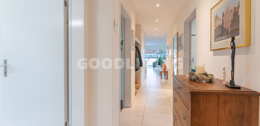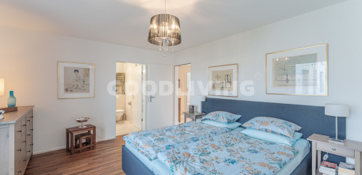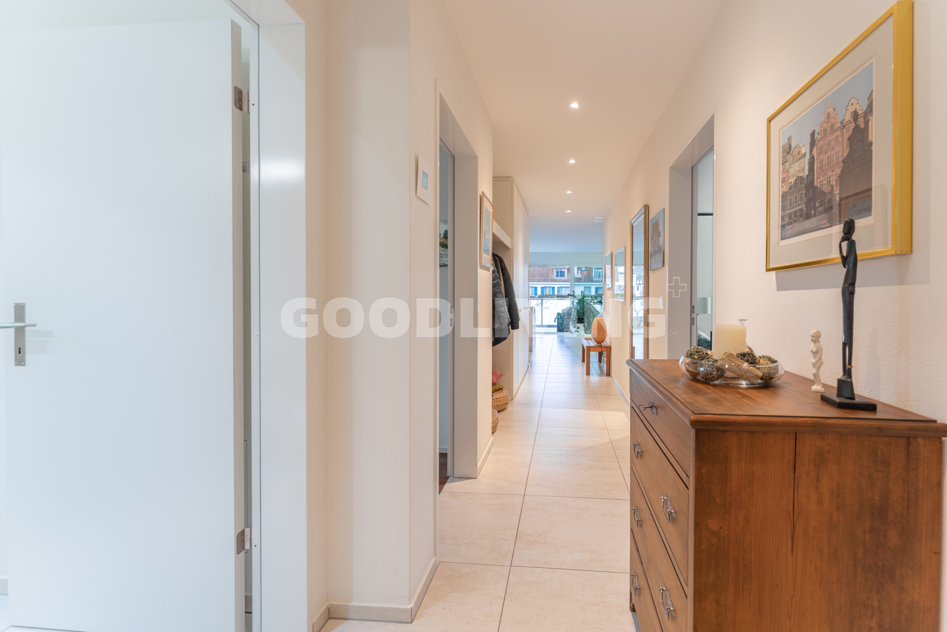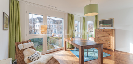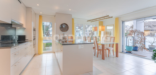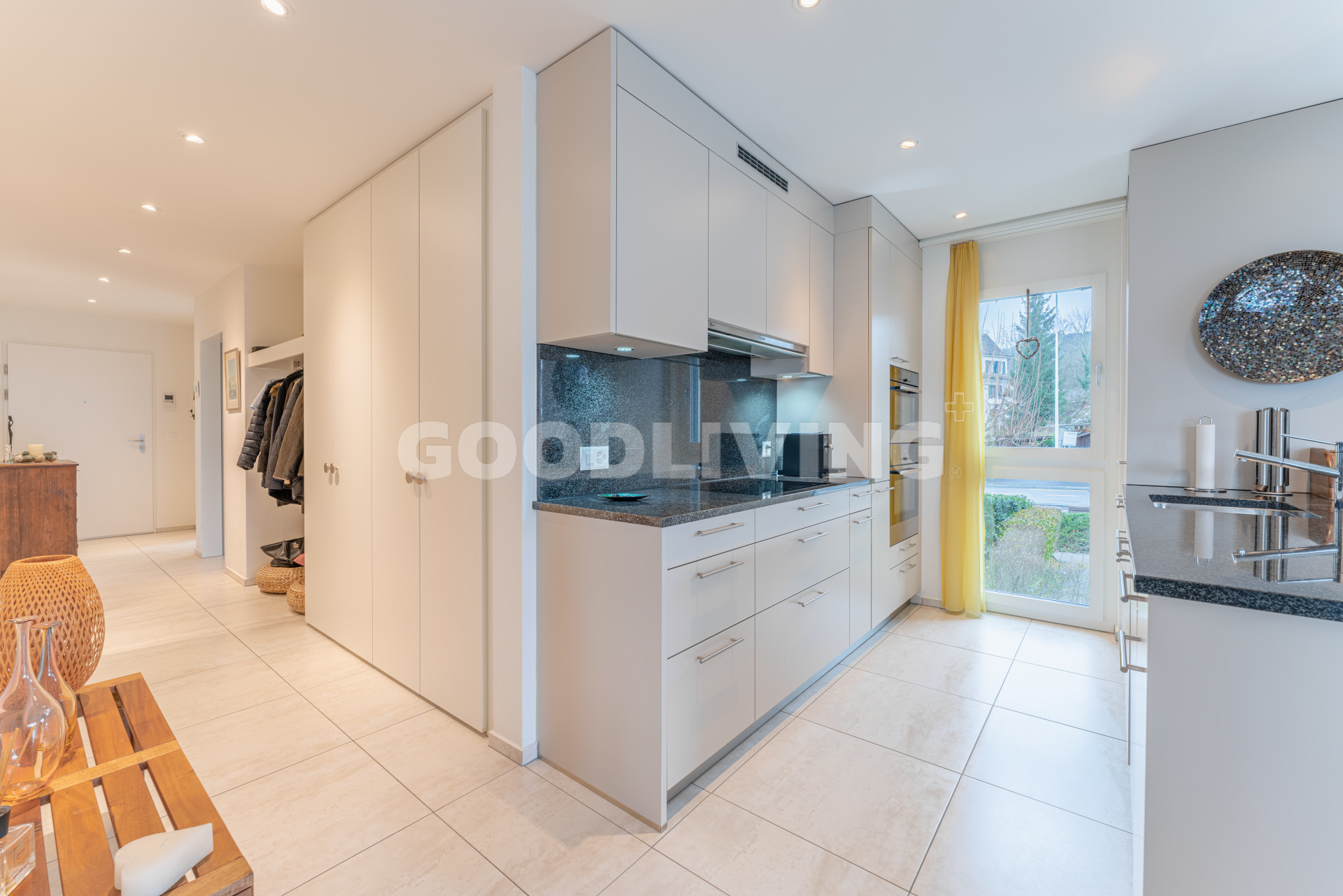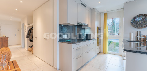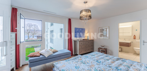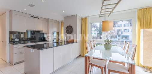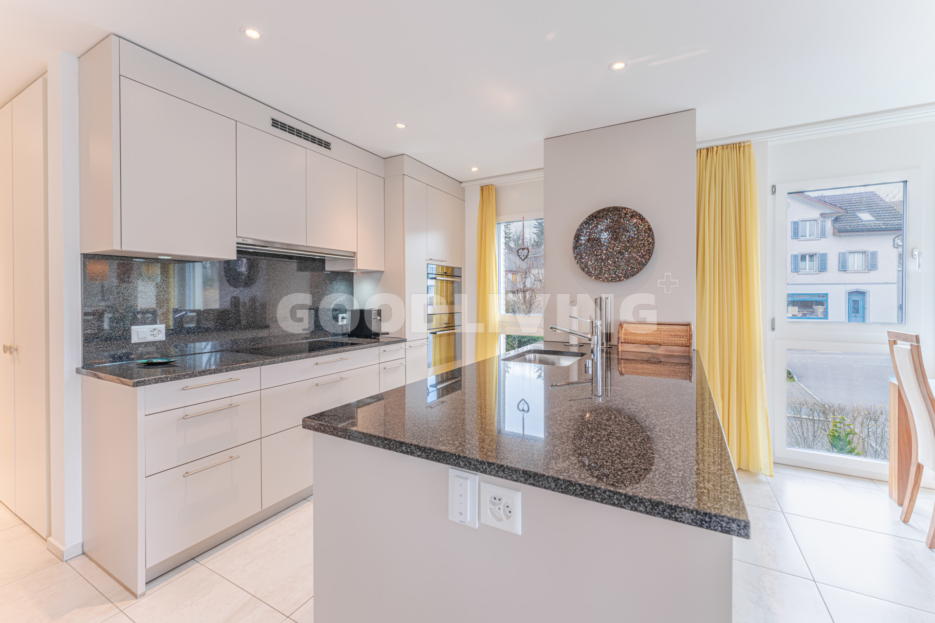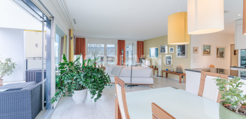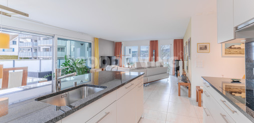 Vom Eingangsbereich aus gelangt man über den Korridor in das offene Wohn- und Esszimmer mit raumhohen Schiebefenster, welche die Räume mit viel natürlichem Tageslicht verwöhnen (alle Holz-Metall-Fenster sind dreifach isolierverglast). Des weiteren fallen die hochwertigen keramischen Bodenplatten sofort auf, welche in allen Räumen (ausser Elternzimmer & Büro) übergangslos verlegt wurden. In den beiden Zimmern wurde ein edler amerikanischer Nussbaumparkett verlegt. Die moderne Küche mit Granit-Arbeitsplatten punktet klar mit Glaskeramik Kochfeld, Kombi Steamer, Umluftbackofen sowie Geschirrspüler (alles V-Zug Geräte) und harmoniert perfekt mit dem Innendesign der Wohnung. Über das Wohnzimmer gelangt man zum nordwestlich ausgerichteten Sitzplatz (Feinsteinzeug Bodenplatten) welcher verglast werden kann. Das Büro, das Elternzimmer mit direkter Seesicht (Bad-En-Suite inkl. Waschmaschine / Tumbler) und die begehbare Dusche / WC sind über den Korridor erreichbar.