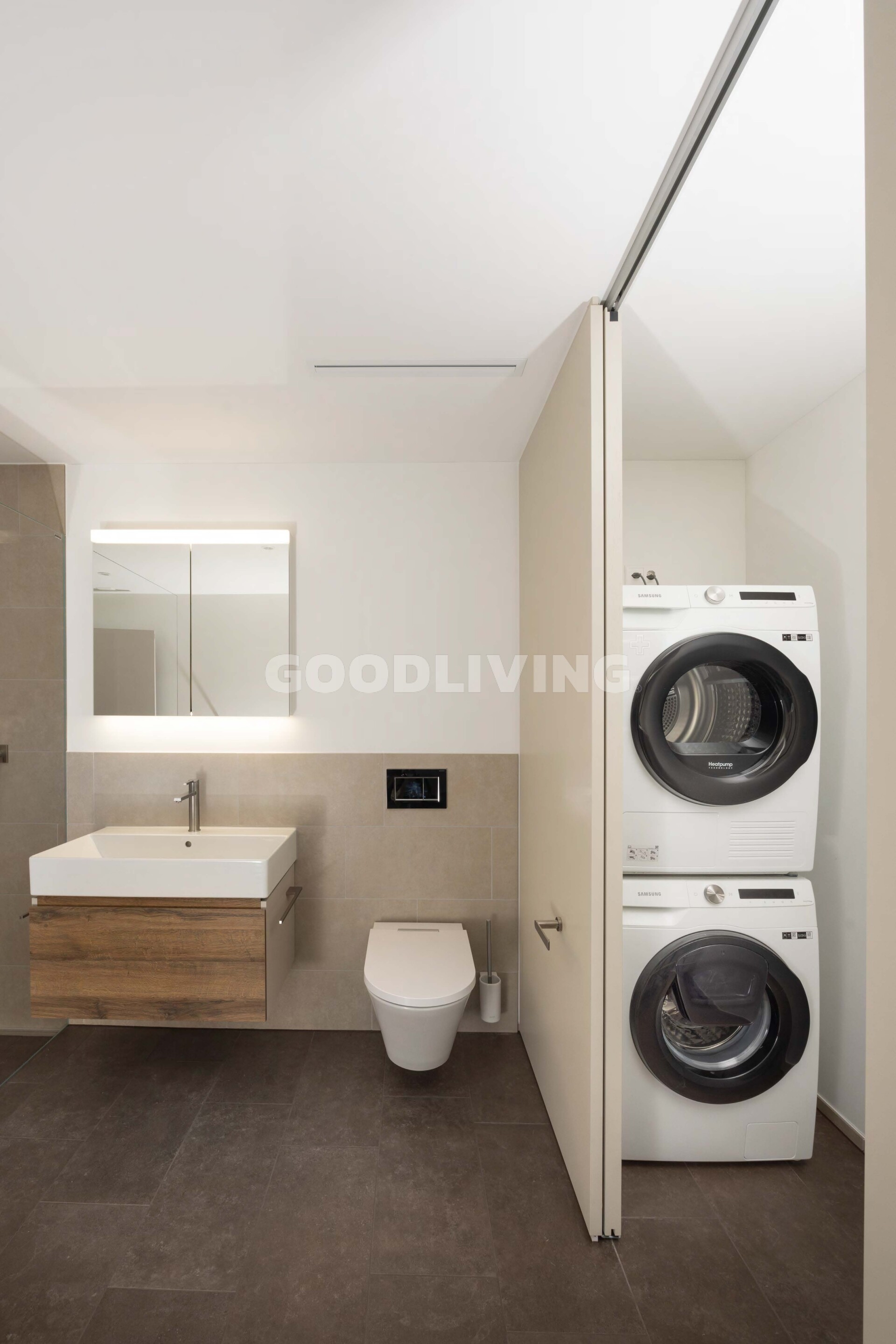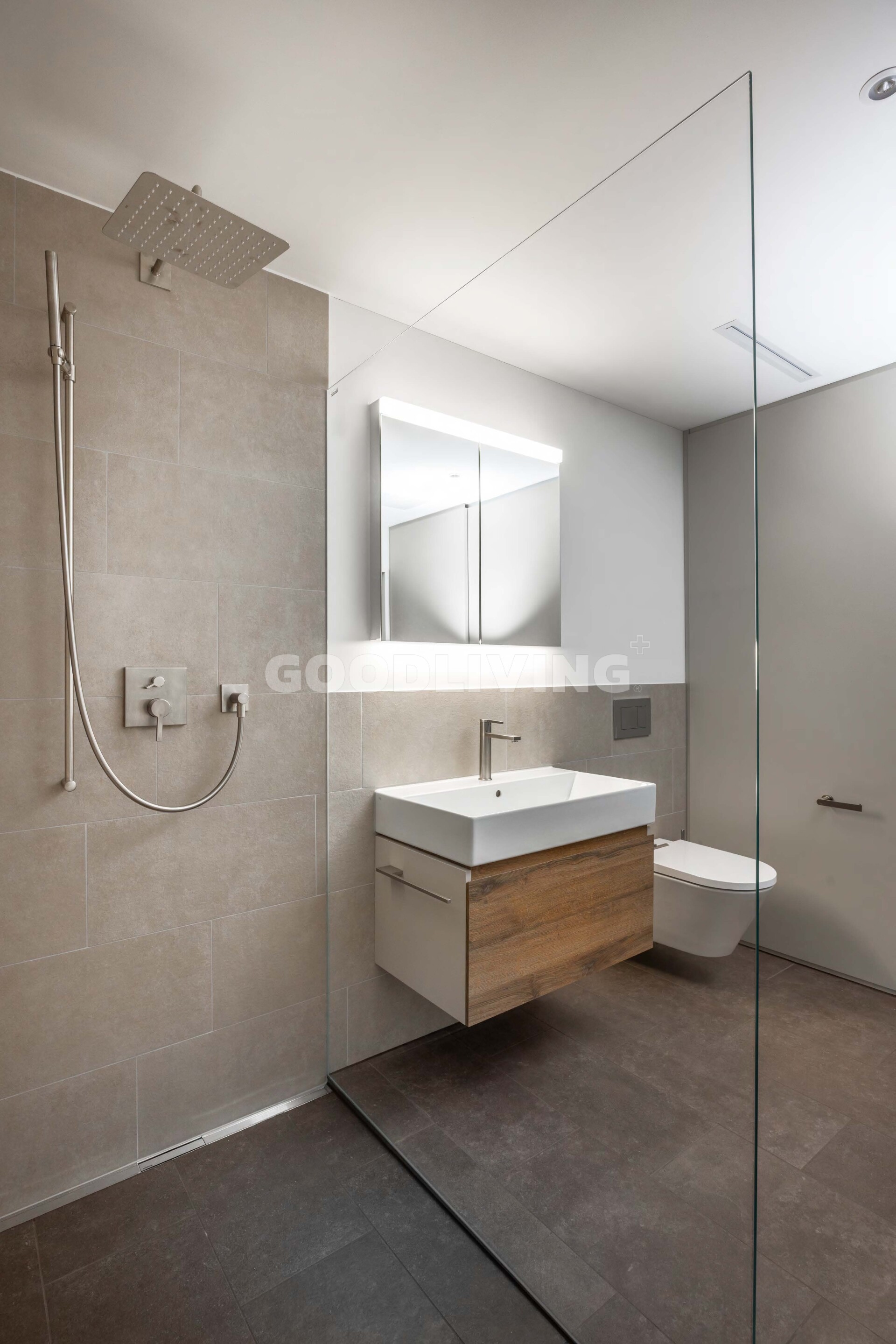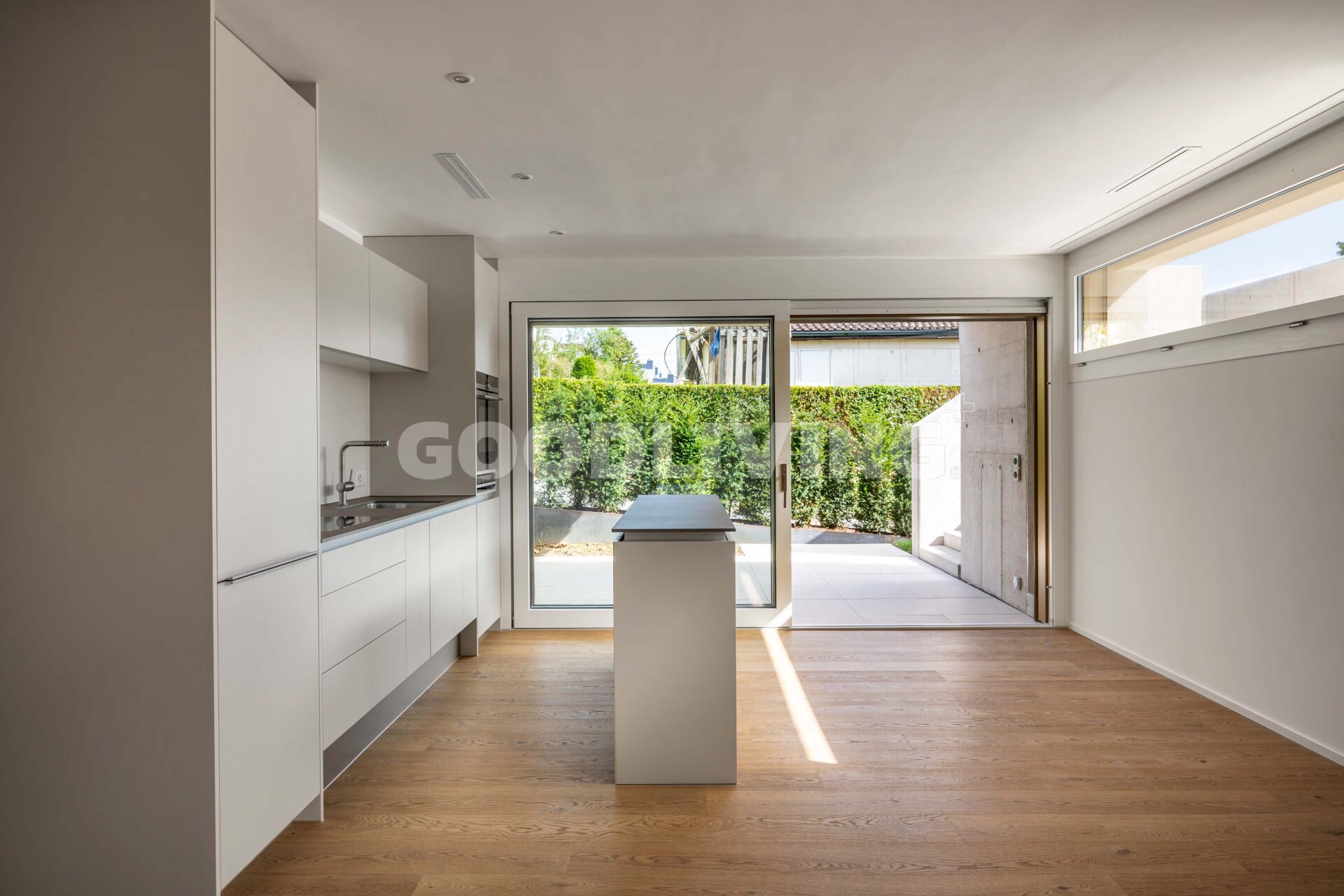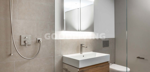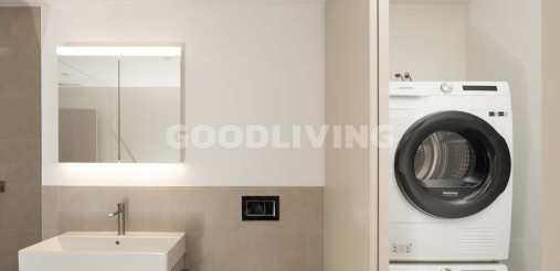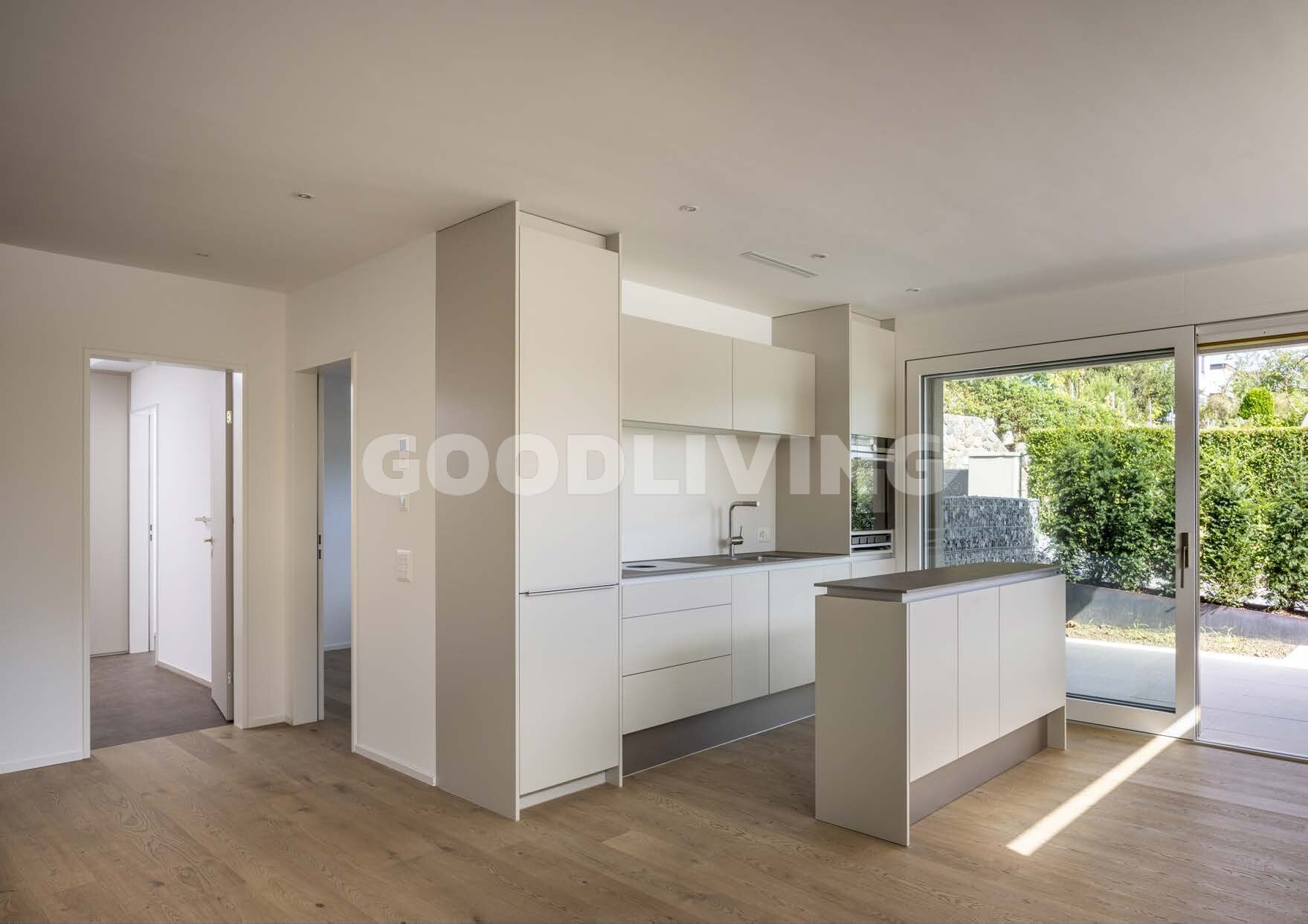 Beim betreten der Wohnung fällt der hochwertige Landhausdielen Eichenparkettboden, welcher ausser in der Nasszelle verlegt wurde sofort auf. In der Nasszelle mit Waschmaschine und Tumbler (Samsung Geräte), im Reduit sowie im Aussenbereich wurden zum Innendesign passende Feinsteinzeugplatten verlegt. Die massgeschneiderte Designerküche mit Kücheninsel von Poggenpohl steht für Spitzenqualität sowie Langlebigkeit. Sie ist mit einem Kombi Steamer, einem Kühl- Gefrierschrank, einem Geschirrspüler (alles Siemens Geräte) ausgestattet worden und harmoniert perfekt mit dem Wohndesign. Das Induktions-Kochfeld von Bora besticht mit einem integrierten Dunstabzug (Umluft mit Aktivkohlefilter) und unterstreicht ebenfalls das smarte Konzept der Überbauung.