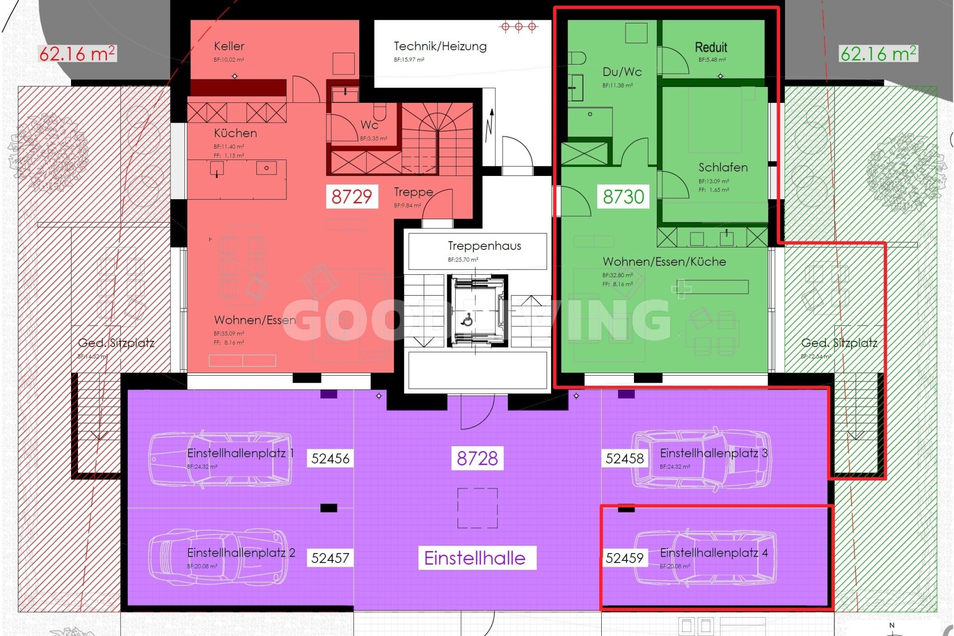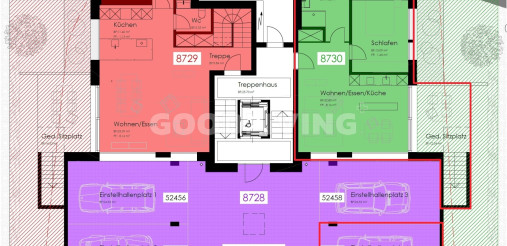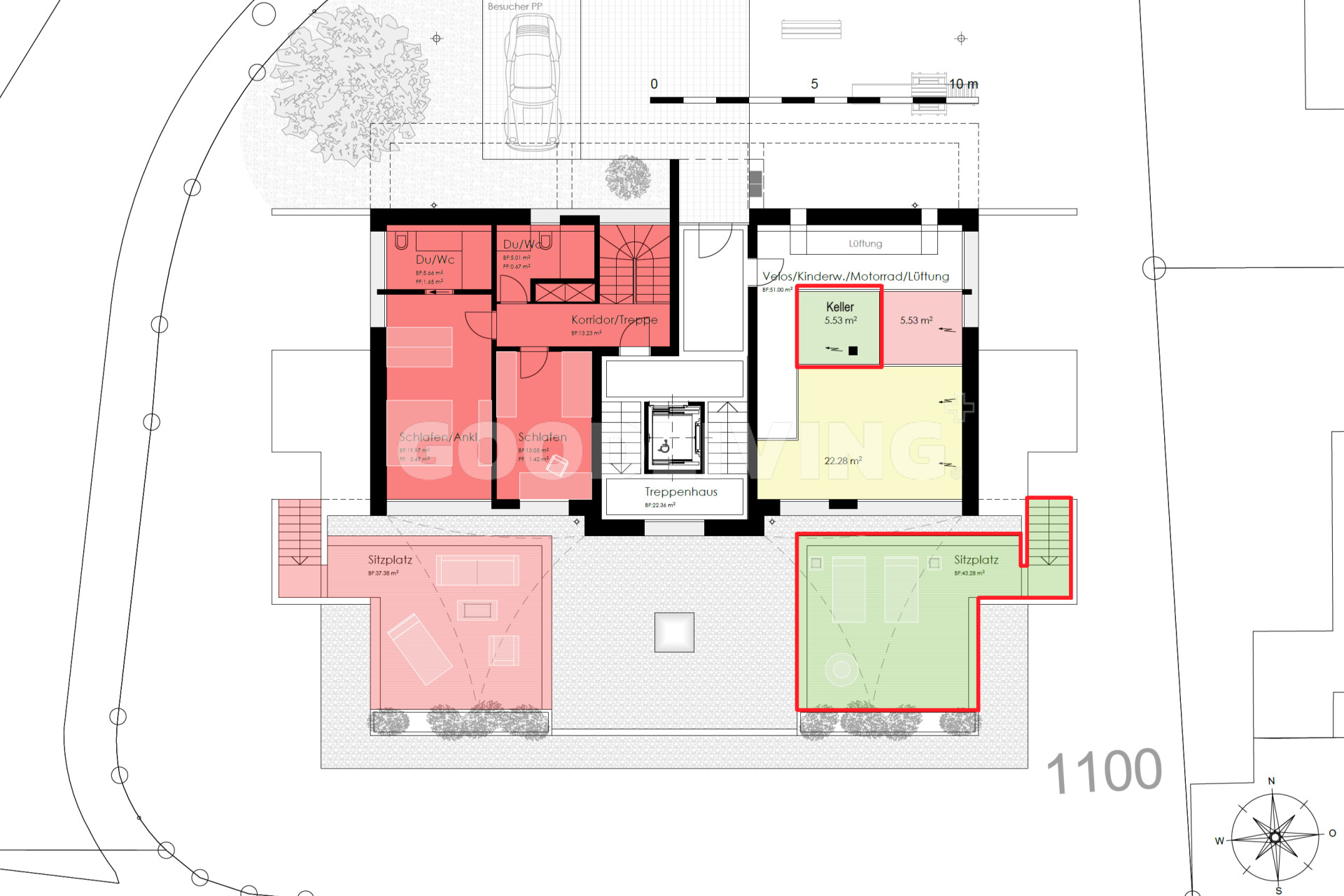 Der grosse Einstellhallenplatz (20m²) à CHF 45'000.-, das Reduit (5.4m²), der Keller und der allgemeine Veloraum runden das ansprechende Angebot ab.
