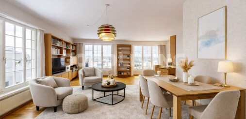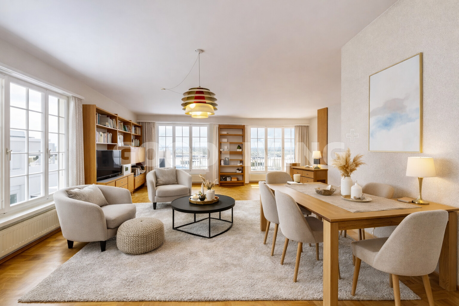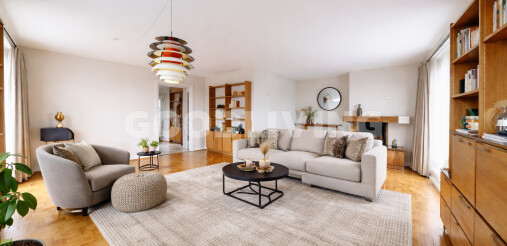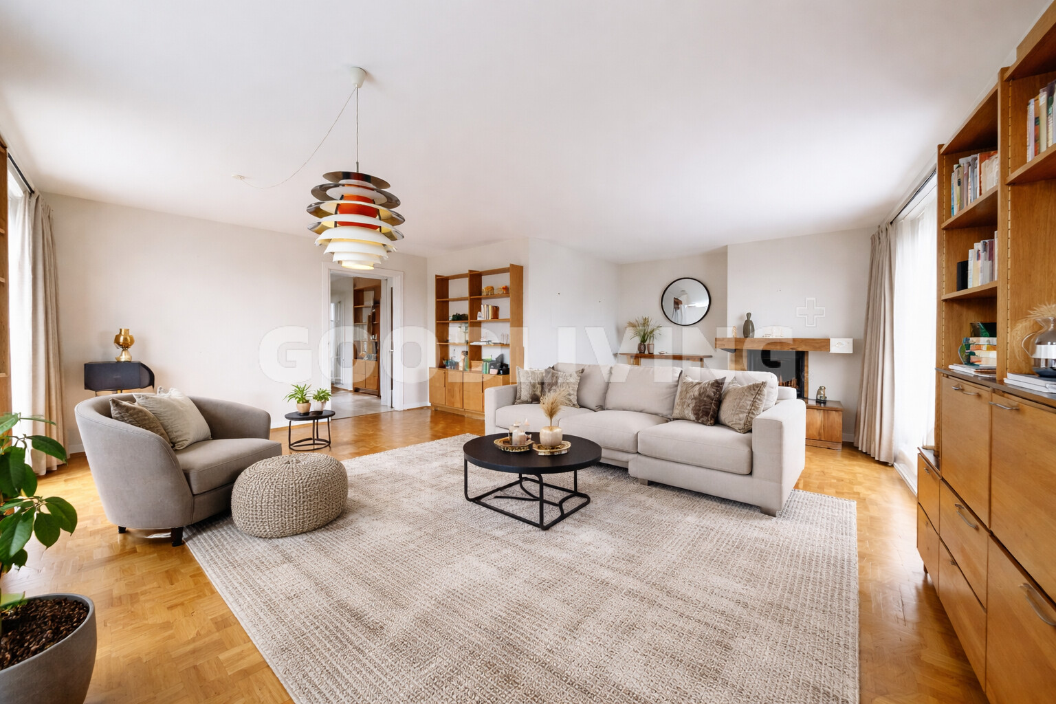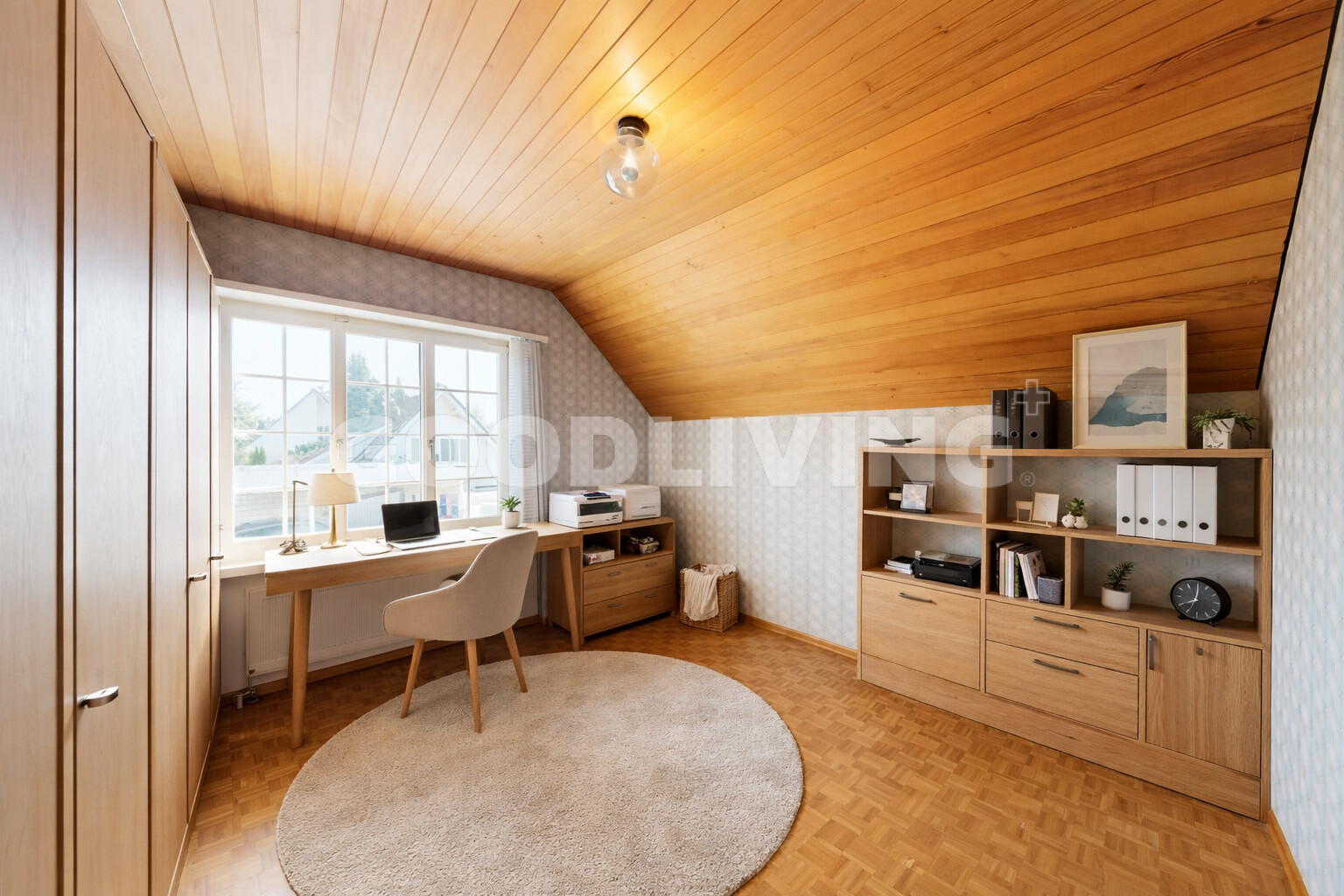 Der Wohnbereich mit Cheminée bildet das Zentrum des Hauses und sorgt für eine angenehme, wohnliche Atmosphäre. Die Raumaufteilung ist funktional und bietet genügend Platz für Familien oder Paare mit Anspruch an Raum und Struktur.