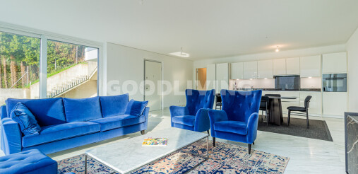 Der offene Grundriss bietet viel Freiraum für individuelle Gestaltung, während edle Materialien wie Marmor und Echtholzparkett für ein stilvolles, zeitloses Wohngefühl sorgen. Die moderne Einbauküche mit hochwertigen Geräten fügt sich nahtlos in den Wohn-/Essbereich ein. Durch die bodentiefen Fensterfronten geniessen Sie ganztägig Licht und einen unverbaubaren Seeblick – pure Lebensqualität.