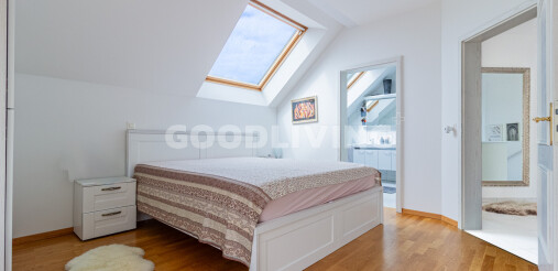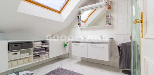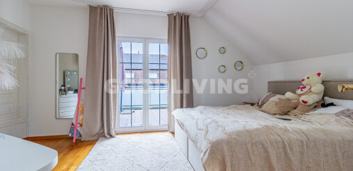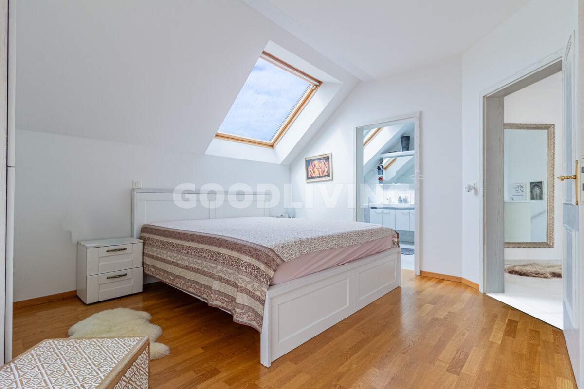 Das Obergeschoss bietet drei geräumige Schlafzimmer, alle mit Balkonzugang. Das Masterzimmer verfügt über eine Ankleide und ein en suite Badezimmer mit Eckwanne, Dusche und Doppellavabo. Ein weiteres Schlafzimmer besitzt ebenfalls ein eigenes Bad, während ein drittes Badezimmer vom Korridor zugänglich ist.