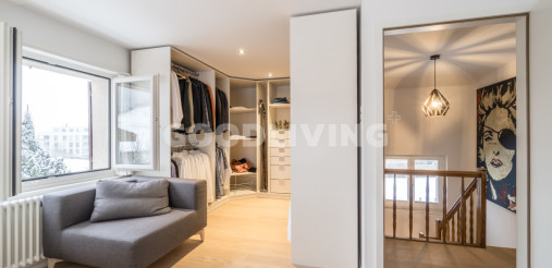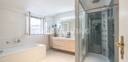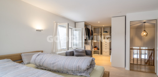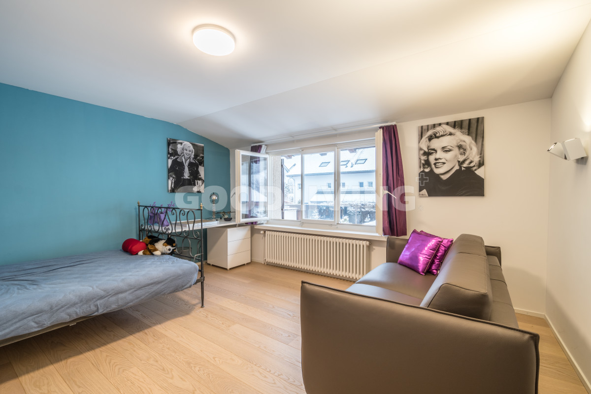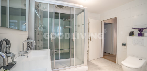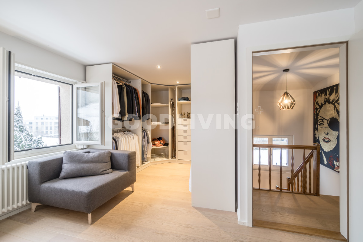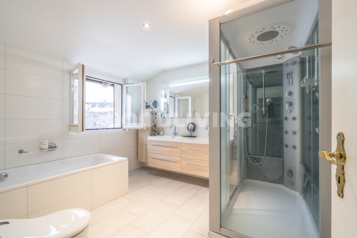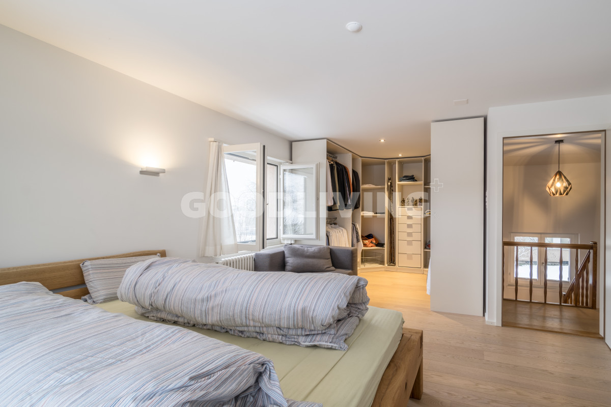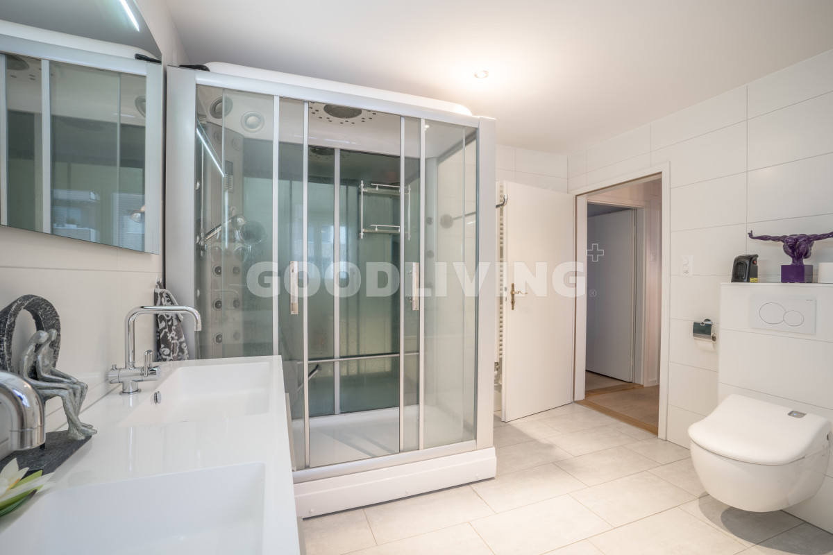 Im Obergeschoss befindet sich das Kinderzimmer, Elternzimmer mit Ankleide und das Bad, Closomat/ WC inkl. einer Komfort Dampfdusche mit Saunafunktion.