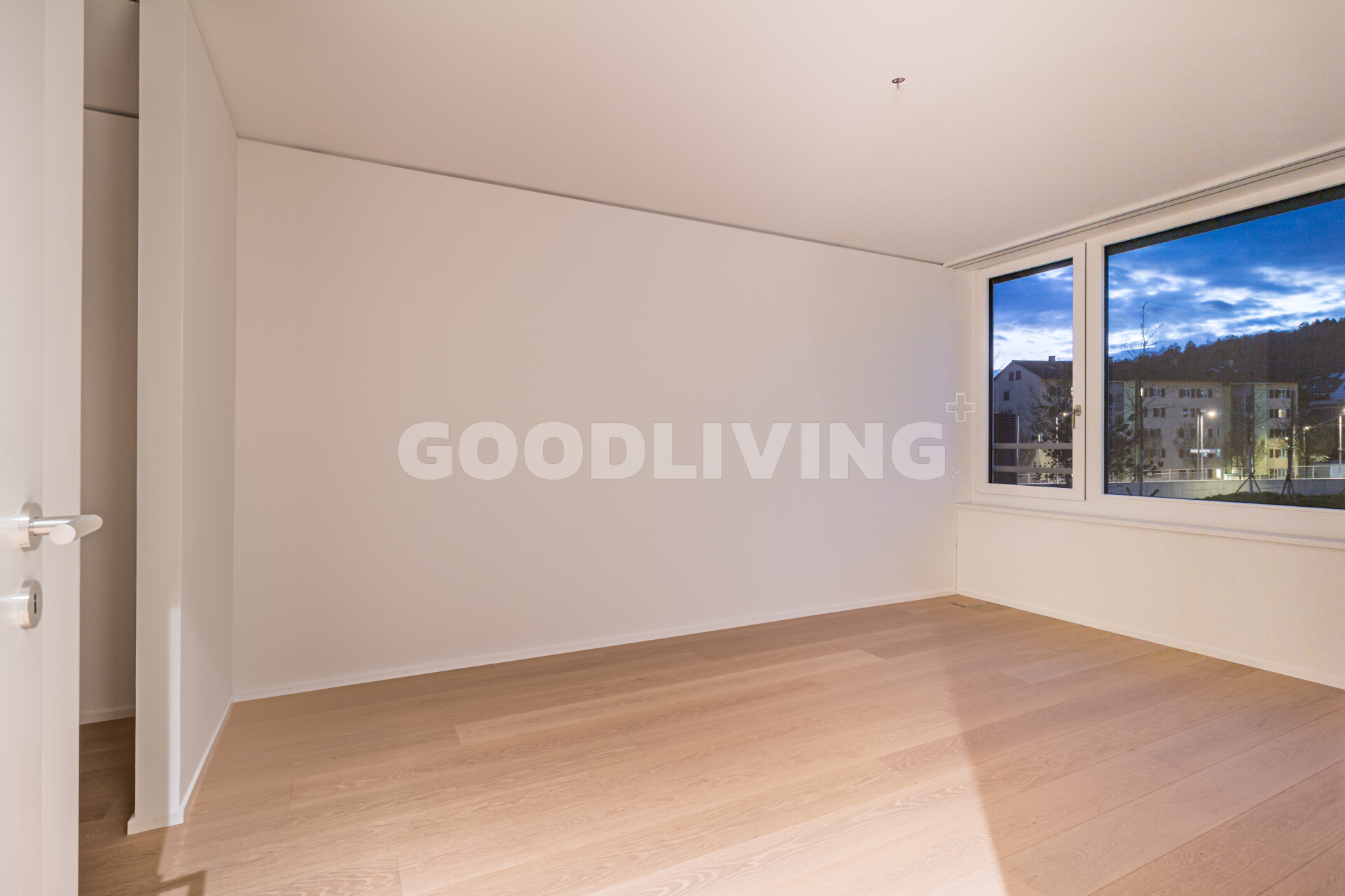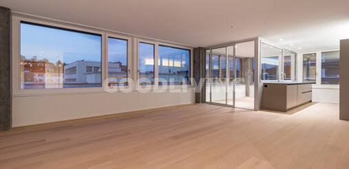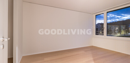 Der offen gestaltete Wohn- und Essbereich bildet das Herzstück der Wohnung. Grossflächige Fenster lassen viel Tageslicht einfliessen und schaffen eine helle, angenehme Wohnatmosphäre. Die angrenzende Loggia erweitert den Wohnraum auf elegante Weise und bietet einen geschützten Aussenbereich für ruhige Momente oder gesellige Stunden.