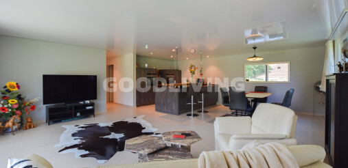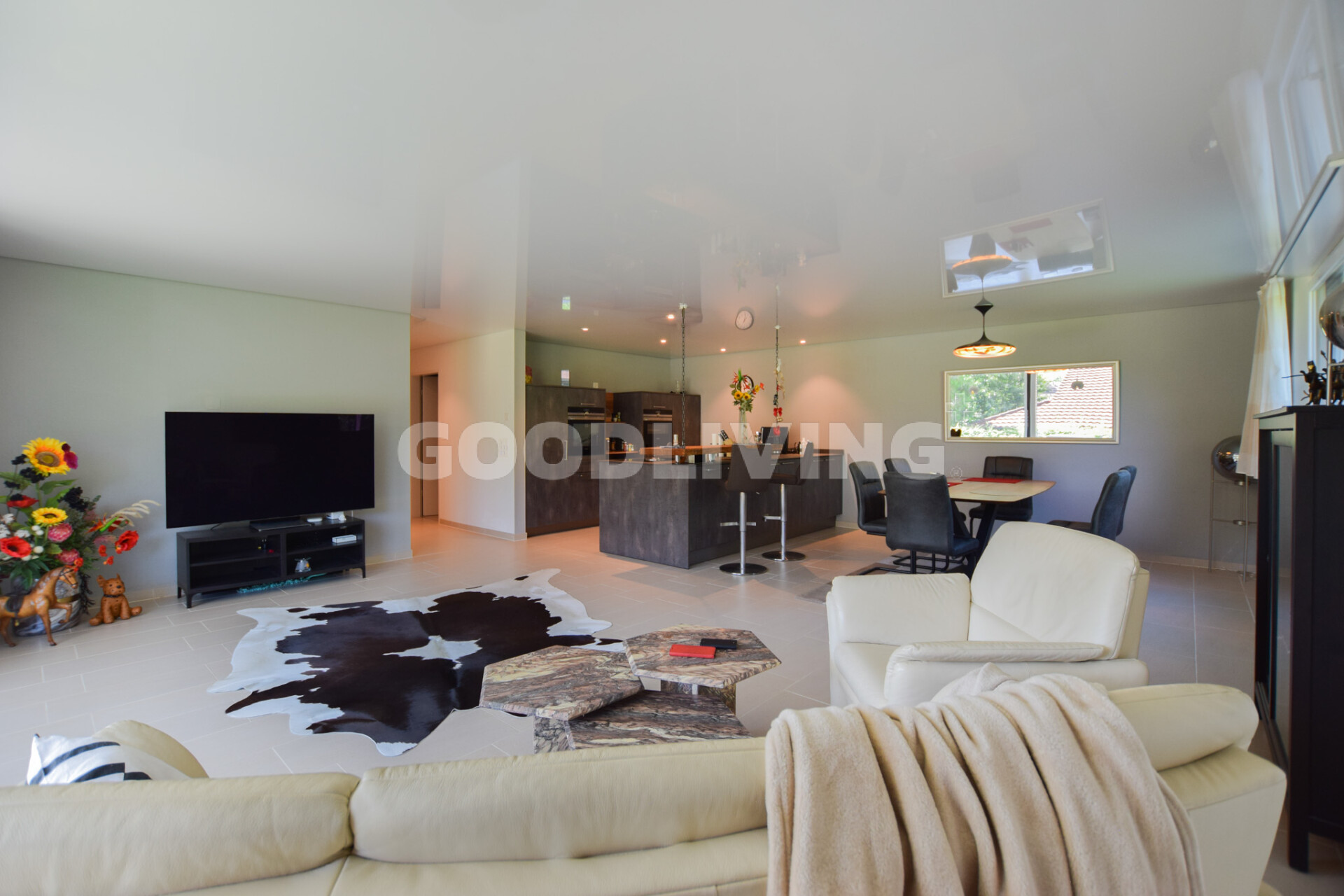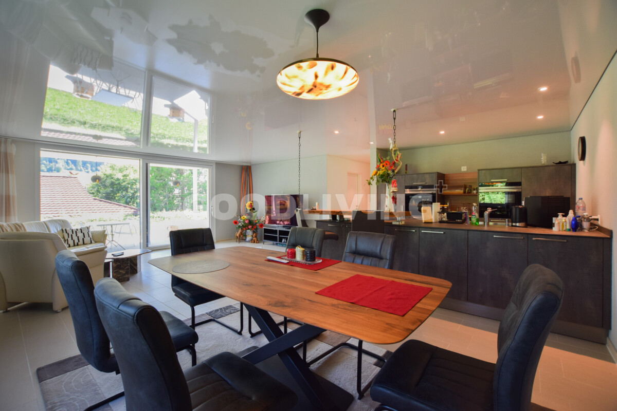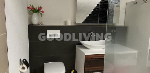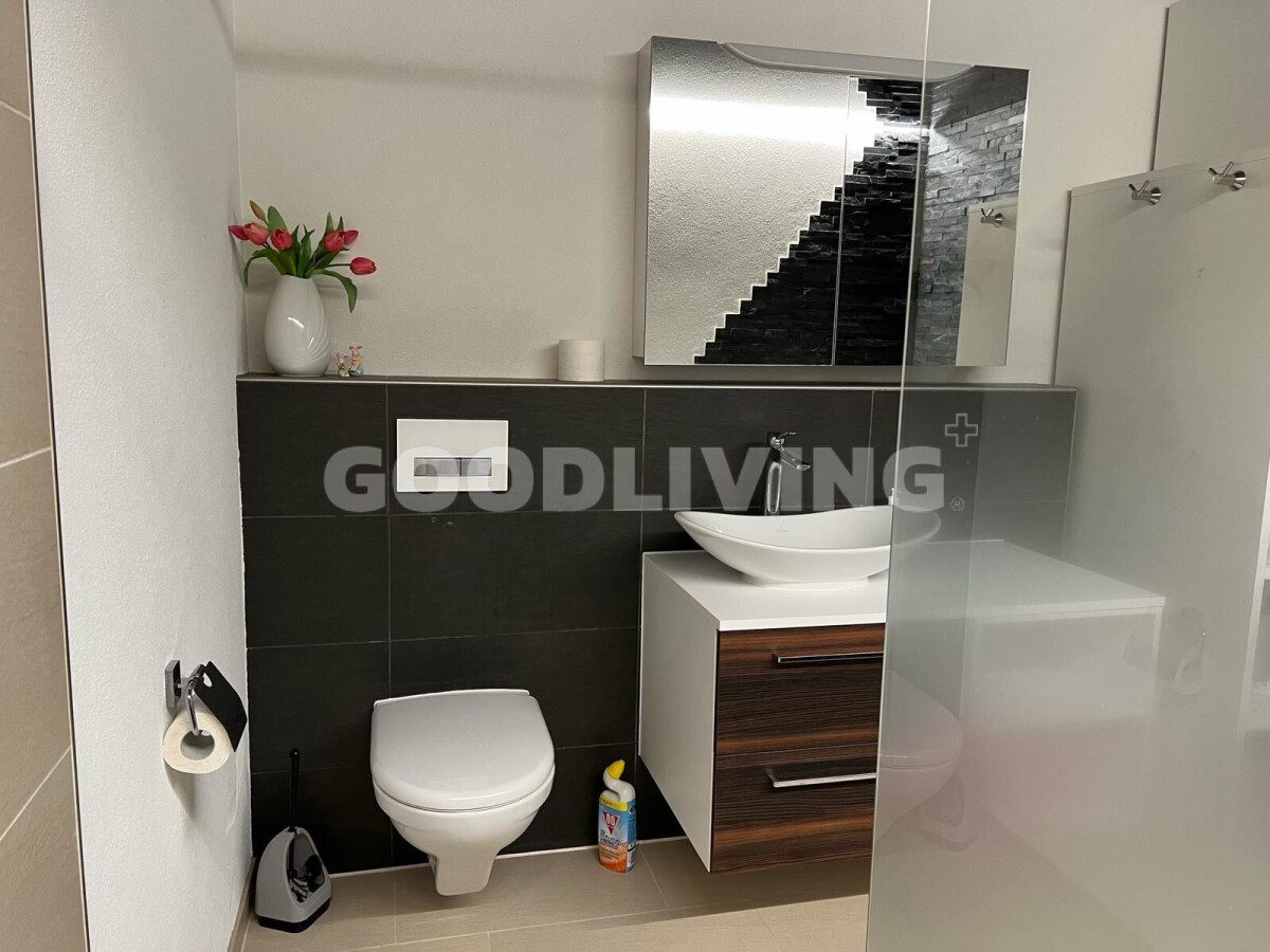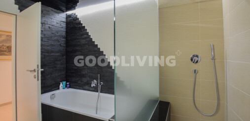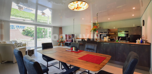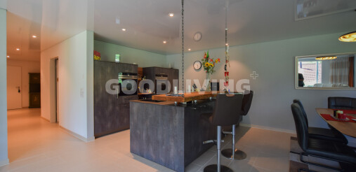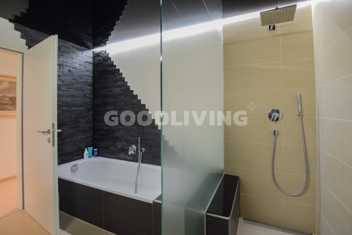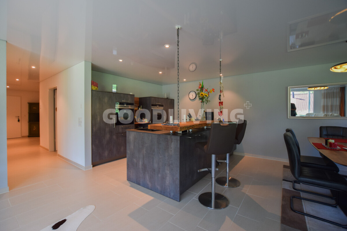 Der hochwertige Innenausbau begeistert mit Siemens-Geräten, Bora-Kochfeld, edler Keramikarbeitsfläche, Designbad mit Villeroy & Boch, Feinsteinzeugboden, Nussbaumparkett und Spanndecke mit LED-Lichtband. Das praktische Réduit lässt sich mit wenig Aufwand in eine zweite Nasszelle umwandeln.