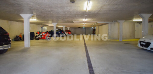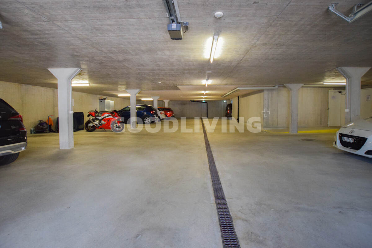 Zur Wohnung gehören ein grosser Kellerraum (ca. 10 m²) und ein Einstellhallenplatz. Besucherparkplätze, Velounterstand und ein Zweiradraum stehen zur gemeinsamen Nutzung zur Verfügung.