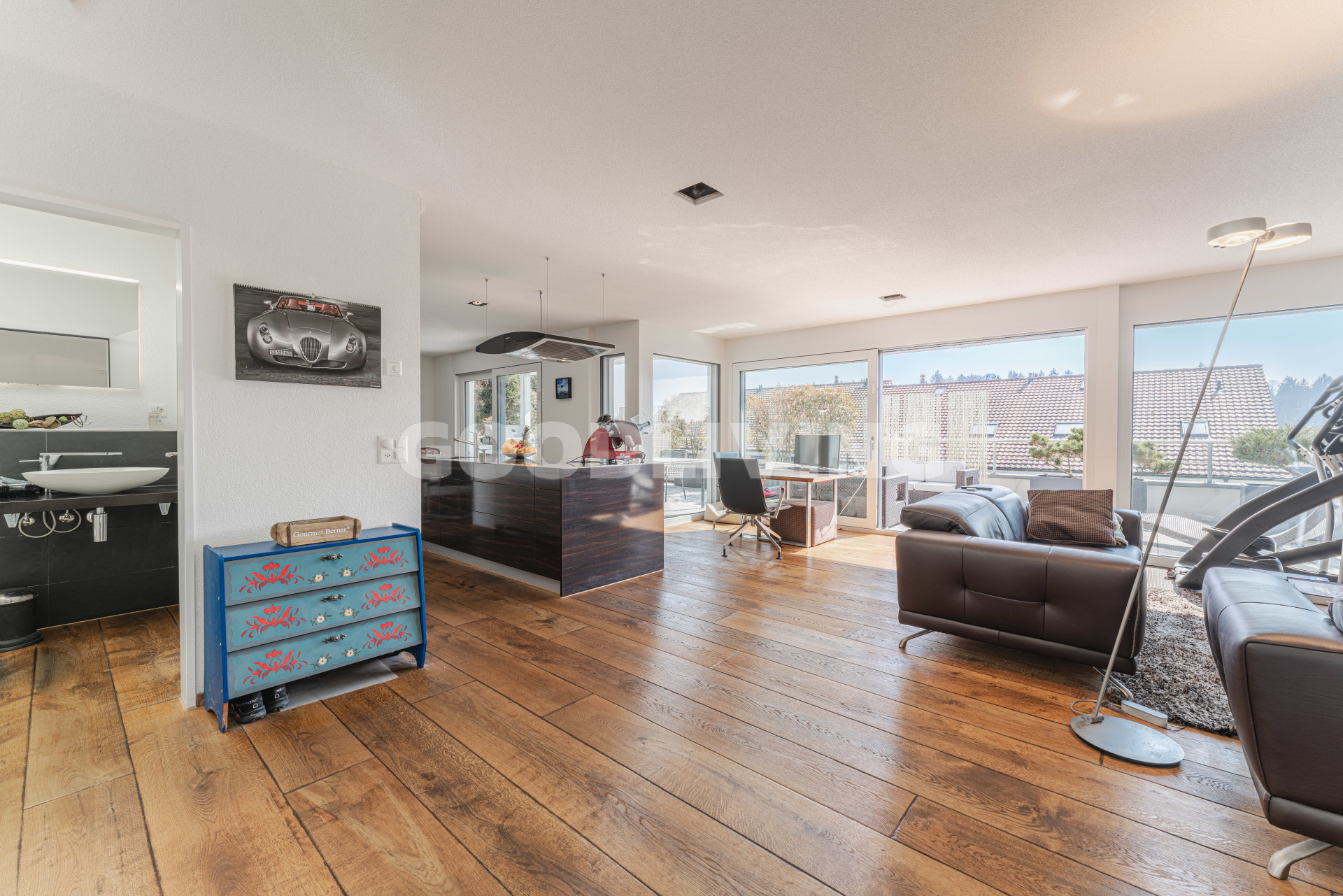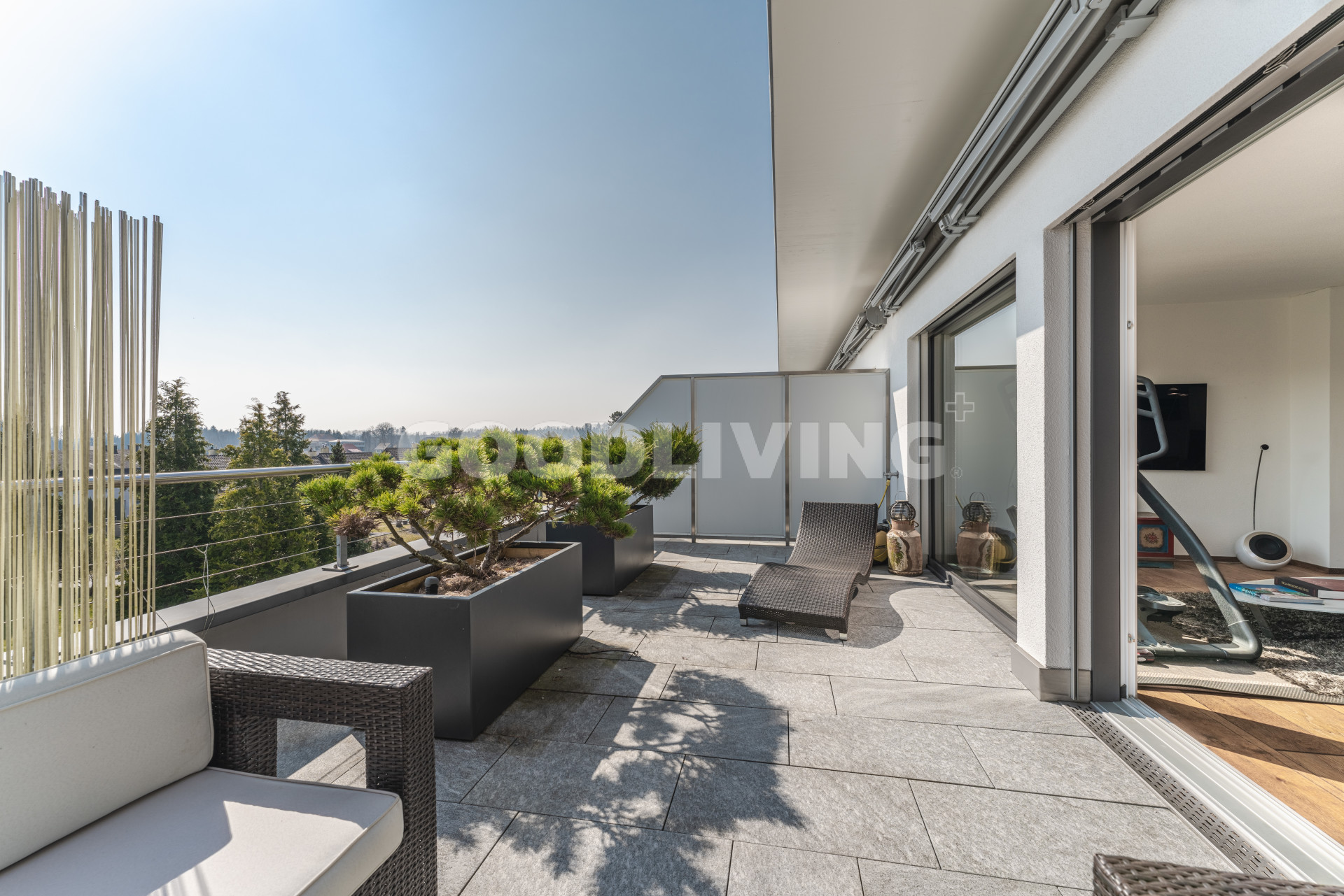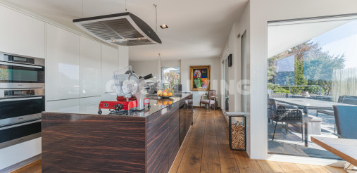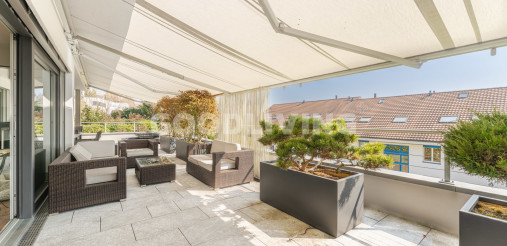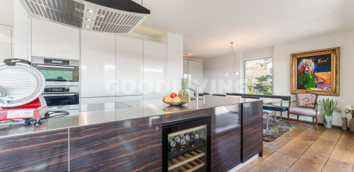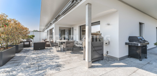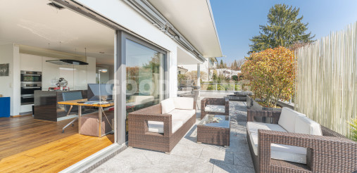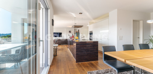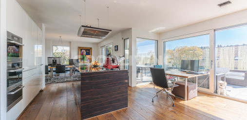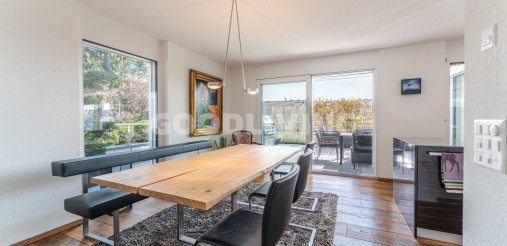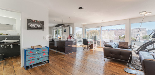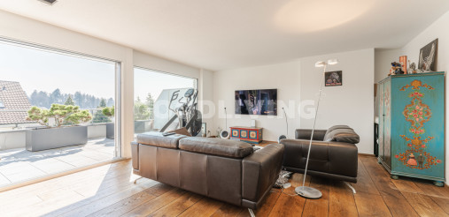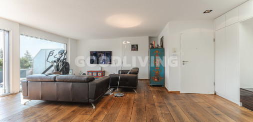 Hochwertige und stilvolle 2½ Zimmer Attikawohnung umgeben von viel Grün mit grosszügiger Terrasse für Pärchen oder Singles. Die attraktive Attikawohnung mit offener Küche und exklusiver Kochinsel inkl. eingebautem Miele Weinkühler wurde ursprünglich als «4½ Zimmerwohnung» konzipiert. Die massgeschneiderten Einbauschränke im Eingangs- und Küchenbereich wirken schlicht und bieten viel Stauraum. Die Liegenschaft überzeugt mit einem offenem sowie gut durchdachten Grundrisskonzept, welches perfekt mit der grossen und südlich ausgerichteten Terrasse (80m²) harmonisiert. Die Wohnung repräsentiert einen hochwertigen Ausbaustandard mit exklusiven Materialien und einstellbaren Spotlampen. Alles in allem haben die Personalisierungen Mehrkosten von über CHF 100'000.- ausgemacht. Zudem befindet sich die Liegenschaft in einem sehr neuwertigen und gepflegten Zustand. Alle Räume sind bodenbeheizt (Erdsonde) und können separat reguliert werden. Ebenfalls sind sämtliche Lamellenstoren sowie die zwei grossen Terrassendach-Markisen (mit Fernbedienung) elektrisch regulierbar und tragen zur wohnlichen Lebensqualität bei.