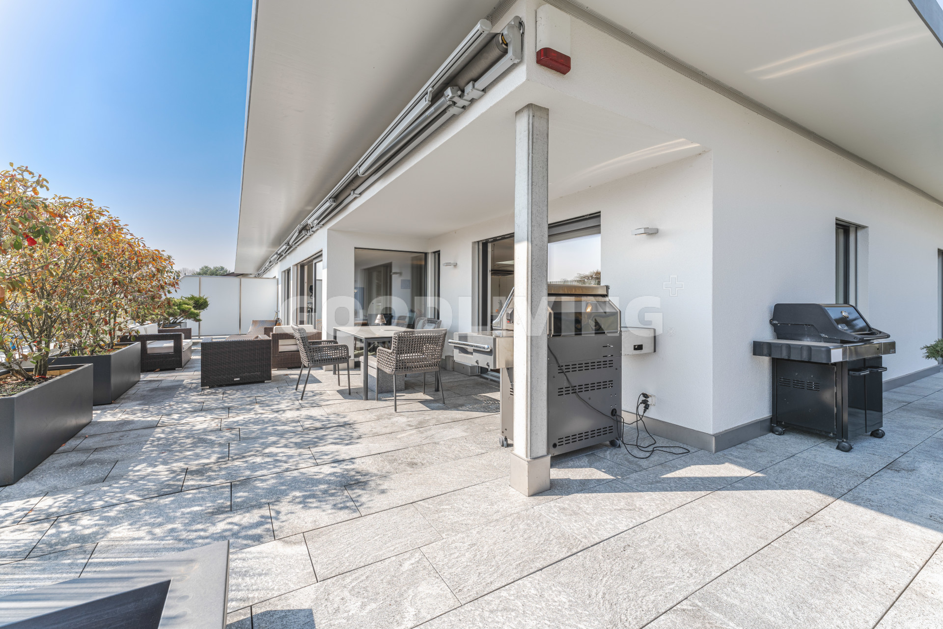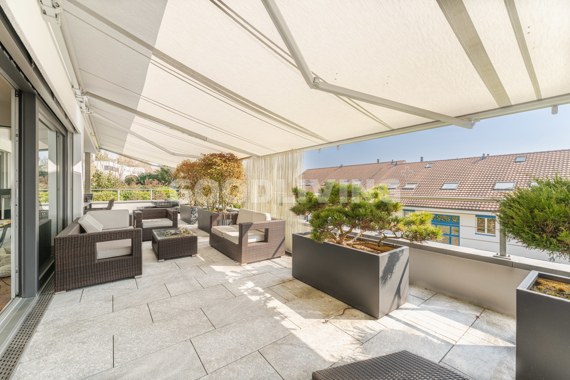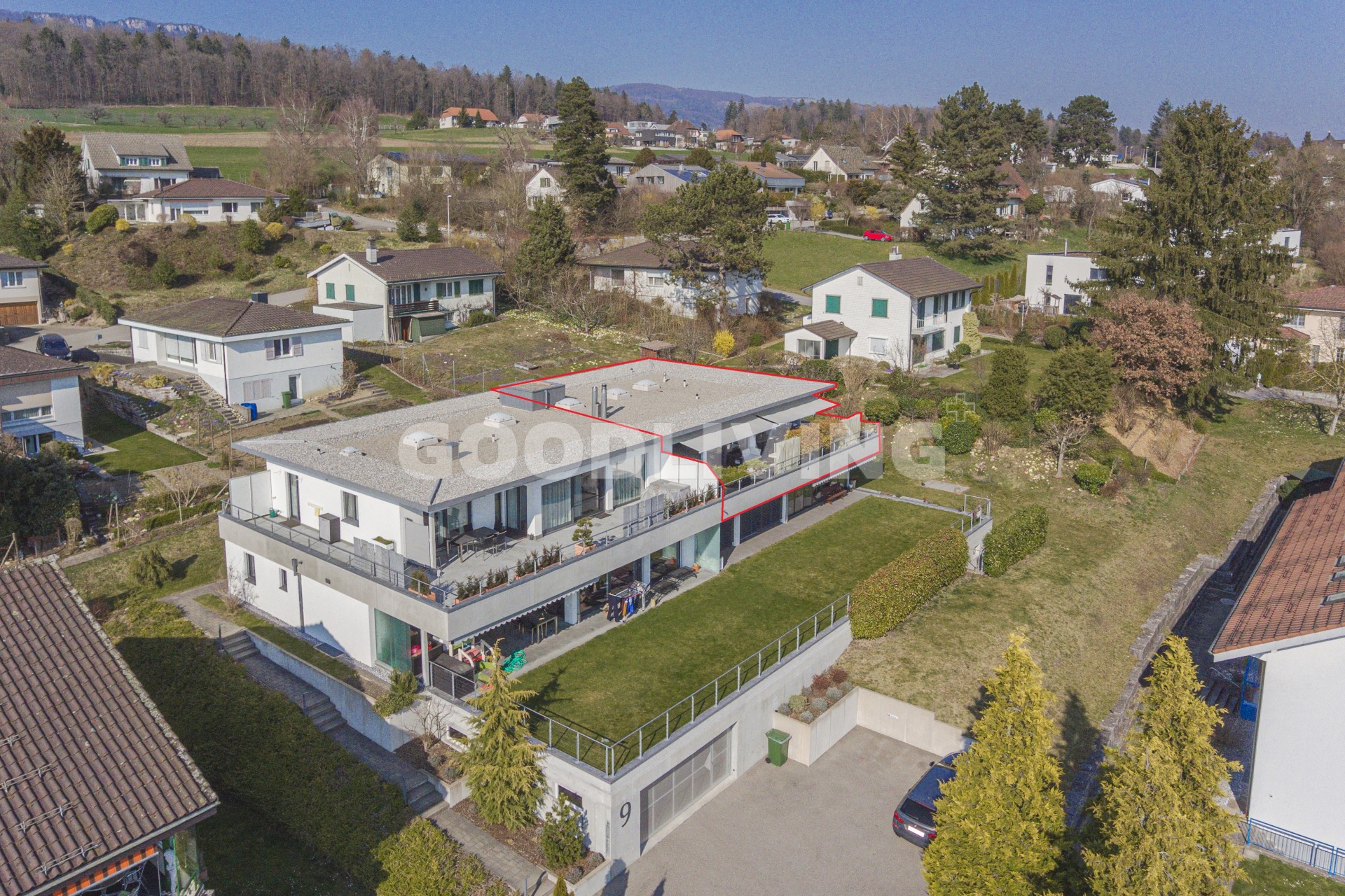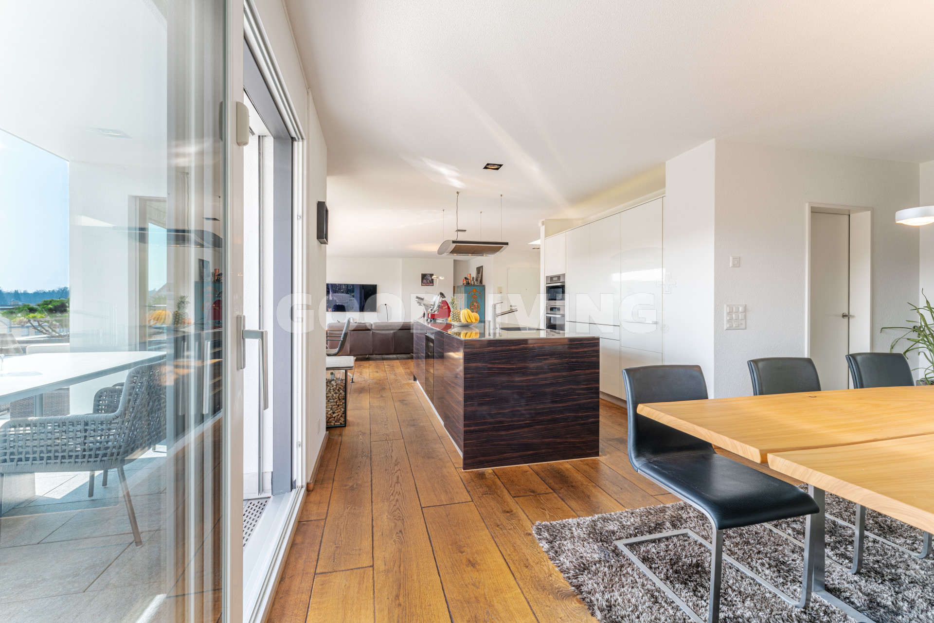 Hochwertige und stilvolle 2½ Zimmer Attikawohnung umgeben von viel Grün mit grosszügiger Terrasse für Pärchen oder Singles. Die attraktive Attikawohnung mit offener Küche und exklusiver Kochinsel inkl. eingebautem Miele Weinkühler wurde ursprünglich als «4½ Zimmerwohnung» konzipiert. Die massgeschneiderten Einbauschränke im Eingangs- und Küchenbereich wirken schlicht und bieten viel Stauraum. Die Liegenschaft überzeugt mit einem offenem sowie gut durchdachten Grundrisskonzept, welches perfekt mit der grossen und südlich ausgerichteten Terrasse (80m²) harmonisiert. Die Wohnung repräsentiert einen hochwertigen Ausbaustandard mit exklusiven Materialien und einstellbaren Spotlampen. Alles in allem haben die Personalisierungen Mehrkosten von über CHF 100'000.- ausgemacht. Zudem befindet sich die Liegenschaft in einem sehr neuwertigen und gepflegten Zustand. Alle Räume sind bodenbeheizt (Erdsonde) und können separat reguliert werden. Ebenfalls sind sämtliche Lamellenstoren sowie die zwei grossen Terrassendach-Markisen (mit Fernbedienung) elektrisch regulierbar und tragen zur wohnlichen Lebensqualität bei.