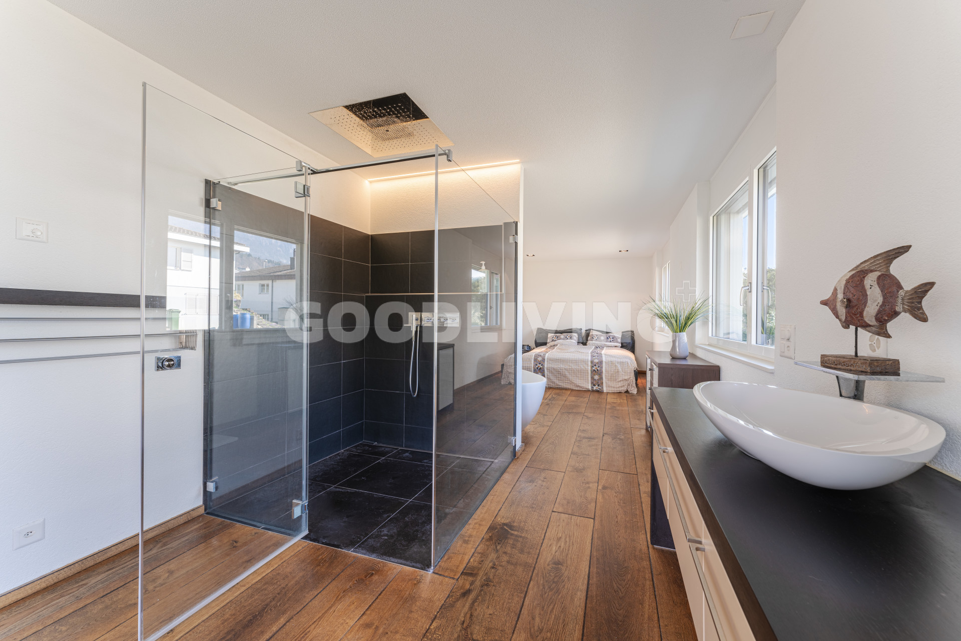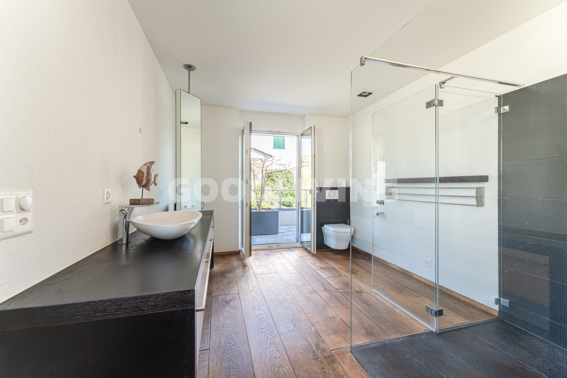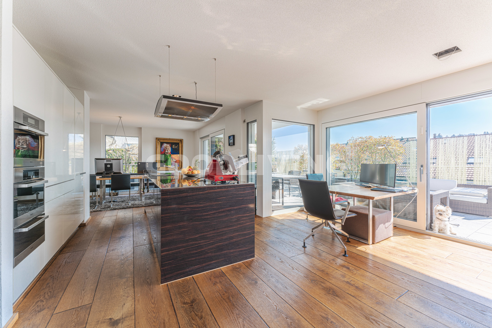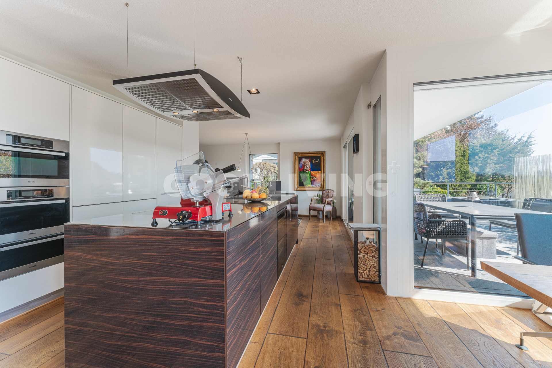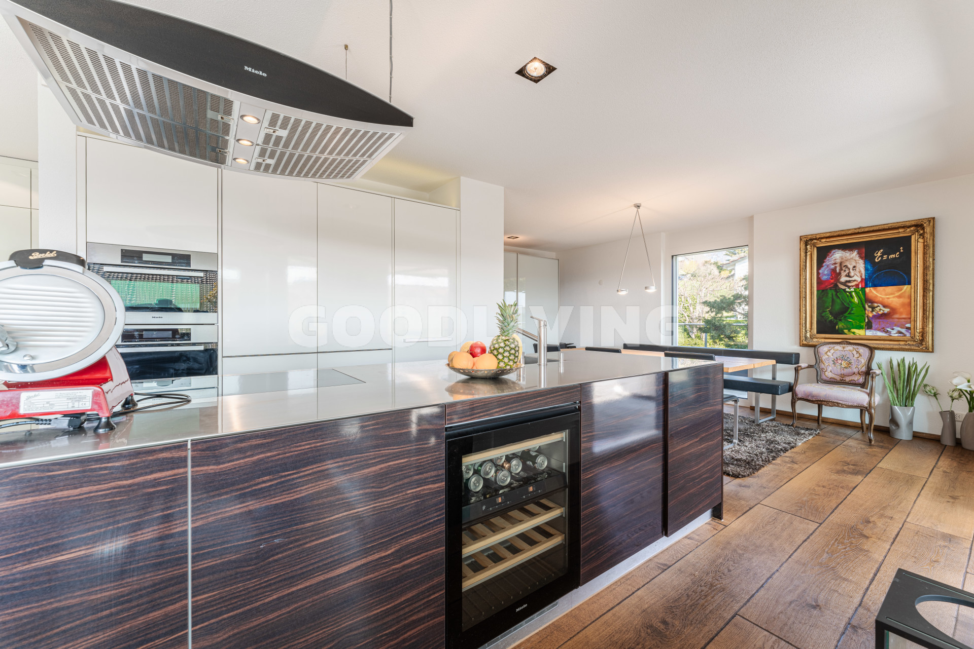 Die Attikawohnung befindet sich vom Haupteingang aus gesehen im ersten Obergeschoss, ist mit dem Lift oder über das Treppenhaus ganz bequem erreichbar und befindet sich in einem sehr neuwertigen Zustand. Vom Eingangsbereich aus gelangt man in das offene Wohn- und Esszimmer mit bodentiefen Schiebefenstern (alle Fenster sind dreifach isolierverglast und verfügen über eine Schall- und Wärmedämmung). Dabei fällt der edle und handgefertigte Mewi-Schlossdielenparkettboden (Eiche) sofort auf, welcher in allen Räumlichkeiten verlegt wurde- ein Boden der Superlative! Die attraktive Küche mit Kochinsel ist mit einem flächenbündigen Induktionskochherd, einer leistungsstarken Umluft-Dunstabzugshaube, einem Mikrowellen-Umluftbackofen, einem Steamer, einer Wärmeschublade, einem Geschirrspüler sowie einem Weinkühler der Marke Miele ausgestattet. Die Küchenarbeitsplatte mit Spülbecken besteht aus einem Stück massivem Inox Edelstahl der Marke Suter. Das grosse Zimmer ist mit einem freistehenden Bad im organischen Design und einer separaten Regendusche der Linie Axor Massaud ausgestattet. Im Gäste-WC und im Eingangsbereich sorgen die Lichtkuppeln für helle Räume. Im Wohnzimmer ist ausserdem der Ausbau eines Cheminées vorbereitet. Im Aussenbereich wurde auf über 80m² robuste Tessiner Granitplatten verlegt.