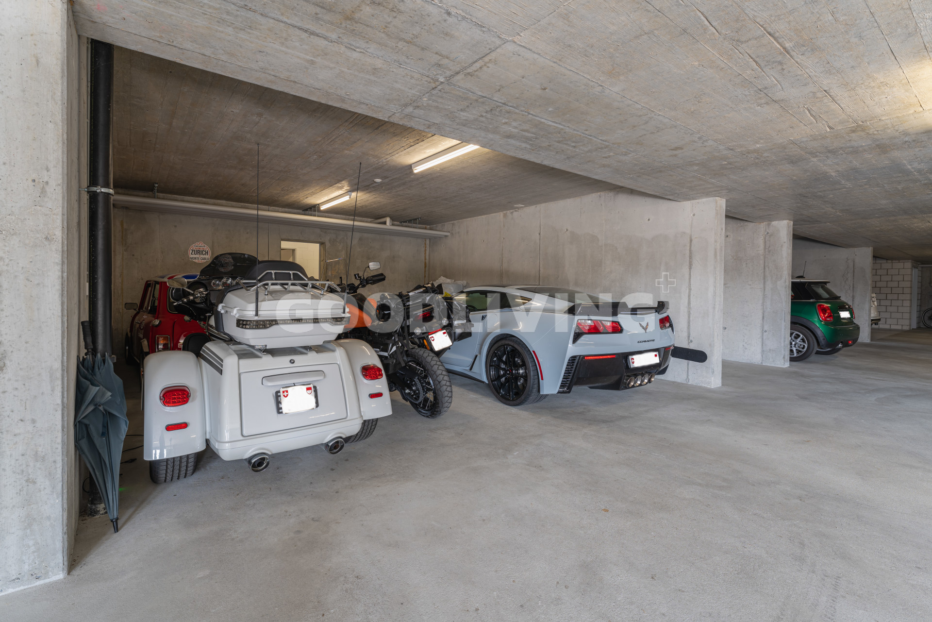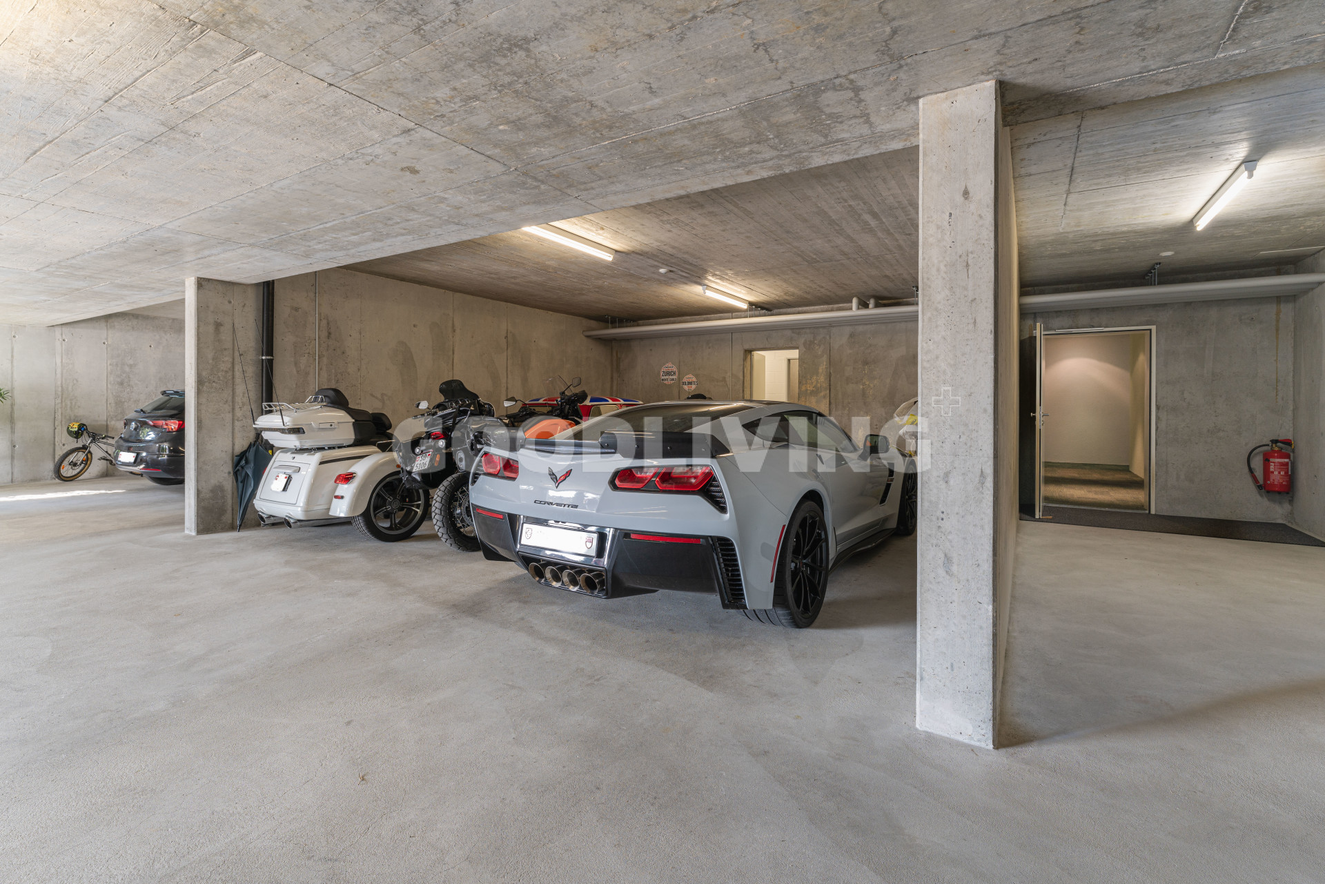 Zuzüglich zwei grosse Einstellhallenplätze (34.5m²) für je CHF 30'000.- (nebeneinander).