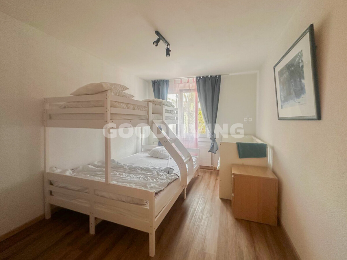 Das Obergeschoss ist ganz der Familie gewidmet: drei Schlafzimmer, ein begehbarer Kleiderschrank, ein separates Kinderbad sowie ein grosszügiges Badezimmer mit Doppellavabo und neuer Badewanne bieten Komfort und Privatsphäre für jeden Lebensabschnitt.