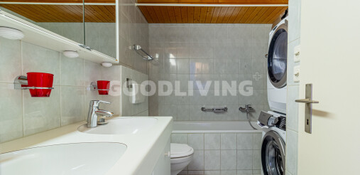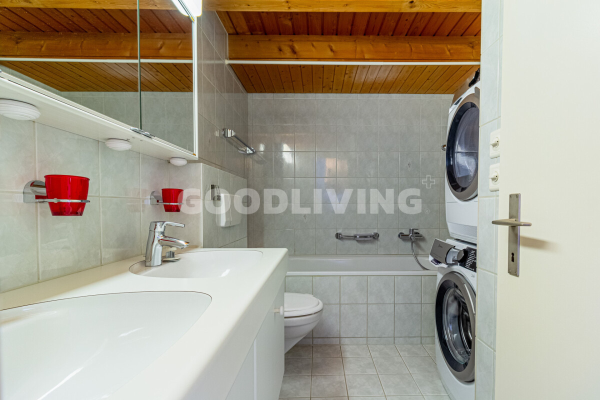 Der Wohnbereich mit schönem Parkettboden und Cheminée lädt zu entspannten Stunden ein und verleiht der Wohnung eine warme Wohlfühlatmosphäre. Die Küche ist praktisch ausgestattet und bietet viel Stauraum. Das Badezimmer verfügt über einen eigenen Waschturm, was zusätzlichen Komfort im Alltag schafft.