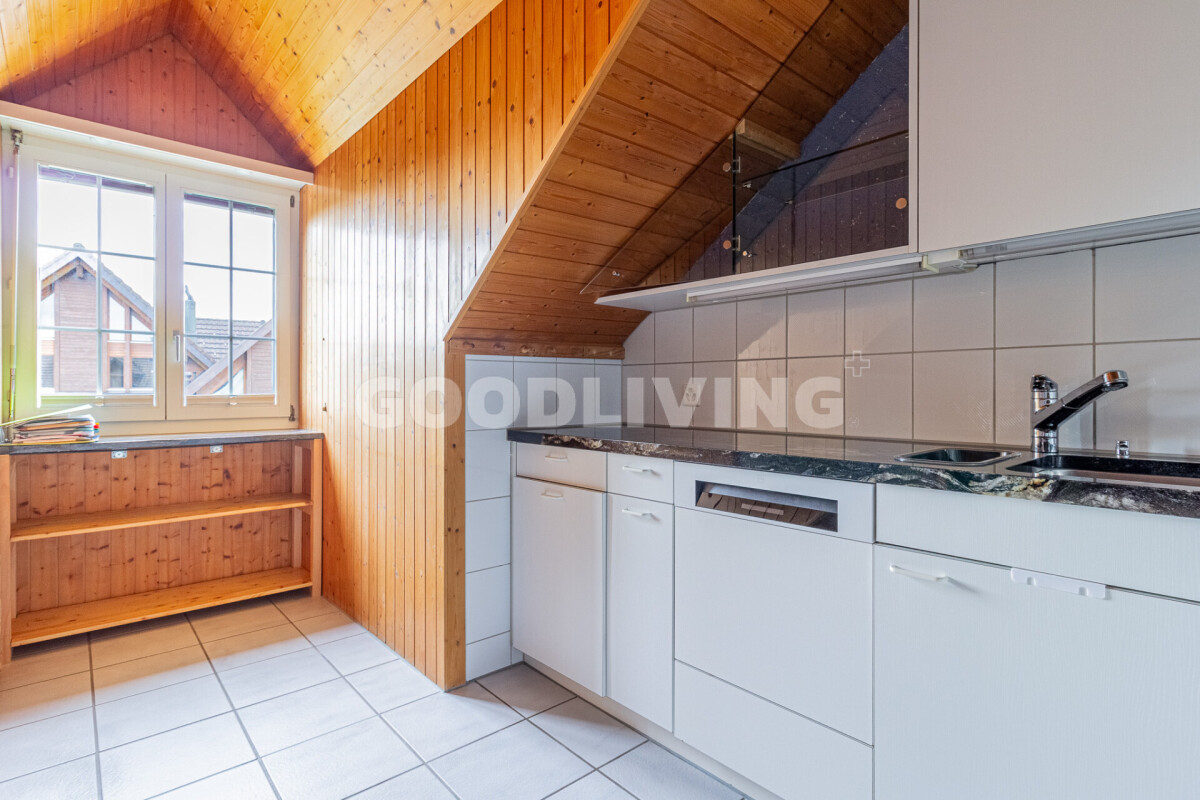Diese helle und gemütliche Dachwohnung besticht durch ihren besonderen Charme, eine offene Wohnatmosphäre und die Kombination aus Holzverkleidung und modernen Elementen.