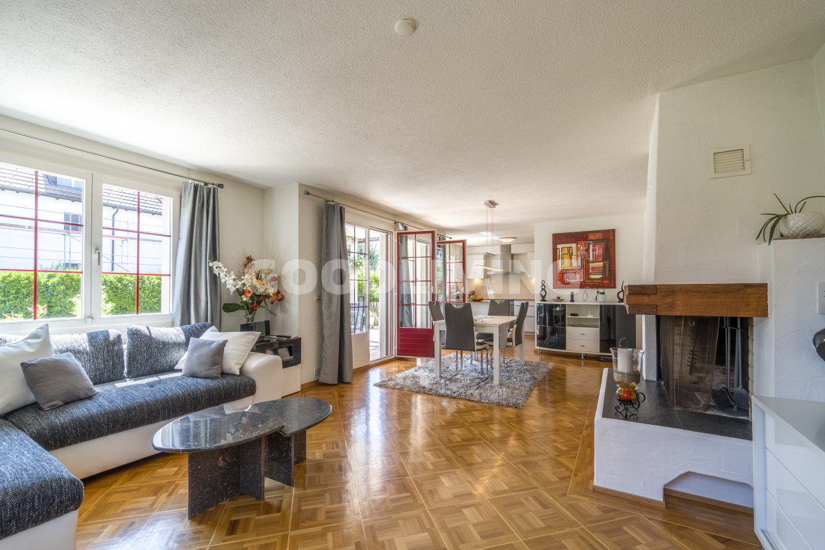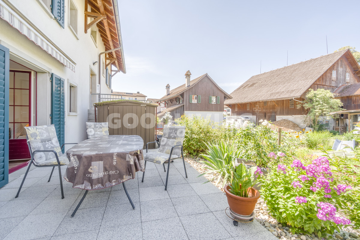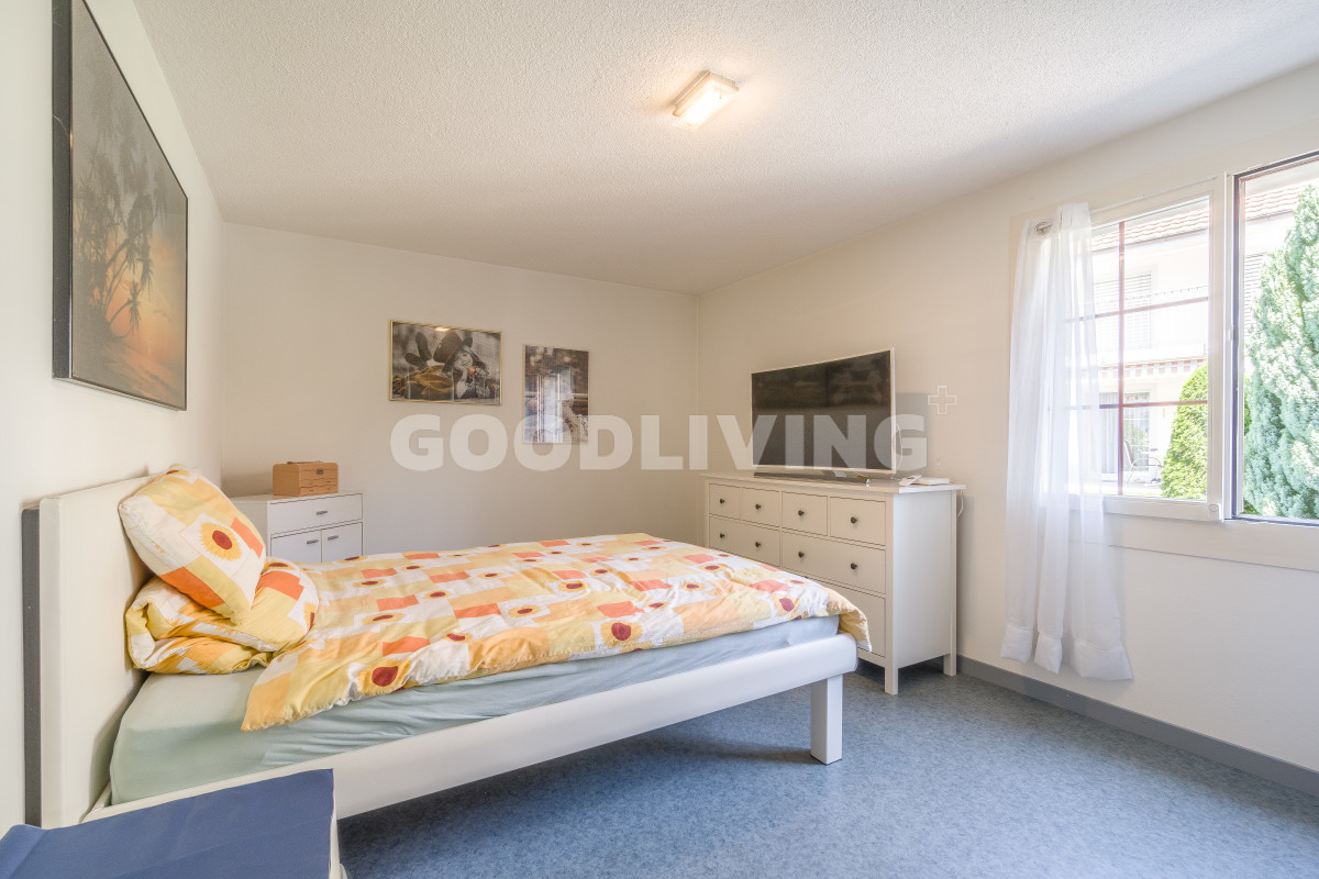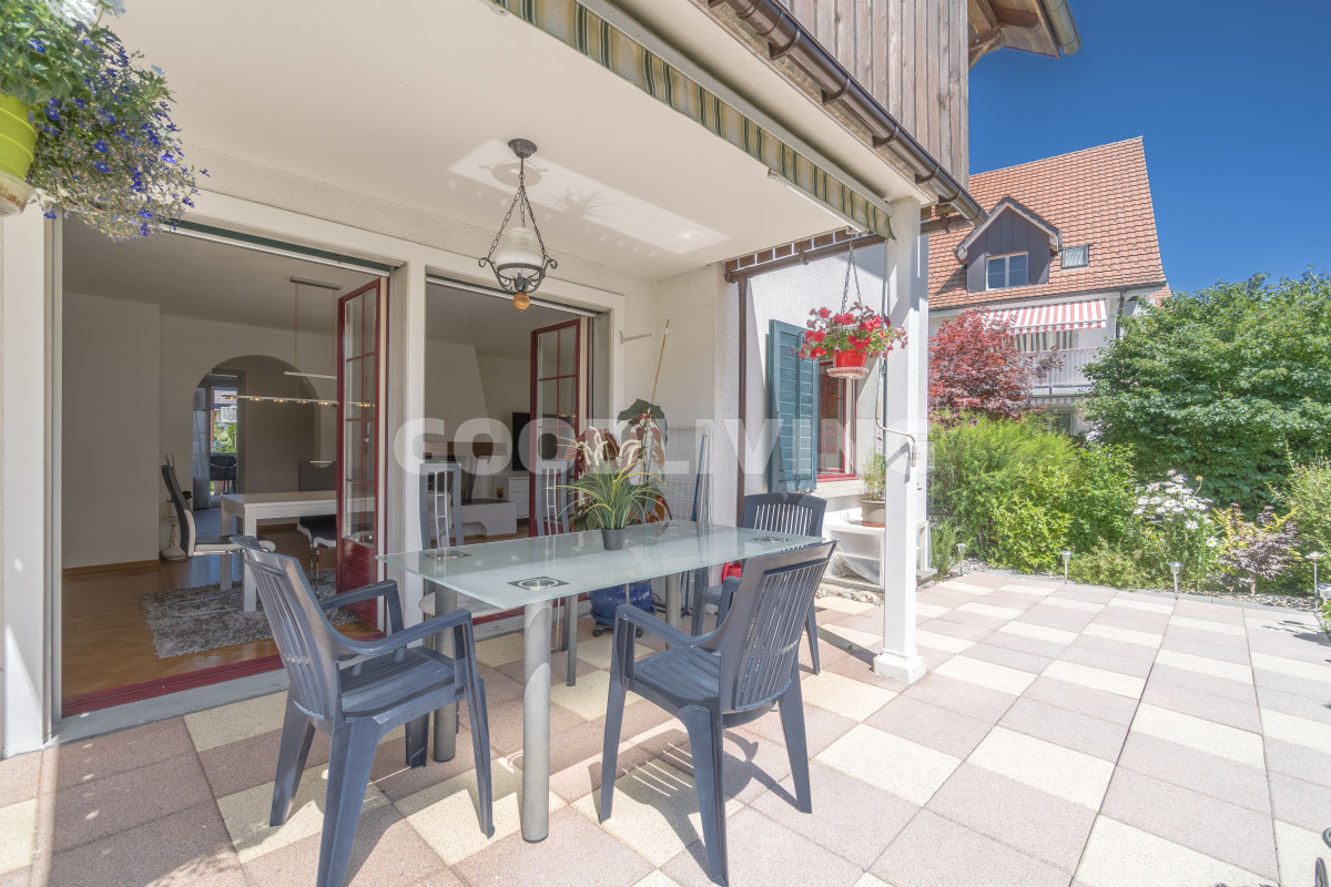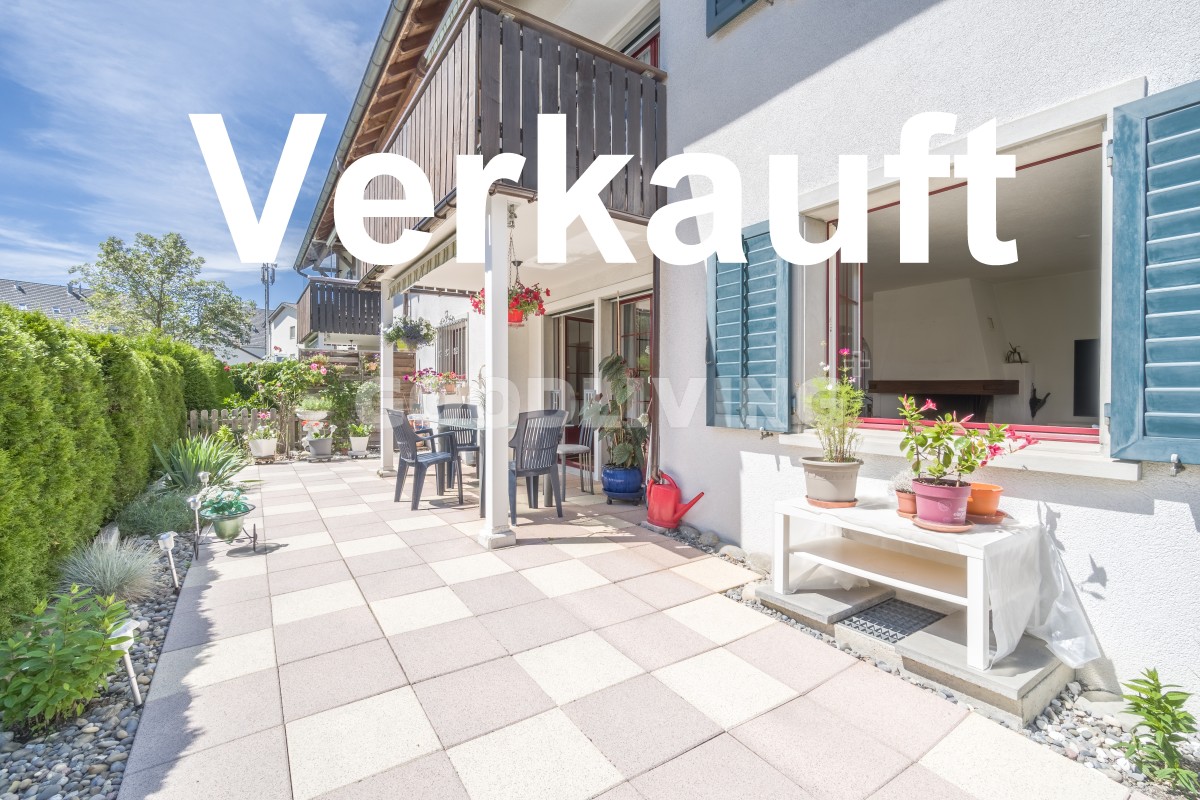 Die charmante 3½ Zimmer Wohnung überzeugt mit einem offenen Grundriss, viel Privatsphäre und einem teils gedeckten und gut besonntem Aussenbereich von über 90m² Fläche. Der Hauszugang liegt etwas erhöht zum Erdgeschoss und ist über die Aussentreppe erreichbar. Über die Innentreppe des Hauses gelangt man zur schönen und gemütlichen Gartenwohnung. Vom Eingangsbereich aus gelangt man in das offene 32 m² grosse Wohn- Esszimmer, welcher mit einer praktischen und einladenden Warmluft- Cheminée ausgestattet ist und Charme in die Räumlichkeiten verleiht. Die halboffene Küche mit Granit-Arbeitsplatten ist praktisch eingerichtet und mit einem Umluftbackofen und einem Geschirrspüler ausgestattet. Die Küche wurde im 2010 für CHF 30'000.- erneuert. Das Reduit (mit einer Miele Waschmaschine von 2009) ist über die Küche erreichbar. Über das kleine Zimmer (Vinylboden), gelangt man zum grossen westlich gerichteten Sitzplatz. Der östlich gerichtete Sitzplatz ist über das Wohnzimmer erreichbar. Die beiden Nasszellen mit hochwertigen keramischen Bodenplatten, welche mit einer begehbaren Dusche ausgestattet sind, wurden im 2012 und 2015 für ca. CHF 18'000.- erneuert. Im Entrée, Wohn/ Essbereich und in der Küche wurde ein Parkettboden verlegt. Alle Räume sind bodenbeheizt und können separat reguliert werden. Die Gasheizung wurde im 2020 ersetzt. Das grosse Schlafzimmer (PVC Boden), der Keller (9 m²), Veloraum und ein Tiefgaragenplatz für CHF 30'000.- runden dieses ansprechende Angebot ab.