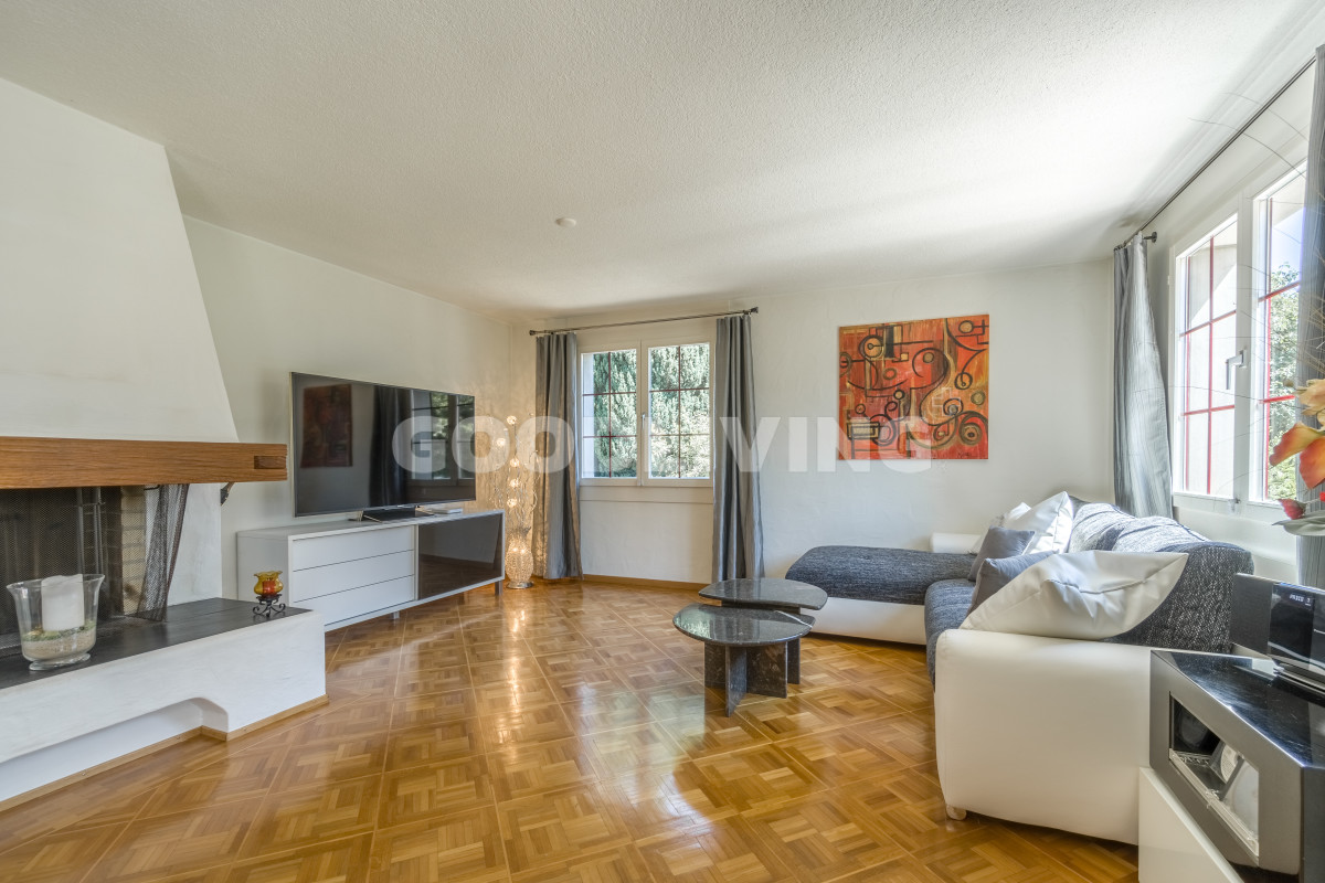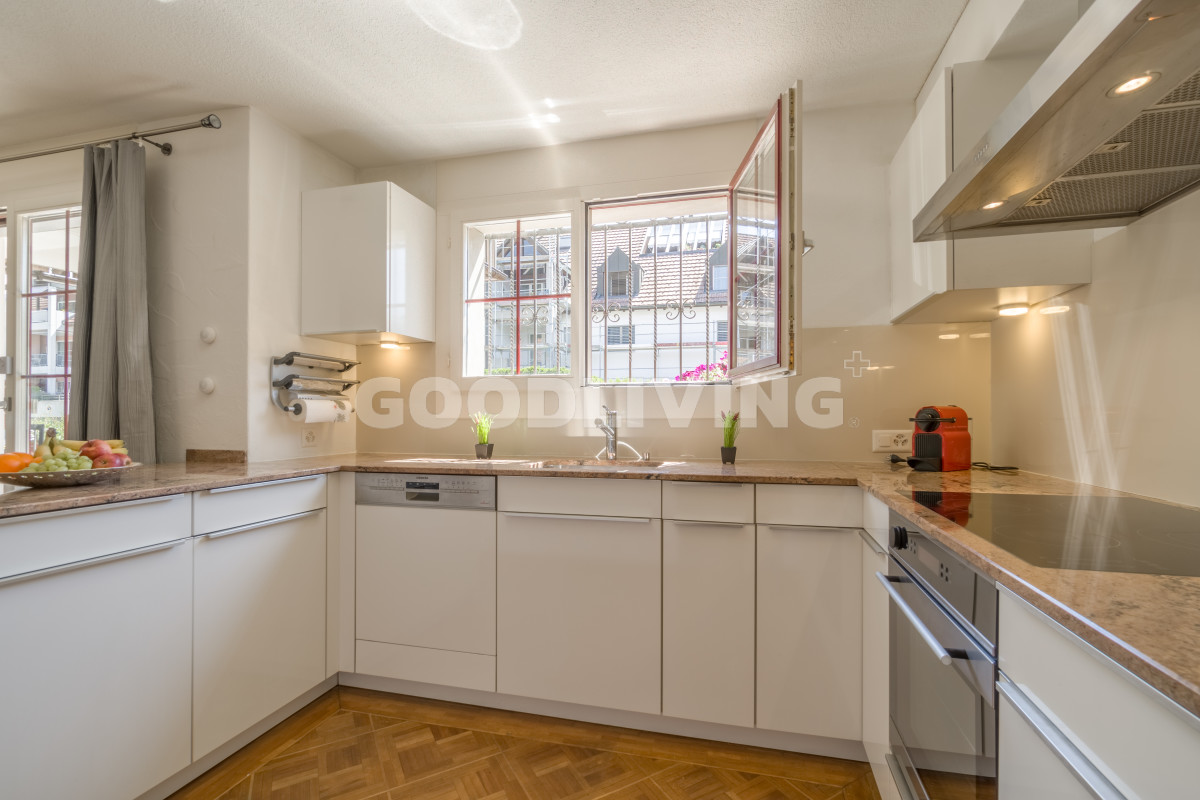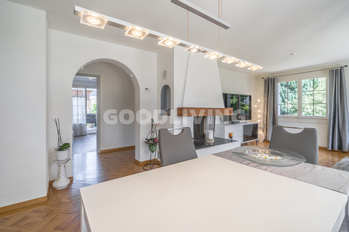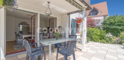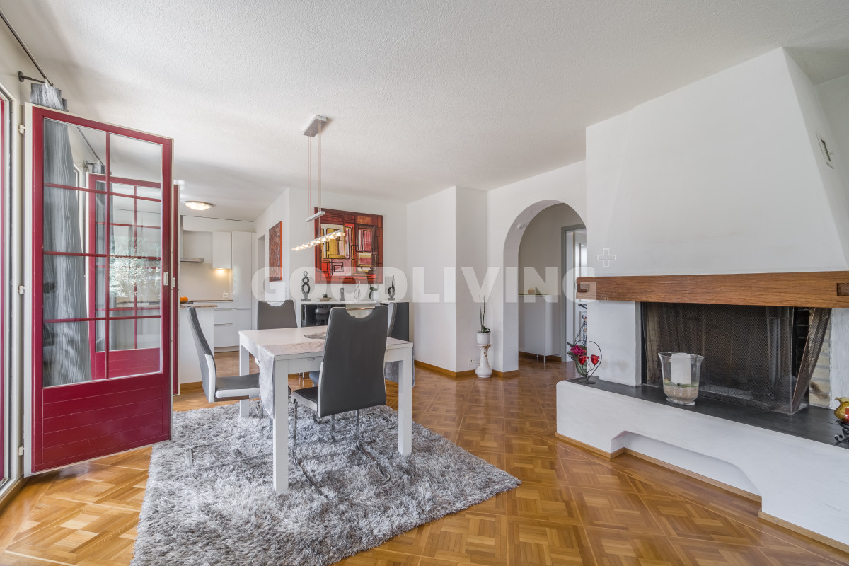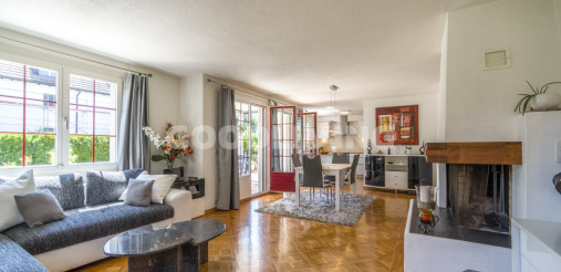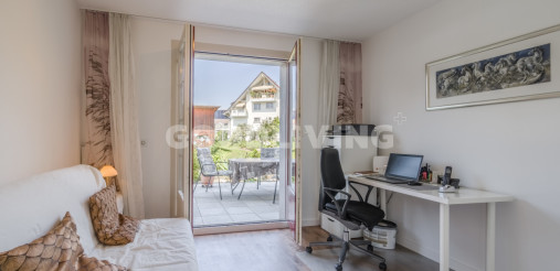 Die charmante 3½ Zimmer Wohnung überzeugt mit einem offenen Grundriss, viel Privatsphäre und einem teils gedeckten und gut besonntem Aussenbereich von über 90m² Fläche. Der Hauszugang liegt etwas erhöht zum Erdgeschoss und ist über die Aussentreppe erreichbar. Über die Innentreppe des Hauses gelangt man zur schönen und gemütlichen Gartenwohnung. Vom Eingangsbereich aus gelangt man in das offene 32 m² grosse Wohn- Esszimmer, welcher mit einer praktischen und einladenden Warmluft- Cheminée ausgestattet ist und Charme in die Räumlichkeiten verleiht. Die halboffene Küche mit Granit-Arbeitsplatten ist praktisch eingerichtet und mit einem Umluftbackofen und einem Geschirrspüler ausgestattet. Die Küche wurde im 2010 für CHF 30'000.- erneuert. Das Reduit (mit einer Miele Waschmaschine von 2009) ist über die Küche erreichbar. Über das kleine Zimmer (Vinylboden), gelangt man zum grossen westlich gerichteten Sitzplatz. Der östlich gerichtete Sitzplatz ist über das Wohnzimmer erreichbar. Die beiden Nasszellen mit hochwertigen keramischen Bodenplatten, welche mit einer begehbaren Dusche ausgestattet sind, wurden im 2012 und 2015 für ca. CHF 18'000.- erneuert. Im Entrée, Wohn/ Essbereich und in der Küche wurde ein Parkettboden verlegt. Alle Räume sind bodenbeheizt und können separat reguliert werden. Die Gasheizung wurde im 2020 ersetzt. Das grosse Schlafzimmer (PVC Boden), der Keller (9 m²), Veloraum und ein Tiefgaragenplatz für CHF 30'000.- runden dieses ansprechende Angebot ab.