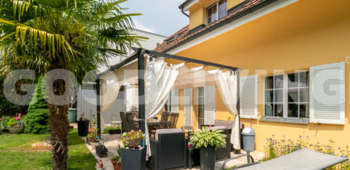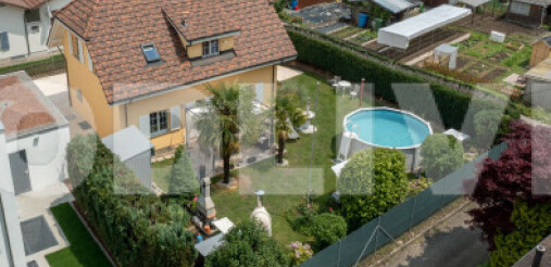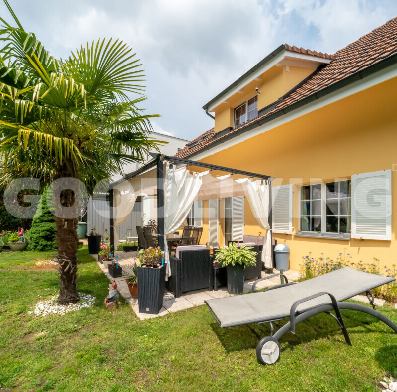 Bereits der Aussenbereich begeistert mit einem grosszügigen Garten, Palmen, einem einladenden Pool, Aussengrill sowie einem gemütlichen Sitzplatz. Ob ruhige Stunden oder gesellige Abende mit Familie und Freunden, hier wird der Alltag zur Auszeit.
