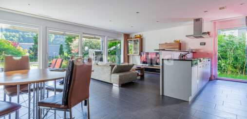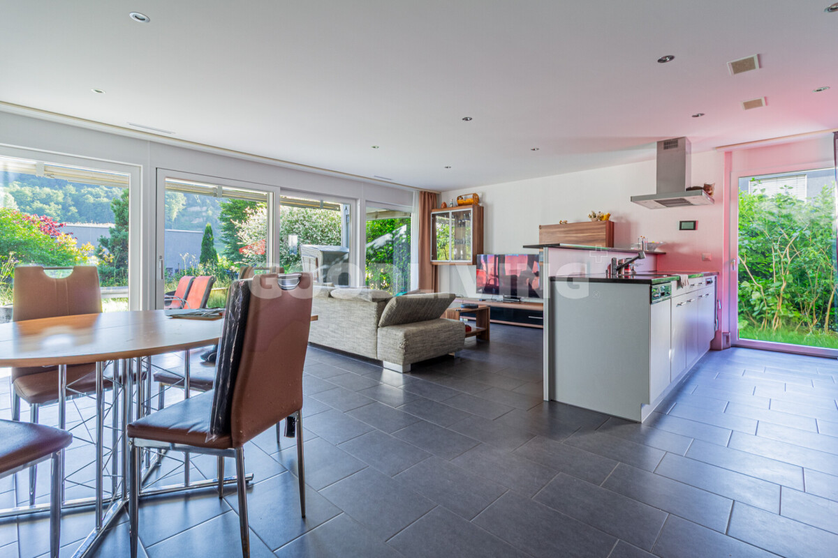 + Grosszügiger Wohnbereich mit grossen Fensterfronten und keramischen Bodenplatten