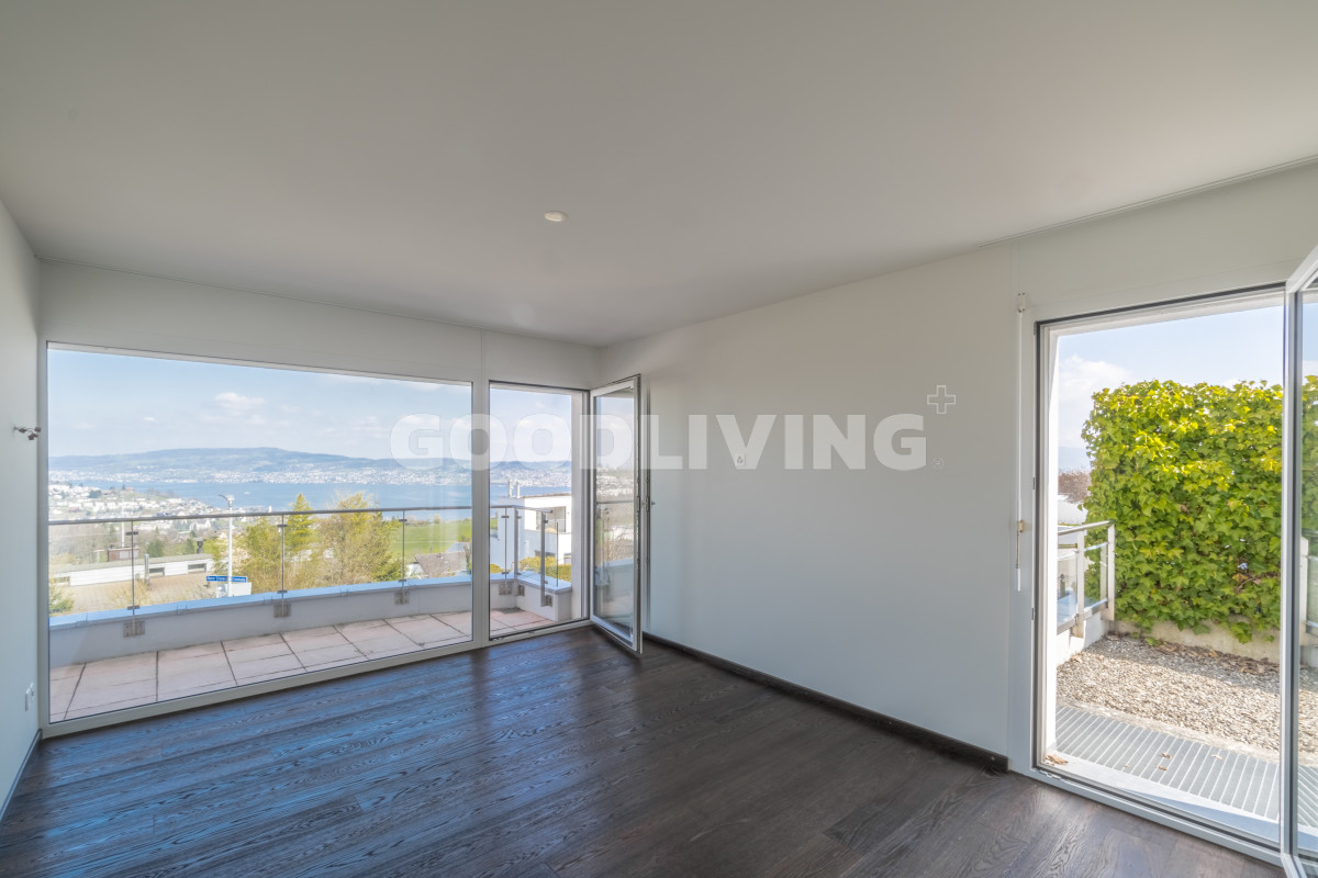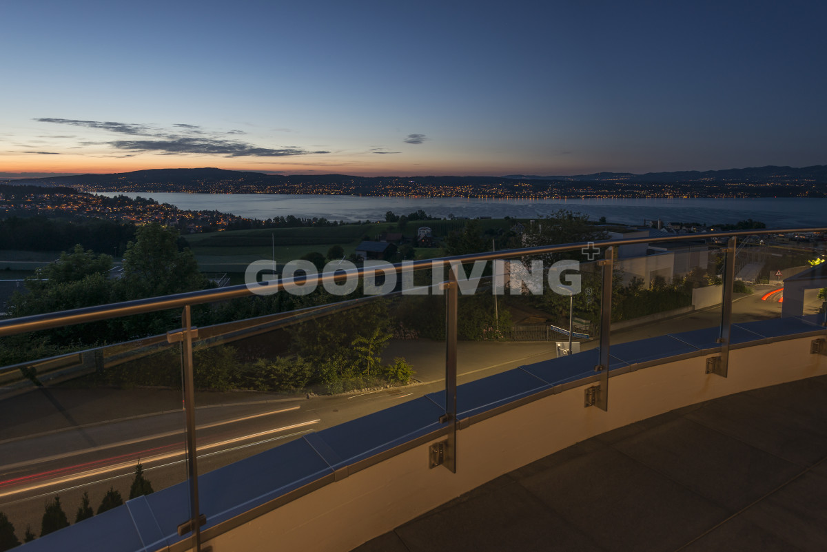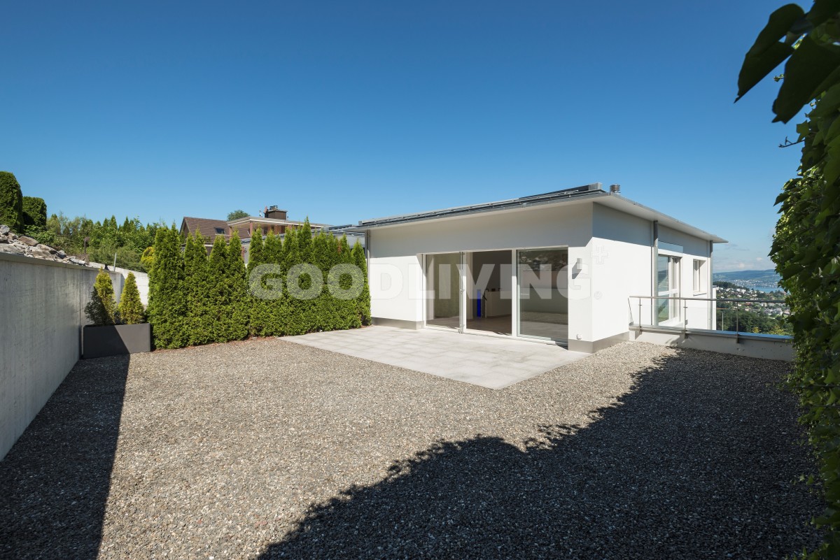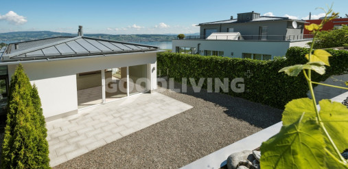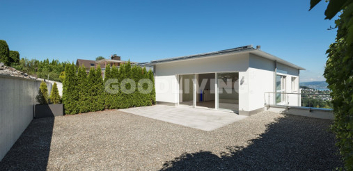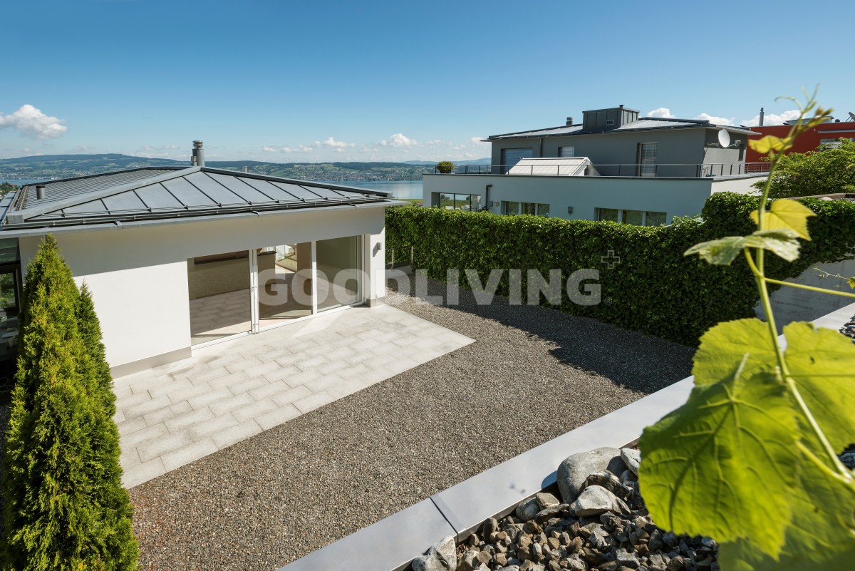 Erstklassiges und traumhaftes 4½ Zimmer Einfamilienhaus an bevorzugter Toplage besticht durch eine unverbaubare Seesicht und Weitsicht zu den Alpen. Auf den gemütlichen und grossen Gartenterrassen (ca. 73m² und 24m²) welche auf zwei Ebenen erstellt wurden, kann man die Zeit im Aussenbereich in vollen Zügen geniessen. Die gediegene sowie gut besonnte obere Terrasse (73m²) lädt zum verweilen ein und ist mit einer elektrischen Sonnenmarkise ausgestattet. Auf der oberen Gartenterrasse besteht die Möglichkeit beide Terrassen zusammen zu fügen. Somit hätte man genug Platz für einen grossen Swimmingpool.