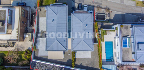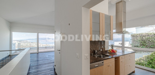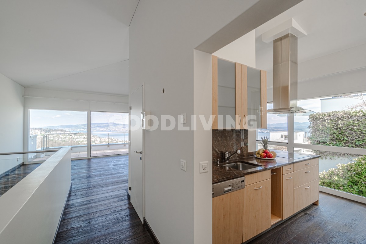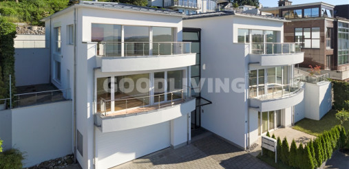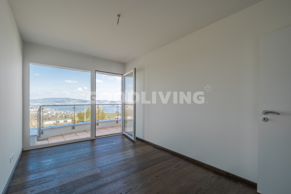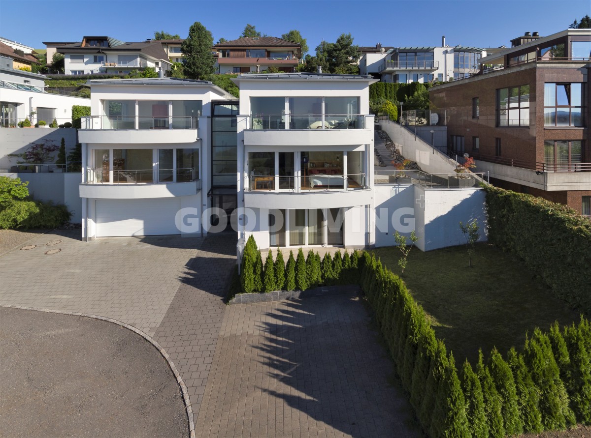 Dieses erstklassige und exklusive 4½ Zimmer Haus an privilegierter Toplage überzeugt mit einem offenem Grundrisskonzept und bietet viel Platz für die ganze Familie. Vom gemeinsamen und hochwertig verglasten Treppenhaus gelangt man direkt zu den Wohneinheiten und zur Doppelgarage. Über die mittlere Ebene erreicht man das 4½ Zimmer Haus. Im Eingangsbereich befinden sich grosszügige Einbauschränke, eine Garderobe und der Treppenaufgang zur oberen Ebene mit offener Galerie. Im ganzen Haus wurde ein hochwertiger Landhausdielen Parkettboden verlegt. Zudem ist die Gartenterrasse (ca. 24m²) von zwei Zimmern aus erreichbar. Das grosse Bad, die zwei Zimmer (Wanddurchbruch möglich) mit herrlicher Seesicht, der Zugang zum Sitzplatz und der Waschraum runden das Raumprogramm in dieser unteren Ebene ab.
