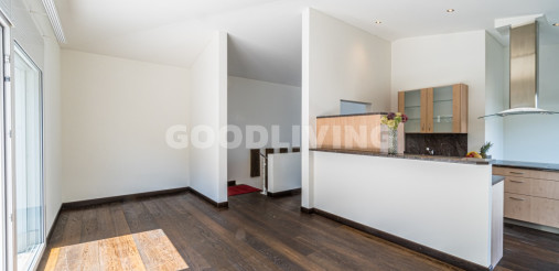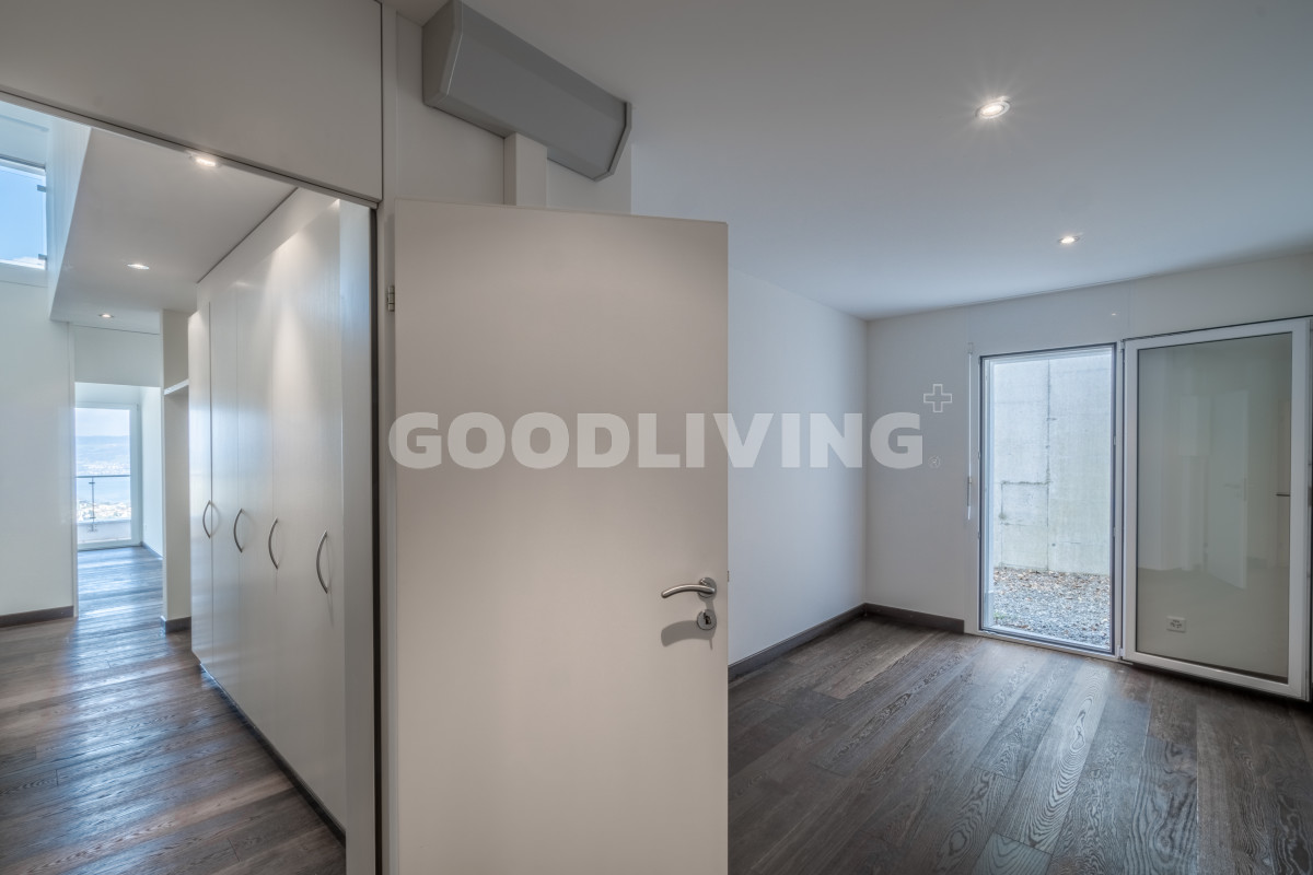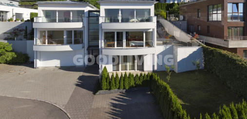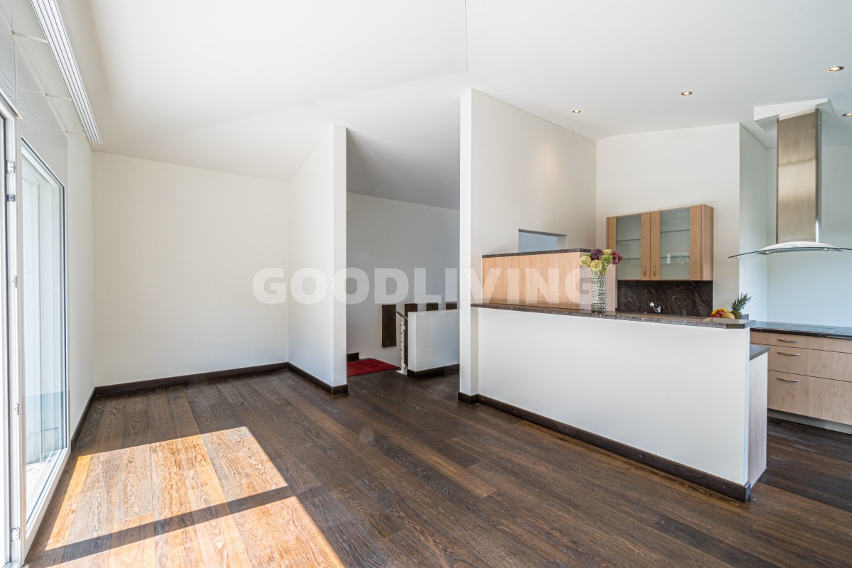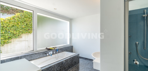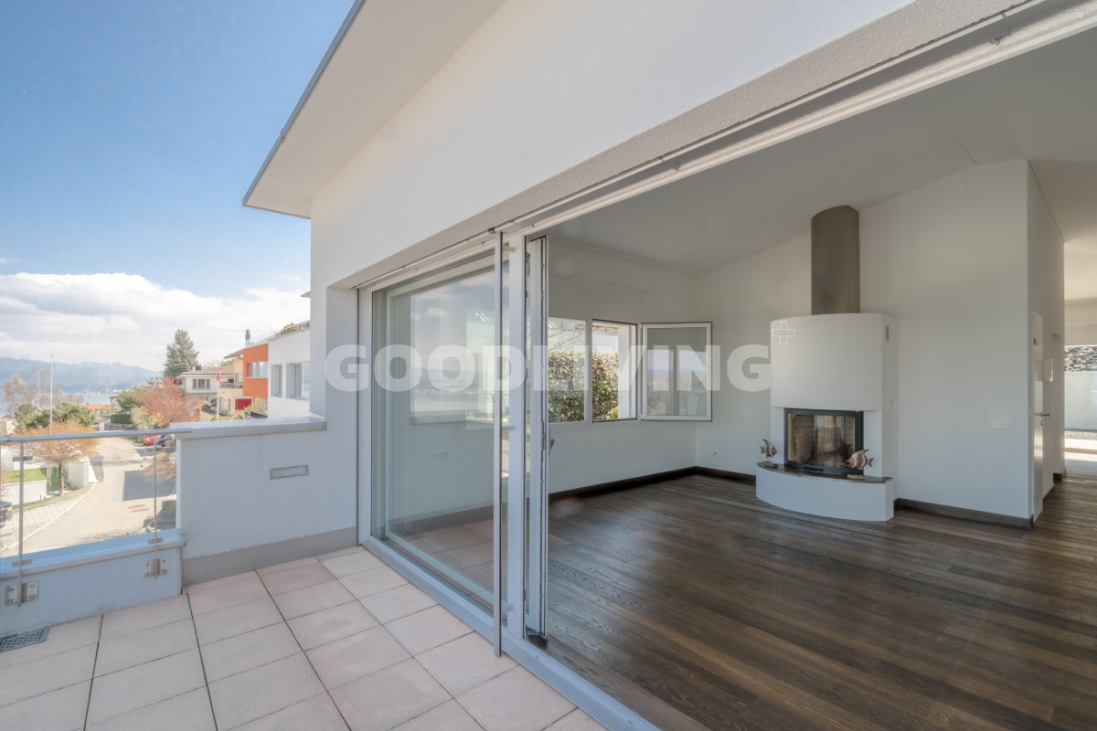 Dieses erstklassige und exklusive 4½ Zimmer Haus an privilegierter Toplage überzeugt mit einem offenem Grundrisskonzept und bietet viel Platz für die ganze Familie. Vom gemeinsamen und hochwertig verglasten Treppenhaus gelangt man direkt zu den Wohneinheiten und zur Doppelgarage. Über die mittlere Ebene erreicht man das 4½ Zimmer Haus. Im Eingangsbereich befinden sich grosszügige Einbauschränke, eine Garderobe und der Treppenaufgang zur oberen Ebene mit offener Galerie. Im ganzen Haus wurde ein hochwertiger Landhausdielen Parkettboden verlegt. Zudem ist die Gartenterrasse (ca. 24m²) von zwei Zimmern aus erreichbar. Das grosse Bad, die zwei Zimmer (Wanddurchbruch möglich) mit herrlicher Seesicht, der Zugang zum Sitzplatz und der Waschraum runden das Raumprogramm in dieser unteren Ebene ab.