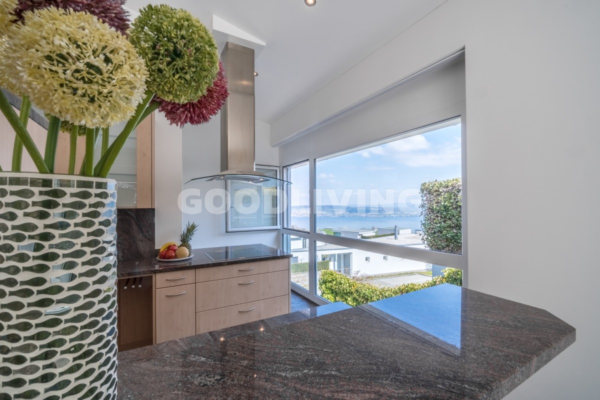 In der oberen Ebene fallen die sehr hohen Wohnräume, das Cheminée und der Ausblick auf den See sofort auf. Die komfortable Küche (V-Zug Geräte) mit hochwertigen Granit Arbeitsplatten ist mit einem Glaskeramik Kochfeld, Combi-Steamer (Umluftbackofen & Steamer), neuem Kühlschrank mit Tiefkühlfächer, Mikrowelle und einem Geschirrspüler der Marke Miele ausgestattet. Das Gäste WC sowie die gediegene und gut besonnte Gartenterrasse (73m²) befinden sich ebenfalls auf dieser Ebene. Die Doppelgarage mit einem Aussenparkplatz und der grosse Keller runden dieses ansprechende Angebot ab.