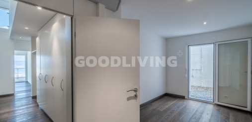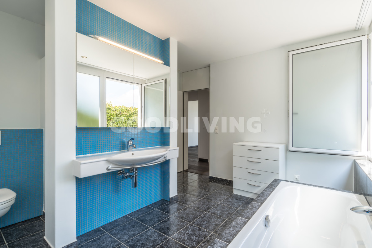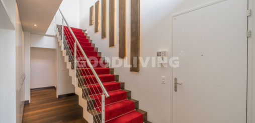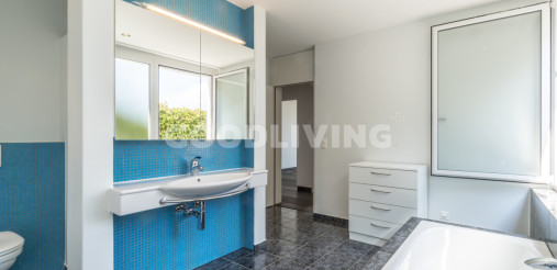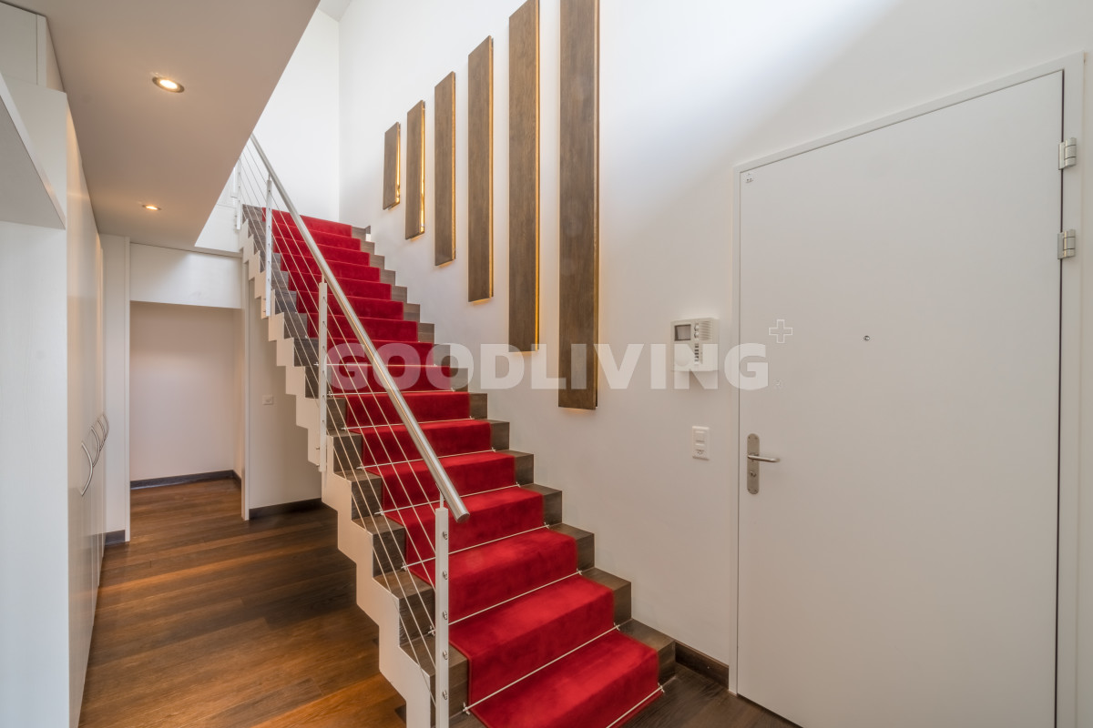 Die hohen Wohnräume (mittlere Ebene 2.50 Meter und obere Ebene über 4 Meter) und die grosszügige Raumaufteilung ermöglichen eine stimmungsvolle Einrichtung. Die wundervolle Weitsicht, der Blick zum See sind atemberaubend und von jedem Geschoss aus garantiert. Ausserdem besteht die Möglichkeit die Immobilie mit einem zusätzlichen Dachstock und einem Lift auszubauen. Das attraktive Haus ist in zwei Etagen aufgeteilt auf einer Grundstücksfläche von 307m². Das hochwertig verglaste Treppenhaus teilt man mit dem Haus A.